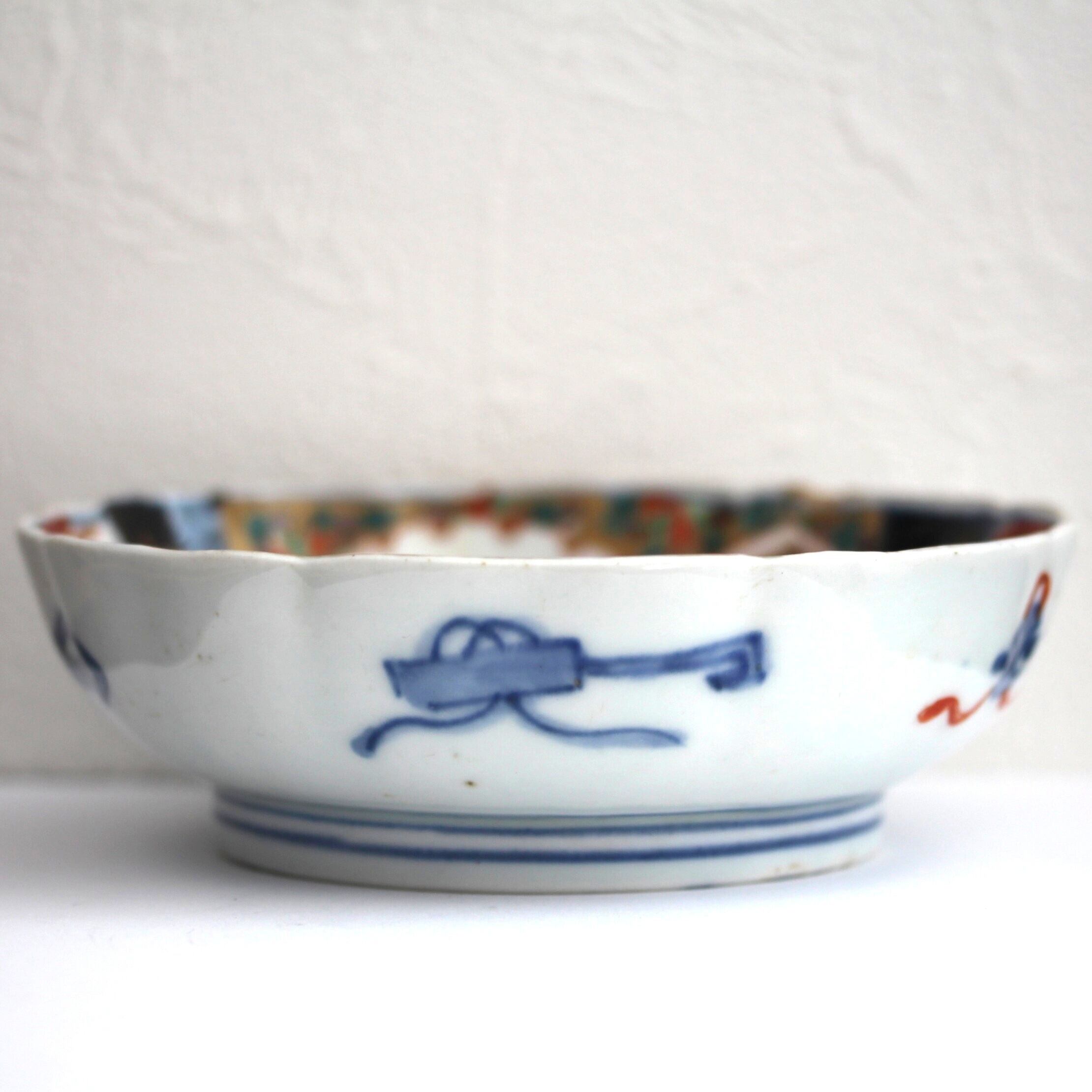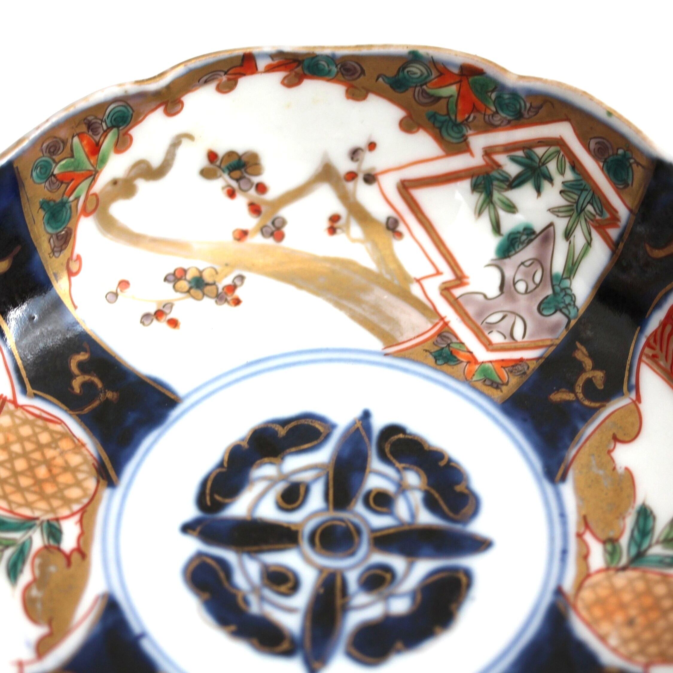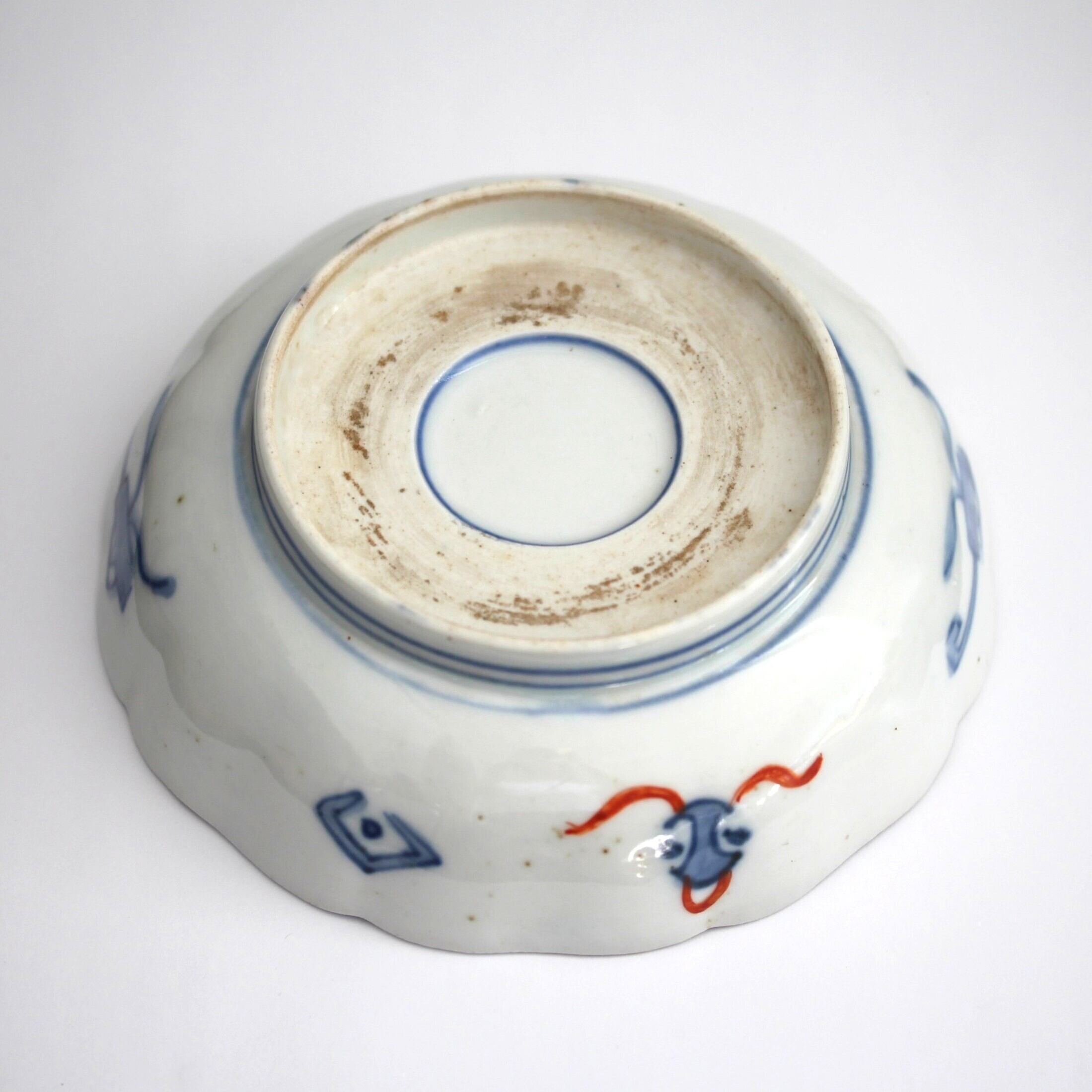 割れ欠けのある伊万里色絵松竹梅秋草文輪花深皿 d15.3cm Chipped and Cracked Imari Polychrome Lobed Bowl, Design of Shochikubai and Autumn Flowers 19th-20th C | Broken and Repaired / キズトツクロイ