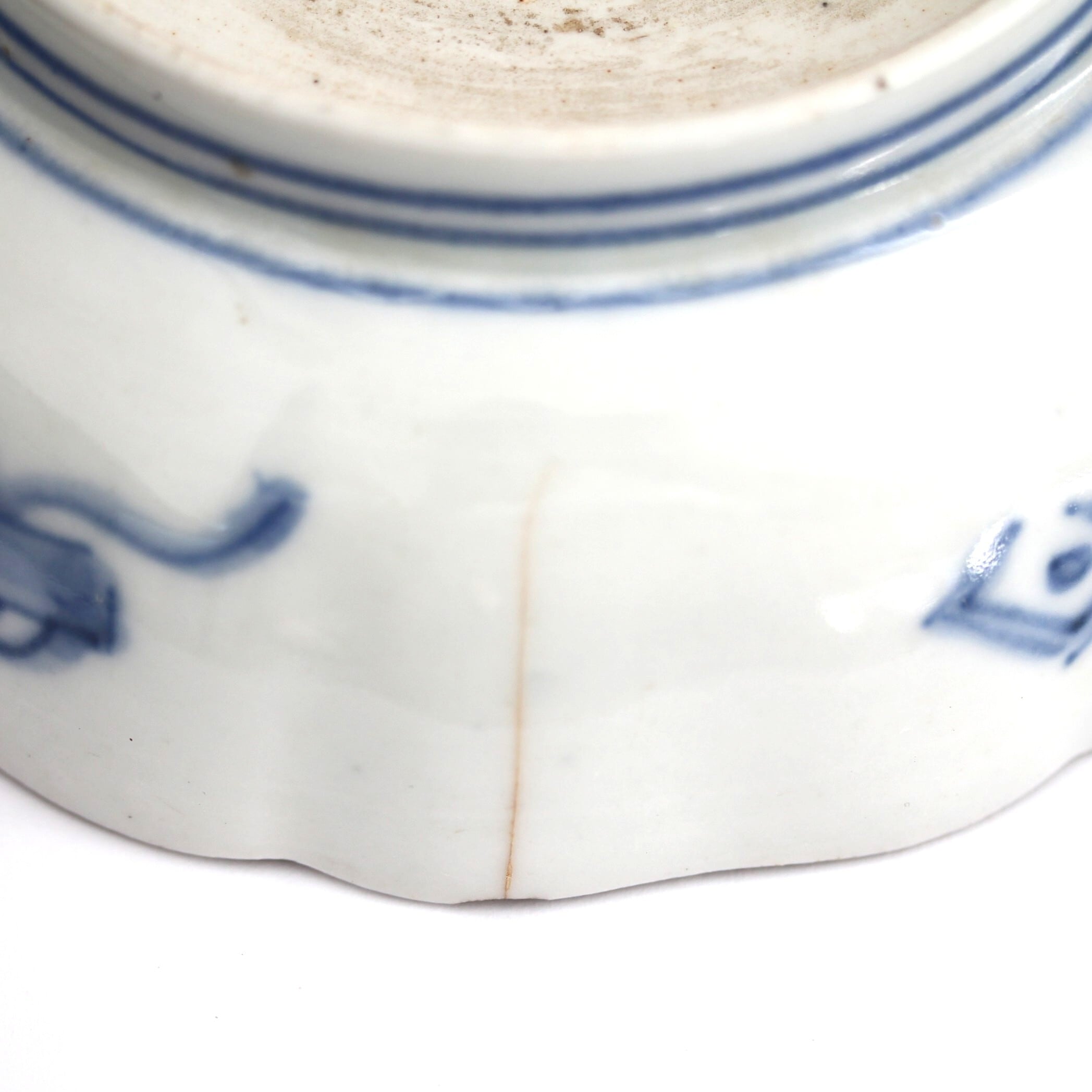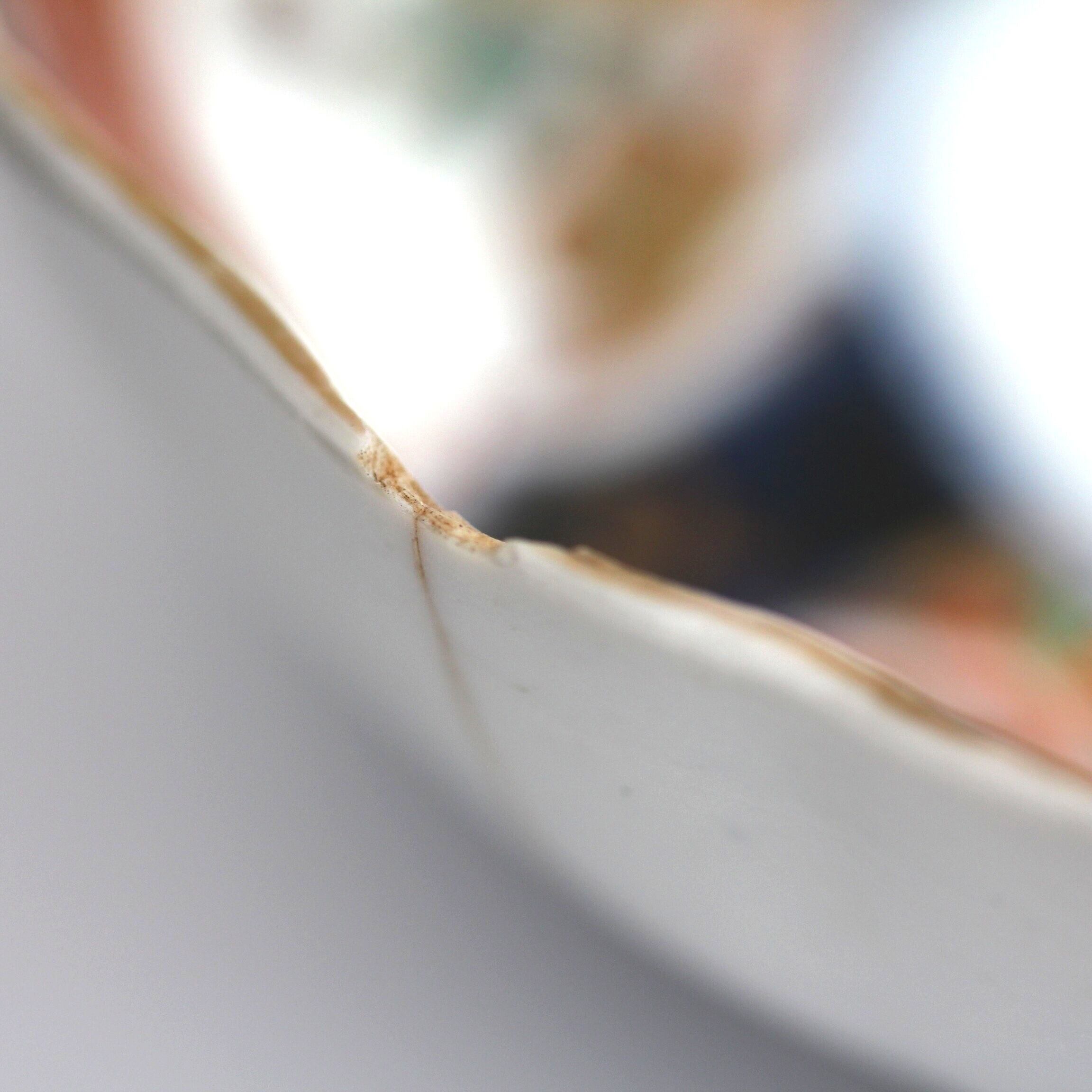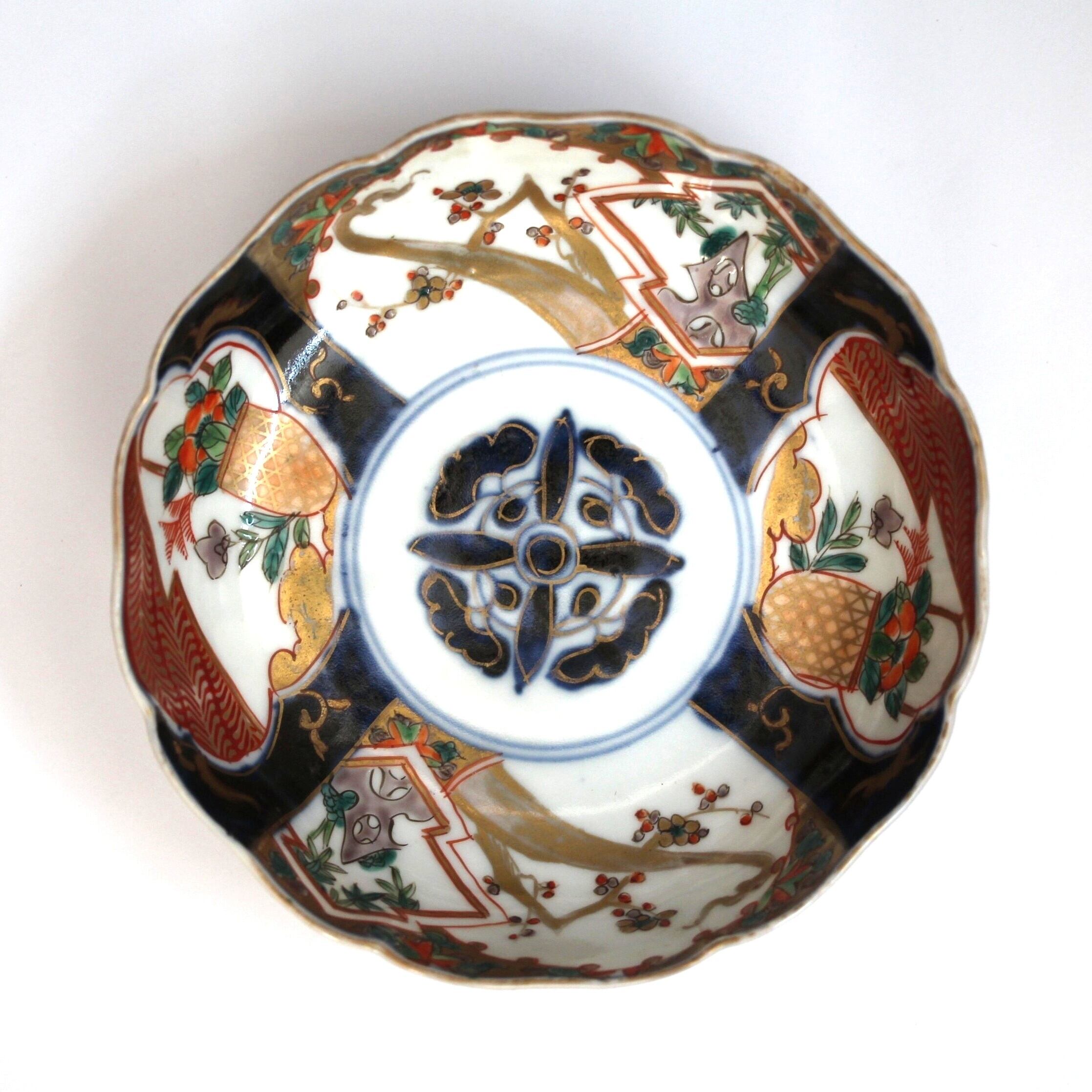 割れ欠けのある伊万里色絵松竹梅秋草文輪花深皿 d15.3cm Chipped and Cracked Imari Polychrome Lobed Bowl, Design of Shochikubai and Autumn Flowers 19th-20th C | Broken and Repaired / キズトツクロイ