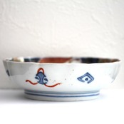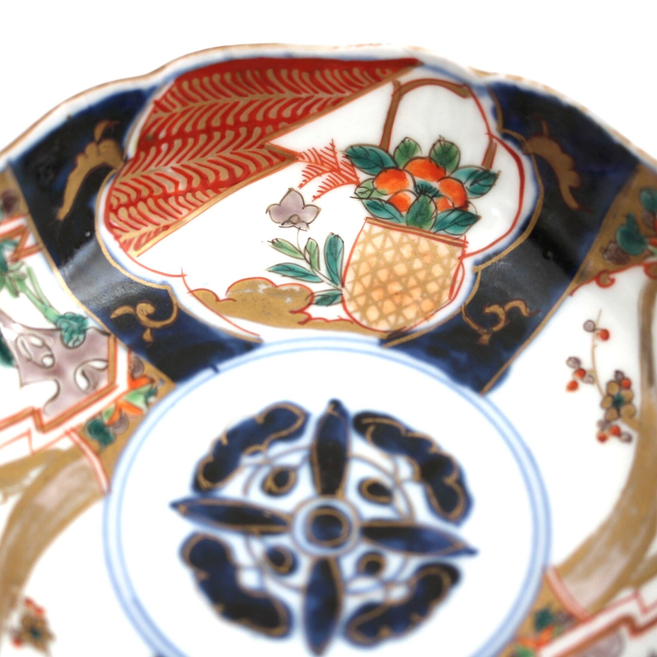 A charing polychrome porcelain lobed bowl with design of autumn flowers amd grasses in a basket and shochikubai. A plum tree is painted in a snow-flake-shaped window. Bamboo is painted in a window in shape of matsukawa-bishi, a Japanese traditional diamond-shaped pattern expressing pine bark. Takara-zukushi treasures design outside.