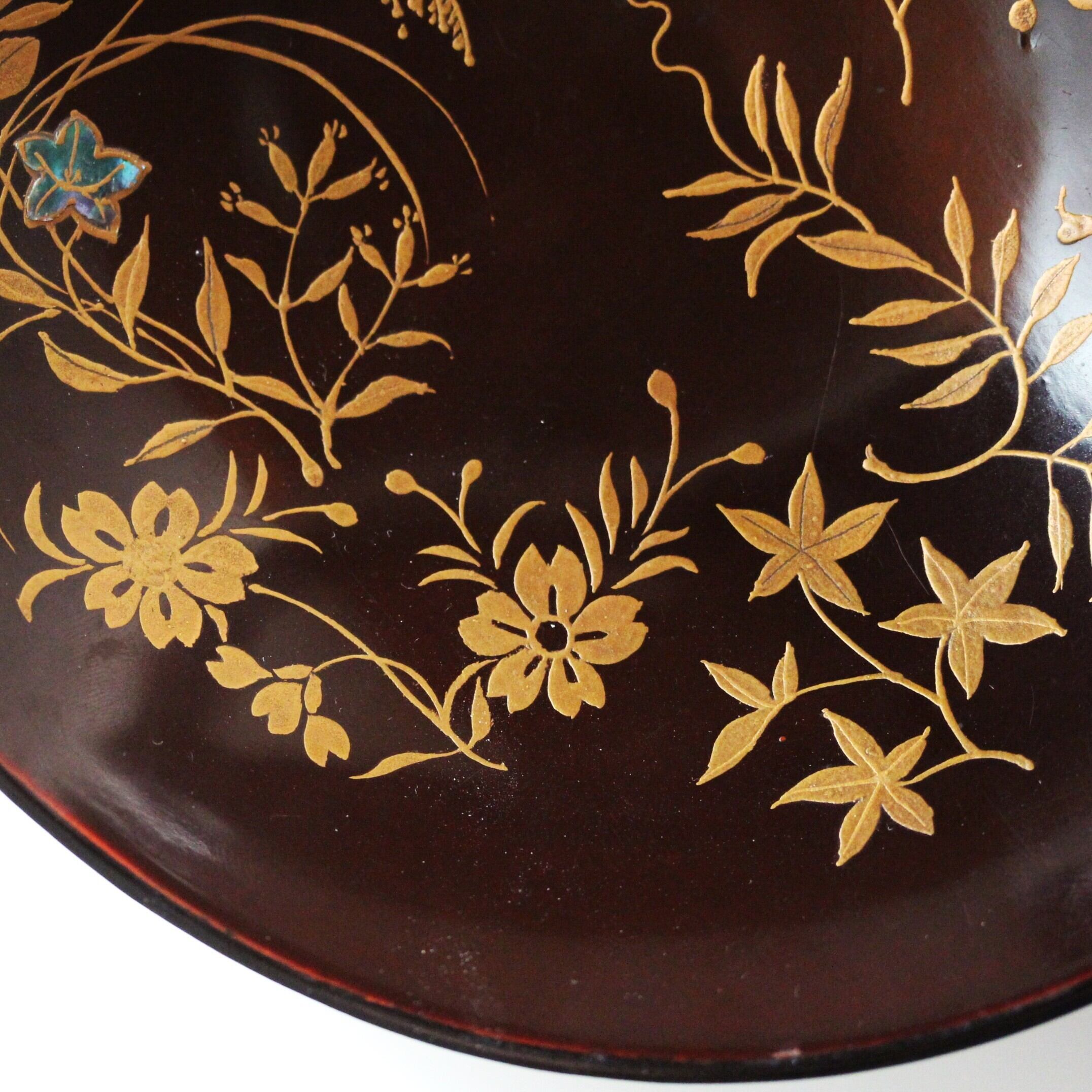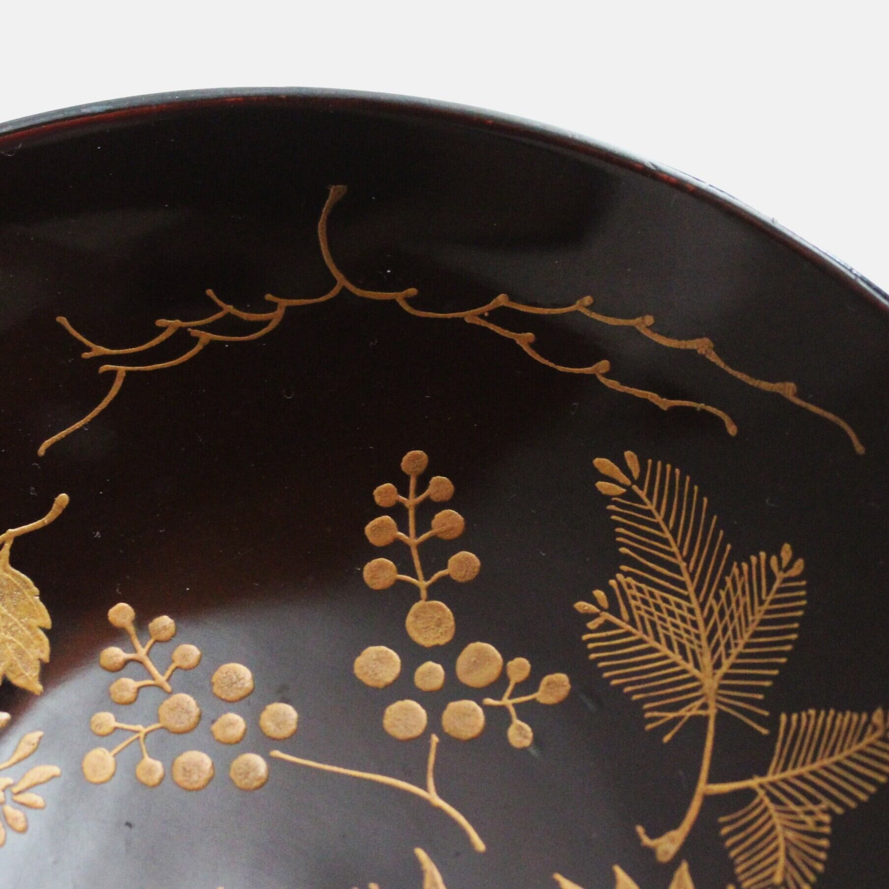 小さな当たり傷のある草花蒔絵菓子器 d17.1cm Minor Chipped Lacquered Wooden Dish with Stand, Design of Autumnal and Other Seasonal Flowers in Gold Makie 19th-20th C | Broken and Repaired / キズトツクロイ
