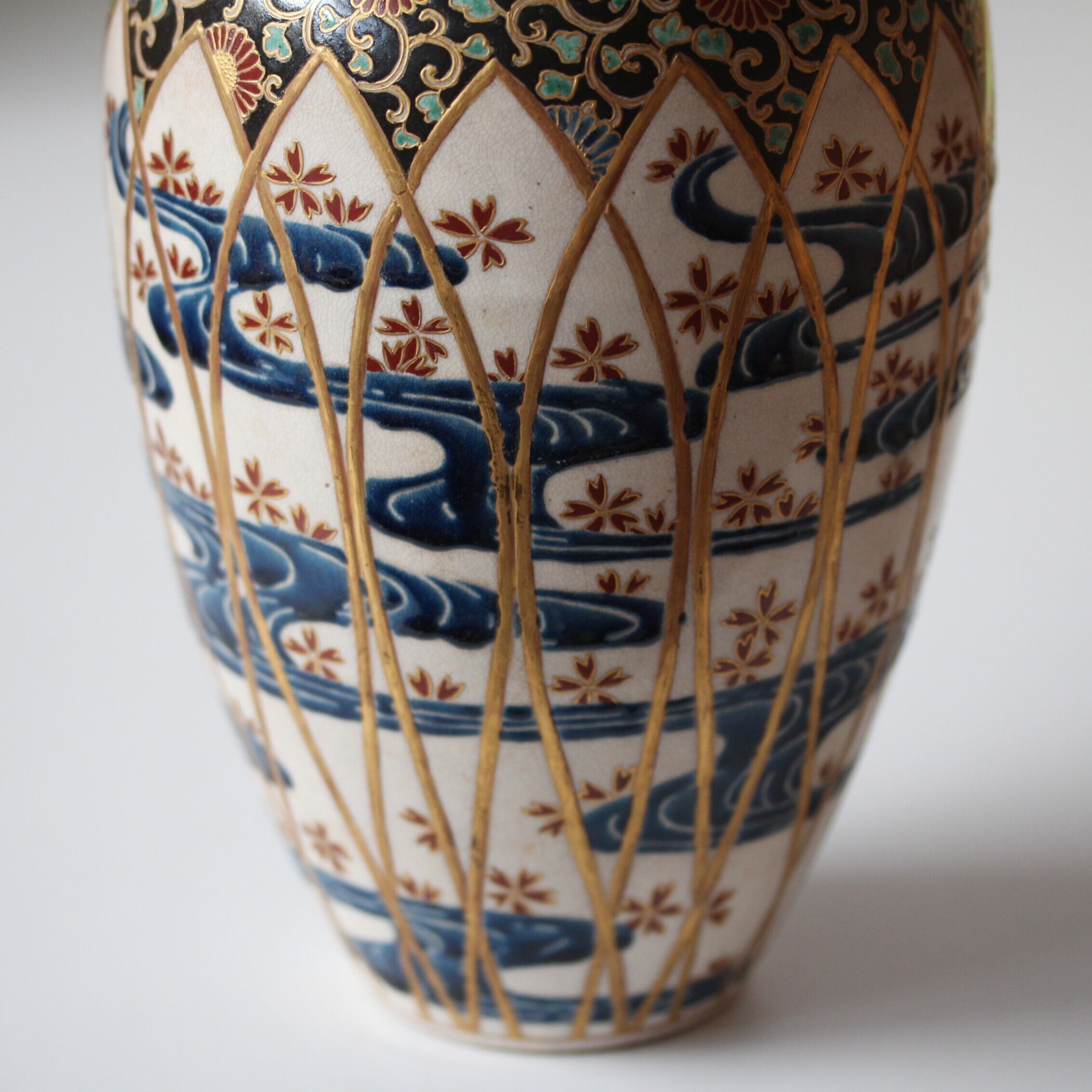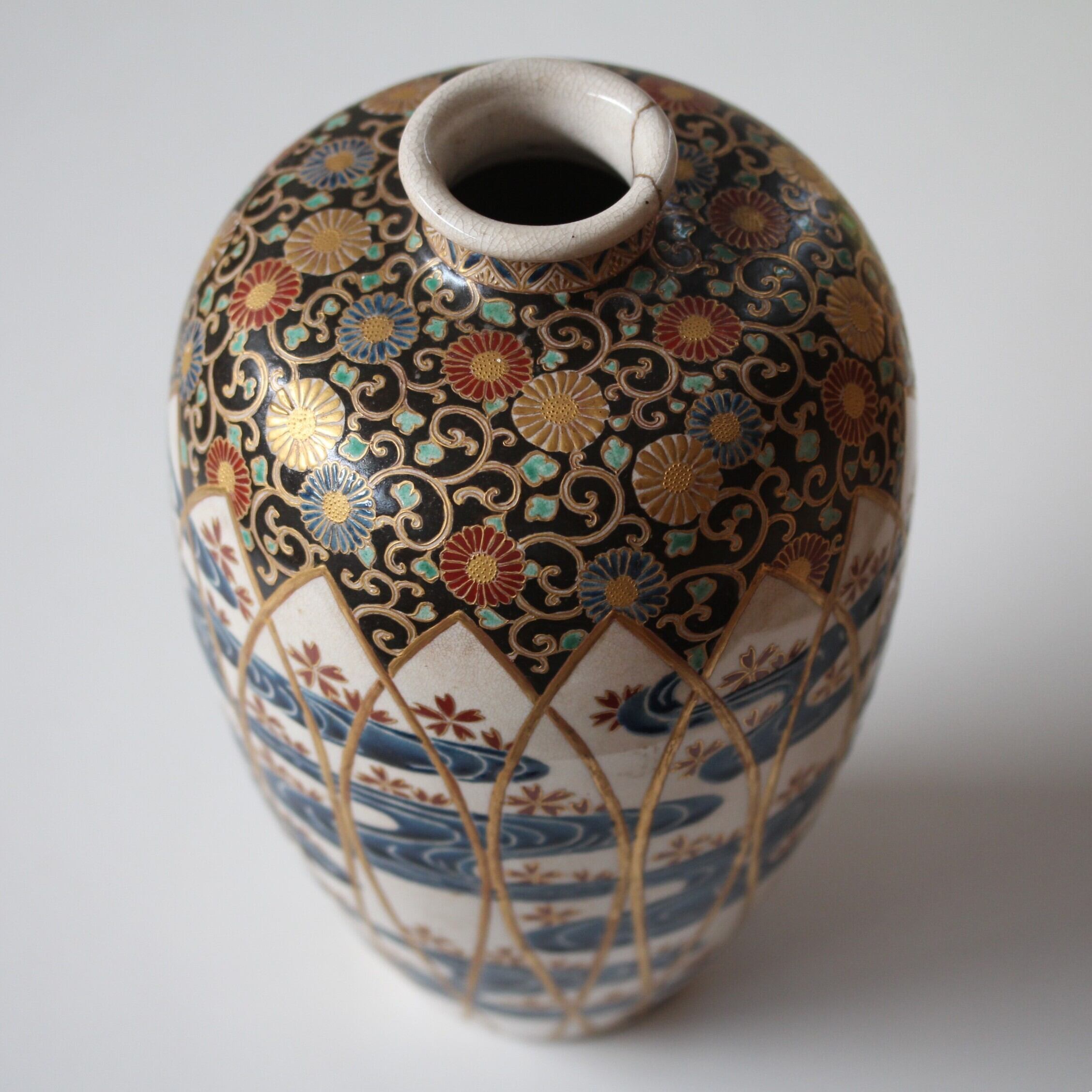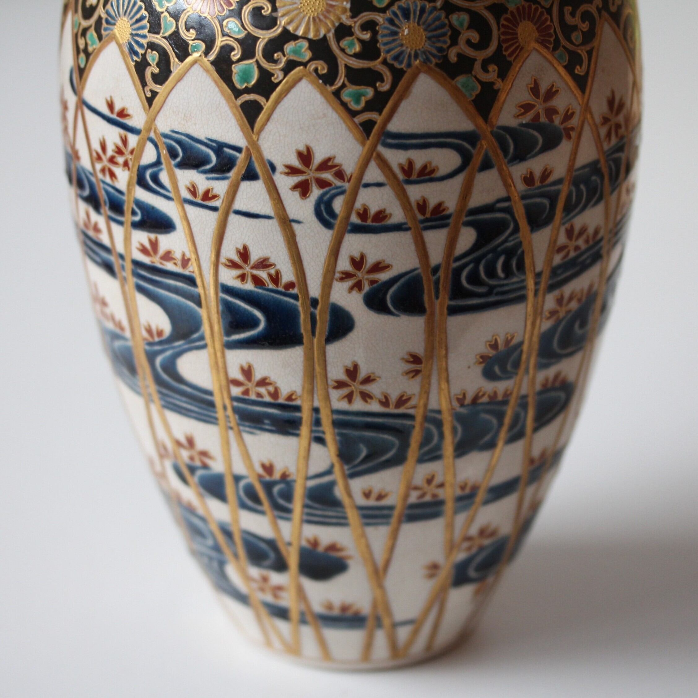 A beautiful enameled ceramic vase, Satsuma ware, with design of chrysanthemum scroll and sakura cherry blossoms on water stream.