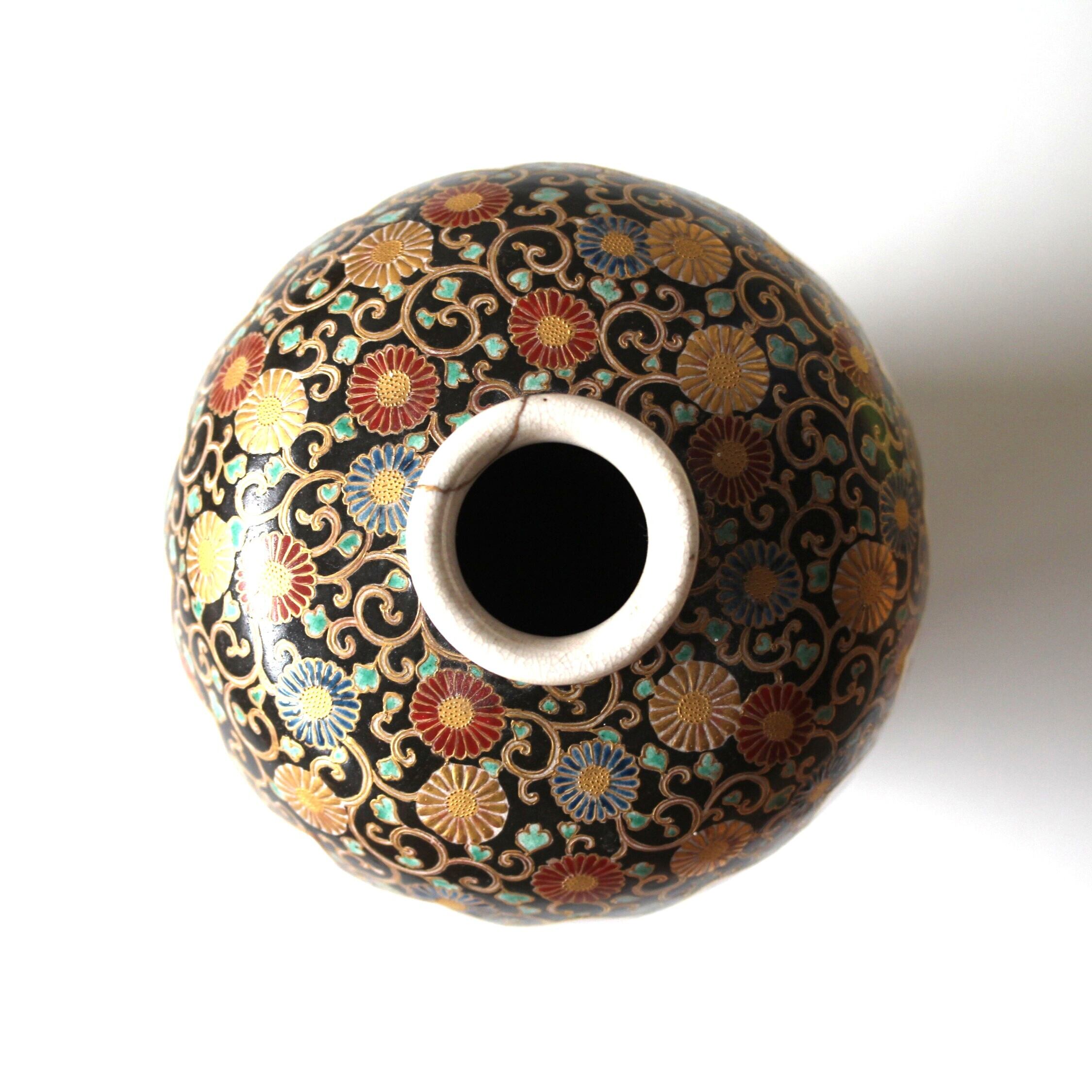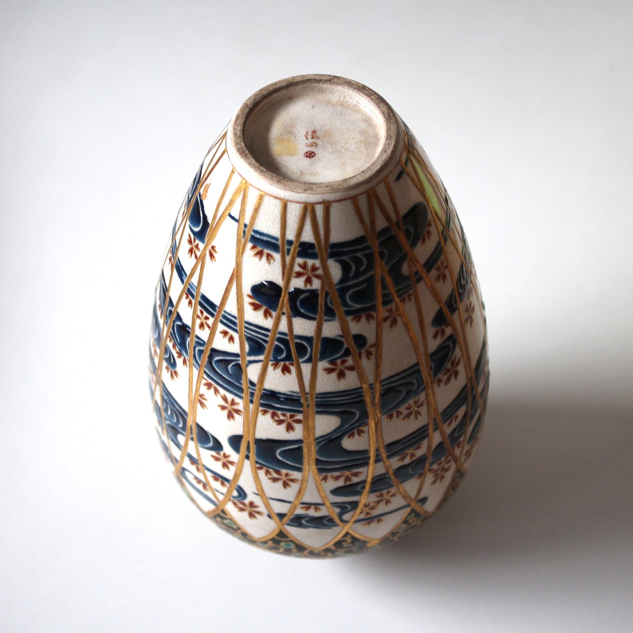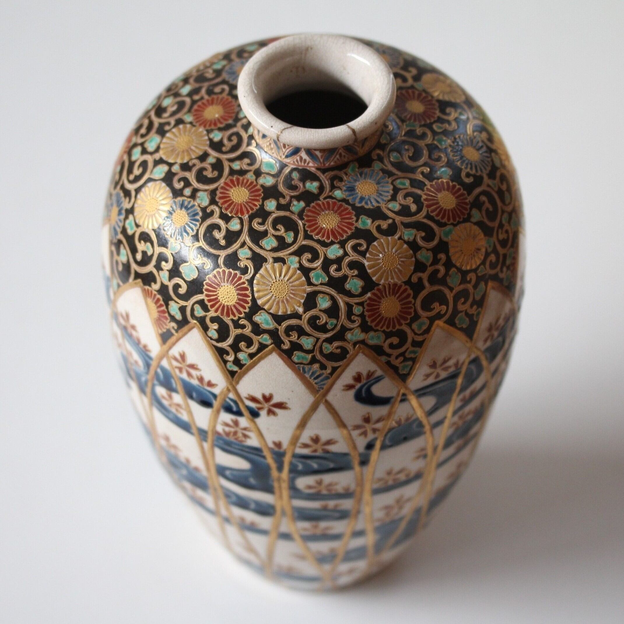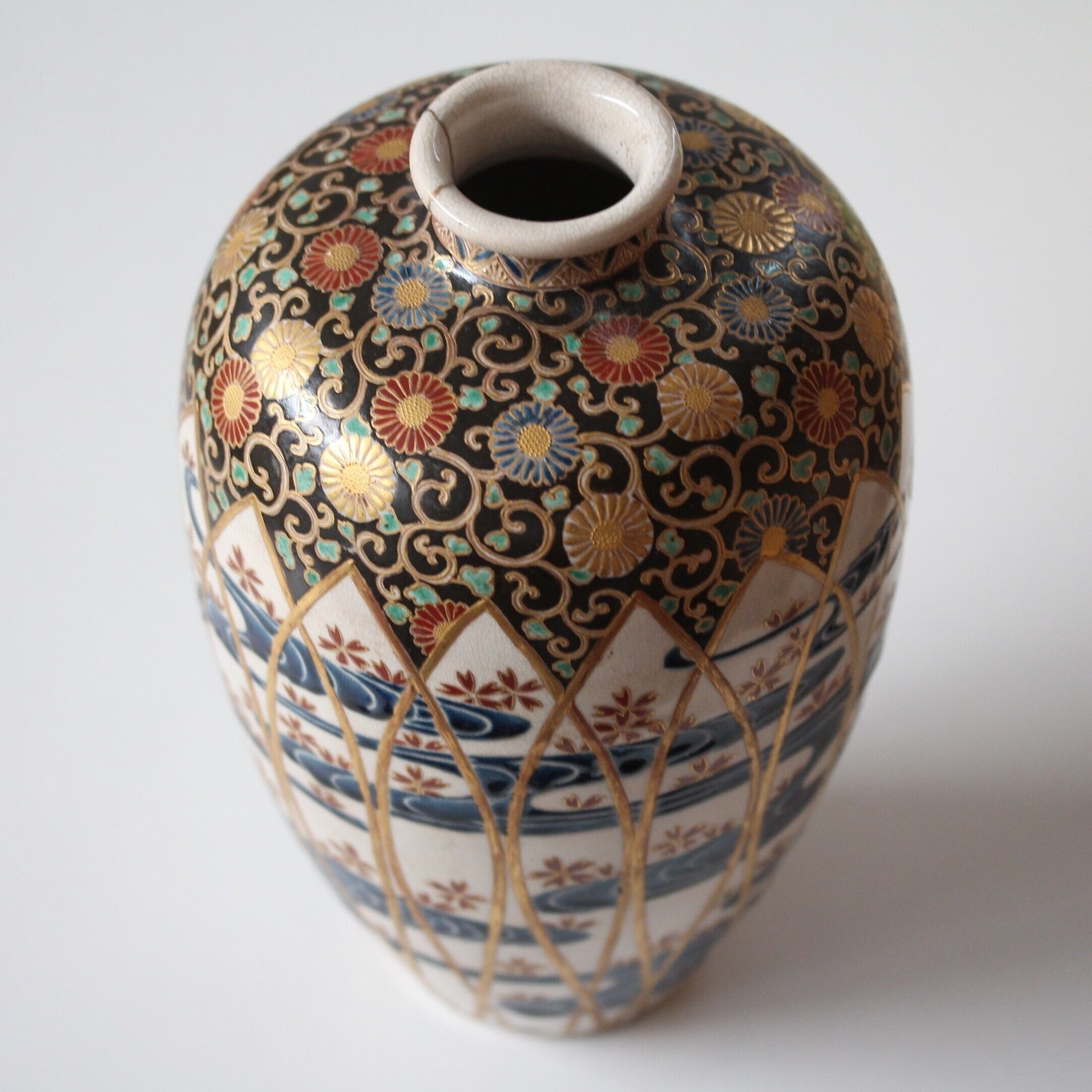 A beautiful enameled ceramic vase, Satsuma ware, with design of chrysanthemum scroll and sakura cherry blossoms on water stream.
