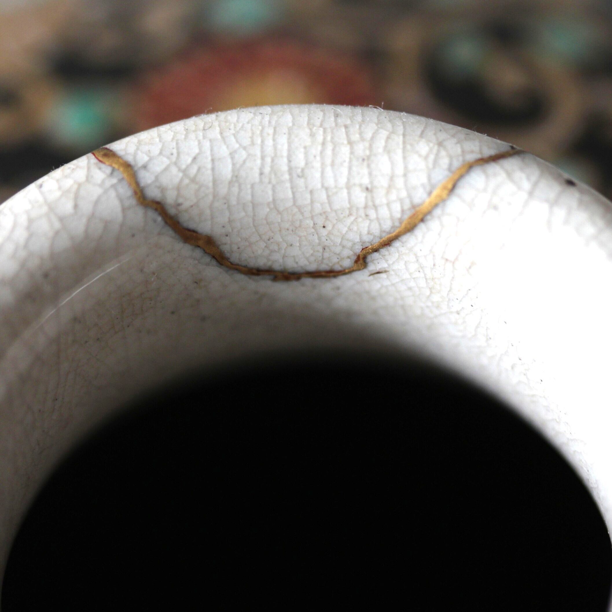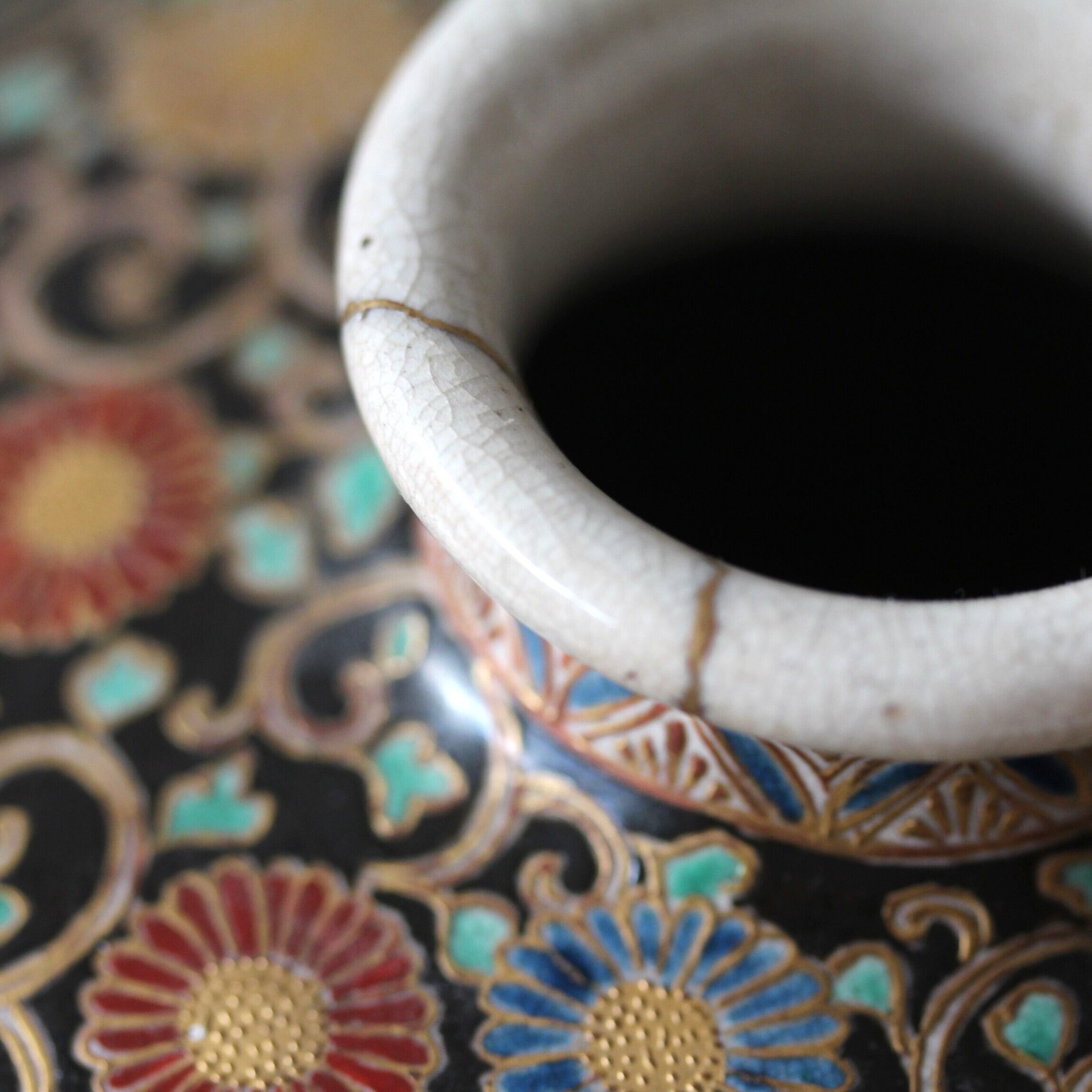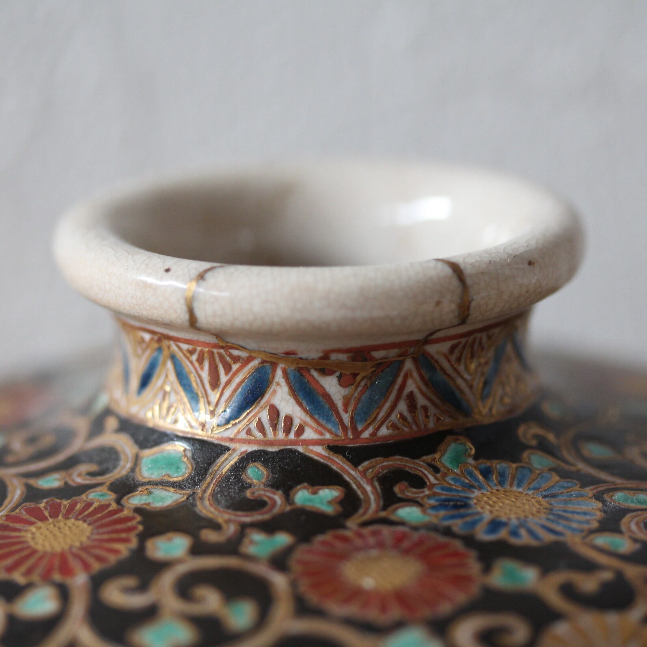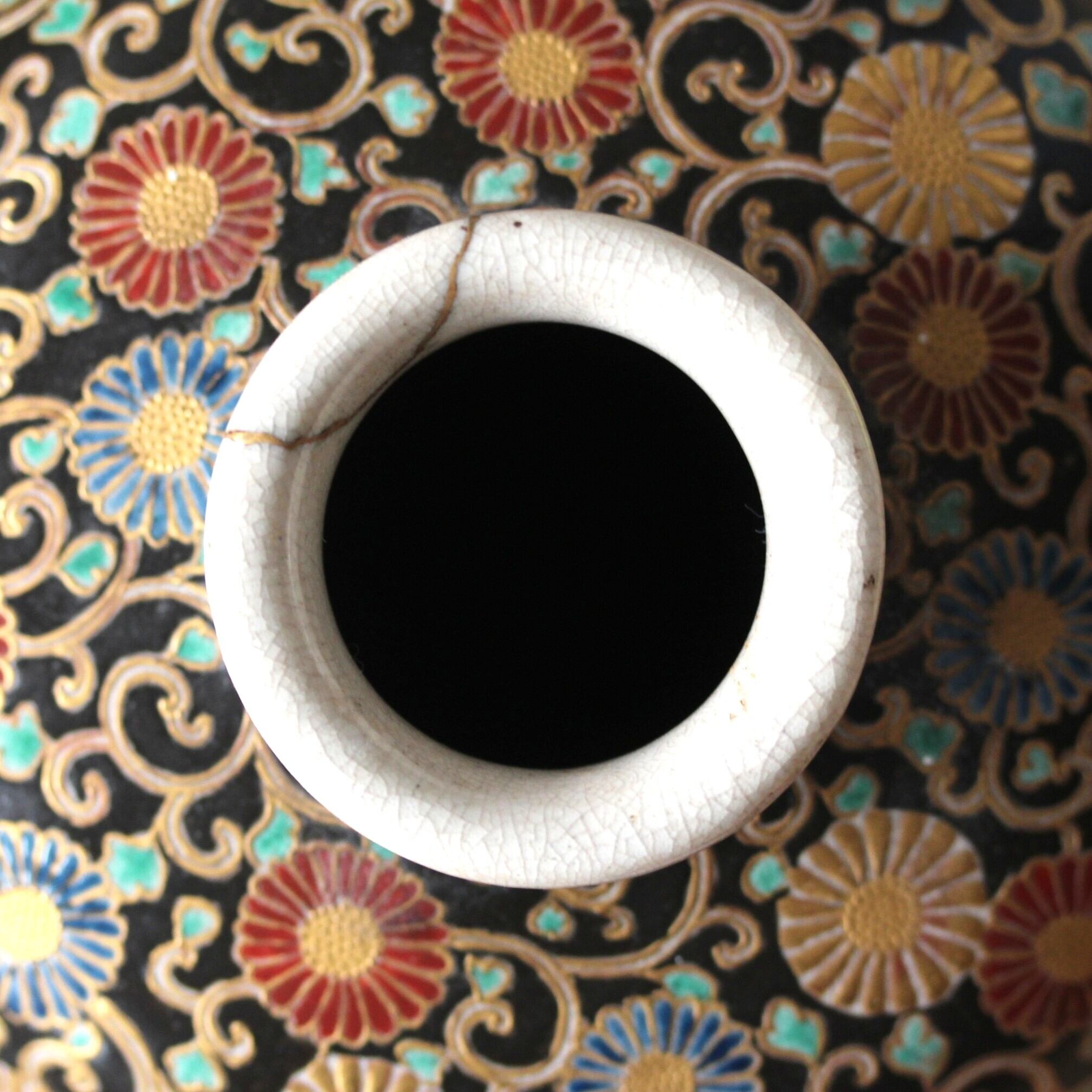 金繕いのある薩摩色絵菊唐草桜流水文花生 h24.5cm Kintsugi Repaired Satsuma Enameled Vase, Design of Chrysanthemum Scroll and Cherry Blossoms on Water Stream 19th-20th C