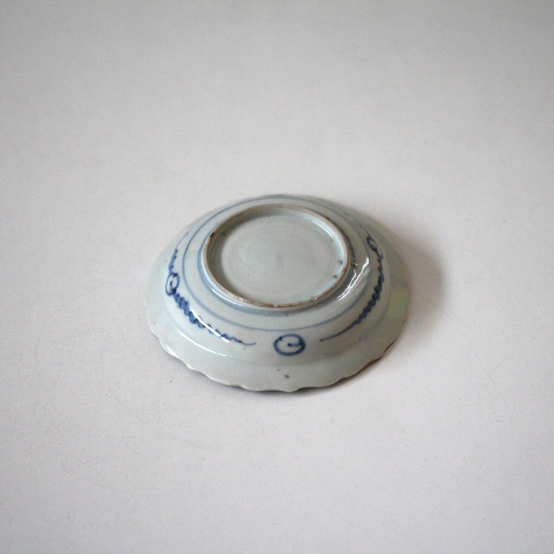補修のある古伊万里染付馬文稜花小皿 d11.8cm Repaired Imari Blue and White Foliate Small Dish, Horse Design 19th C | Broken and Repaired / キズトツクロイ