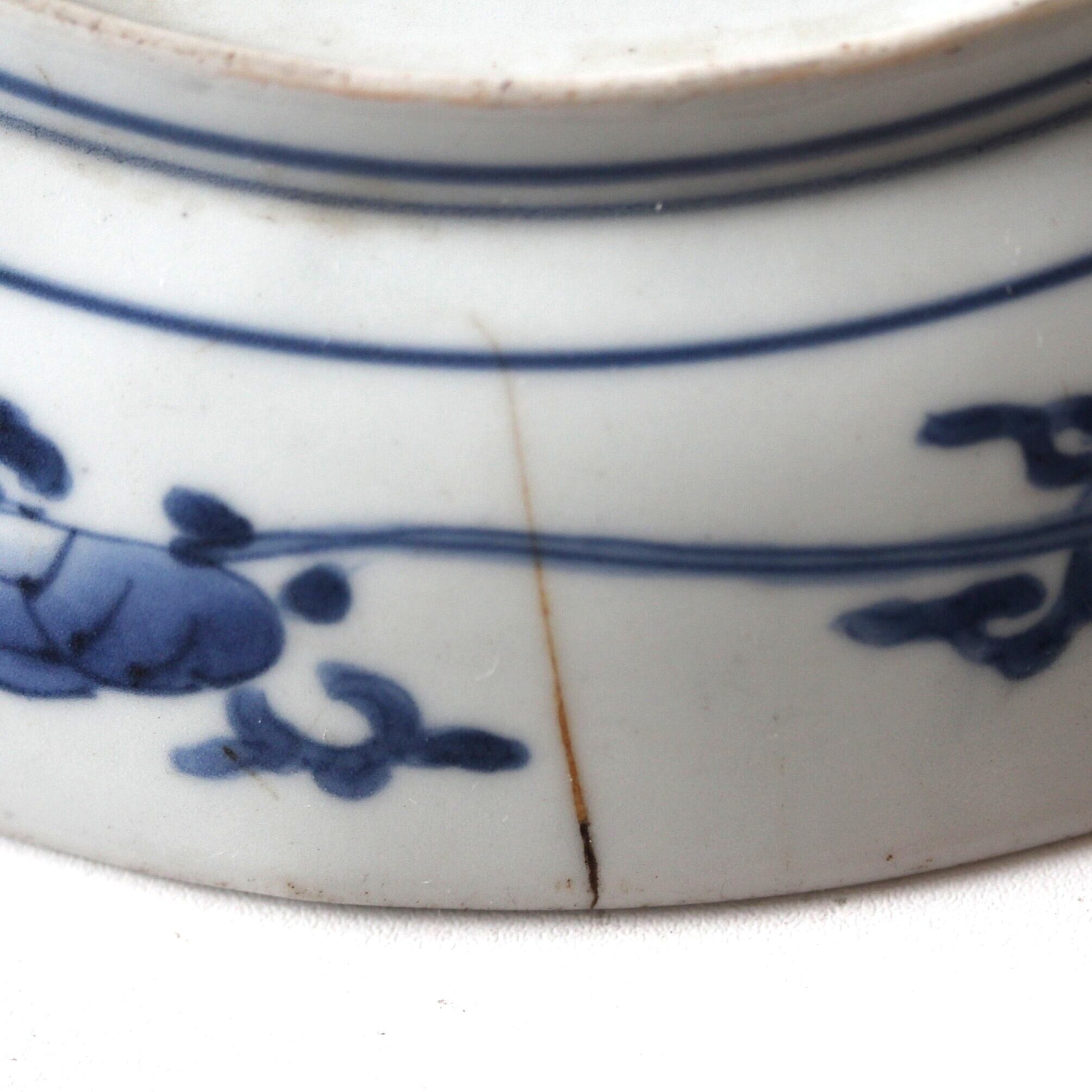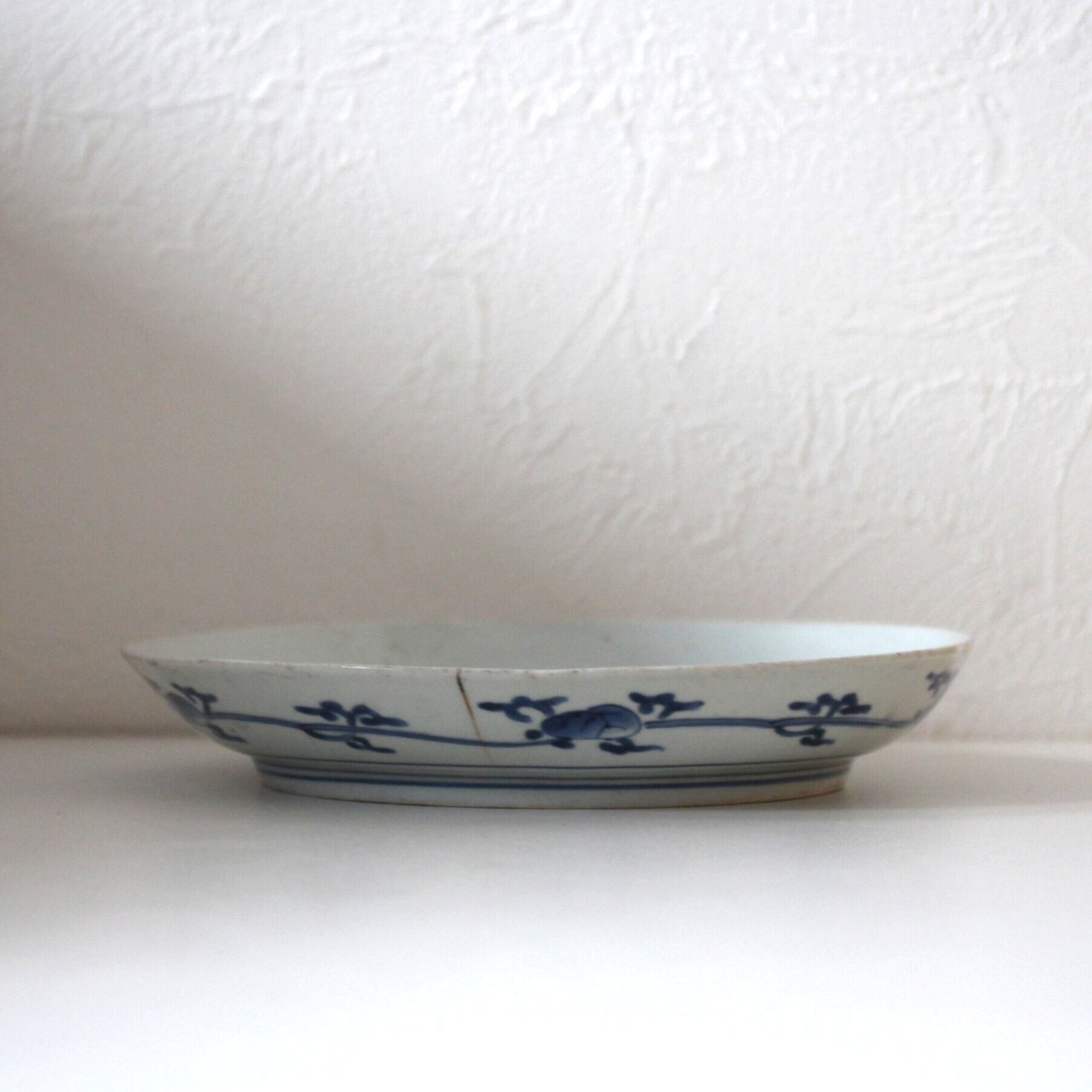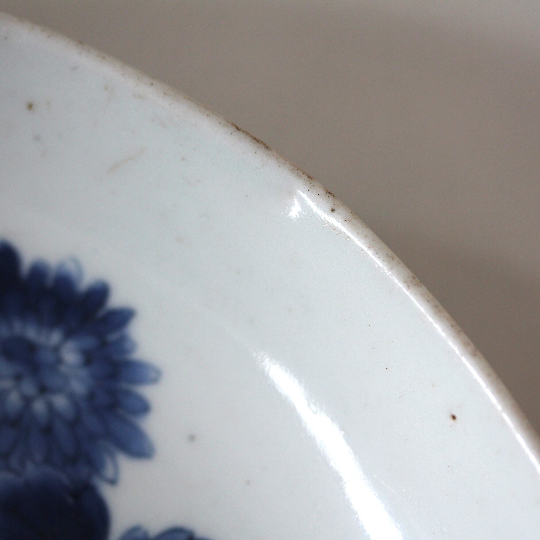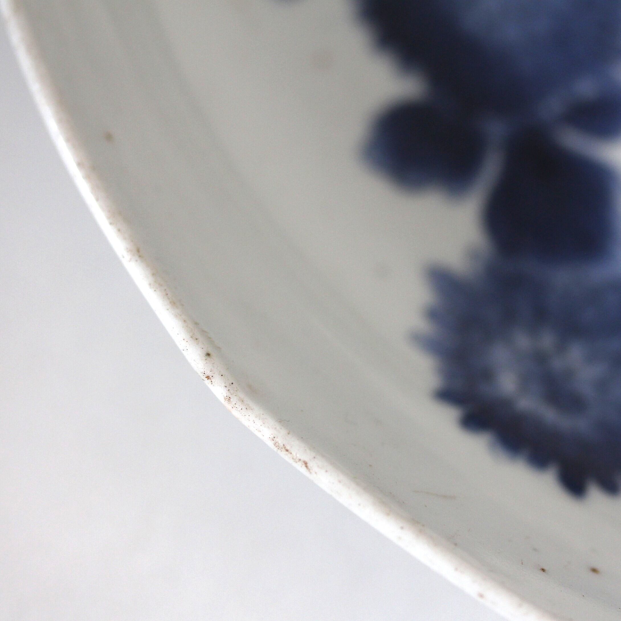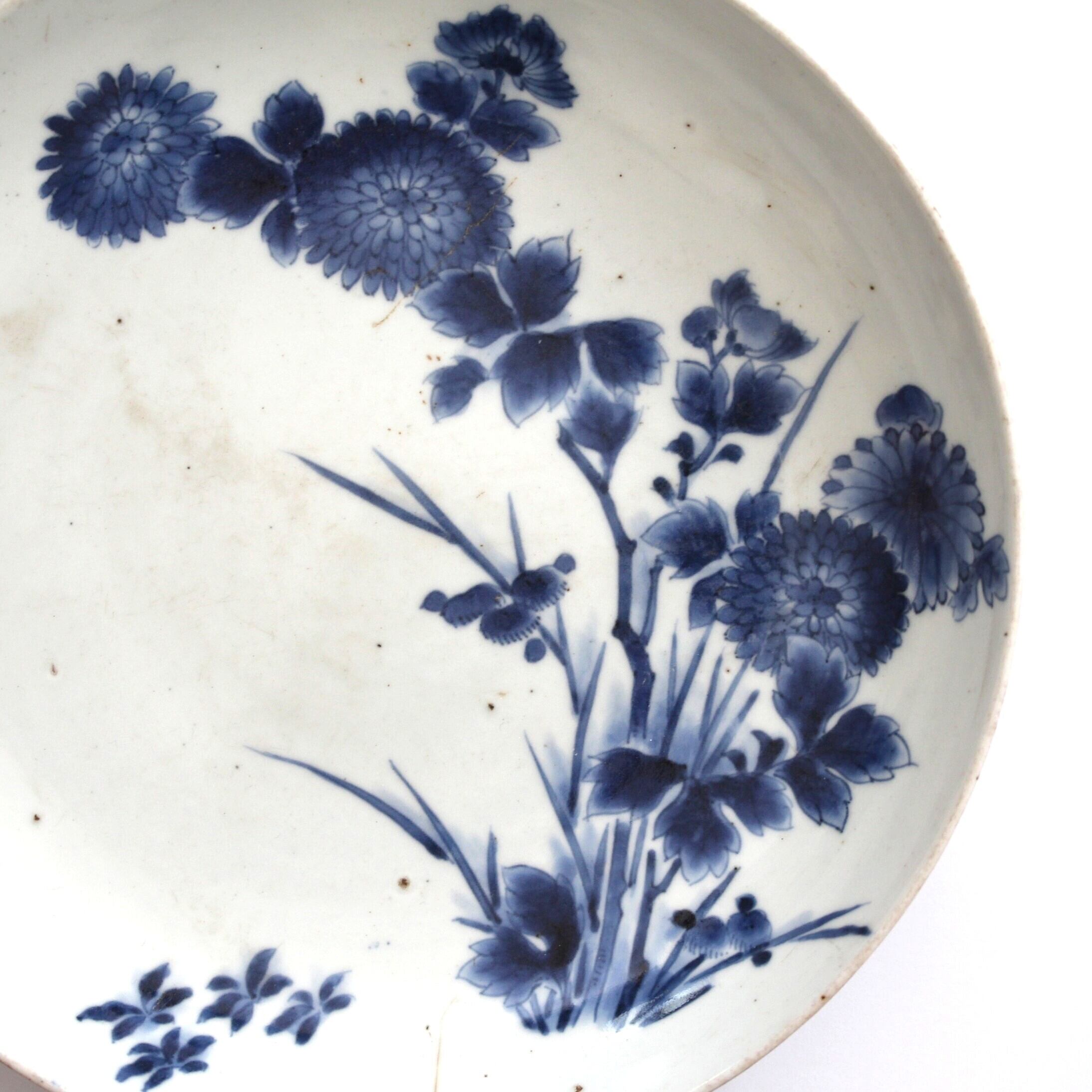 割れのある古伊万里染付菊花文皿 d21.5cm Cracked Imari Blue and White Dish, Chrysanthemums Design 17th C | Broken and Repaired / キズトツクロイ