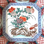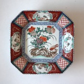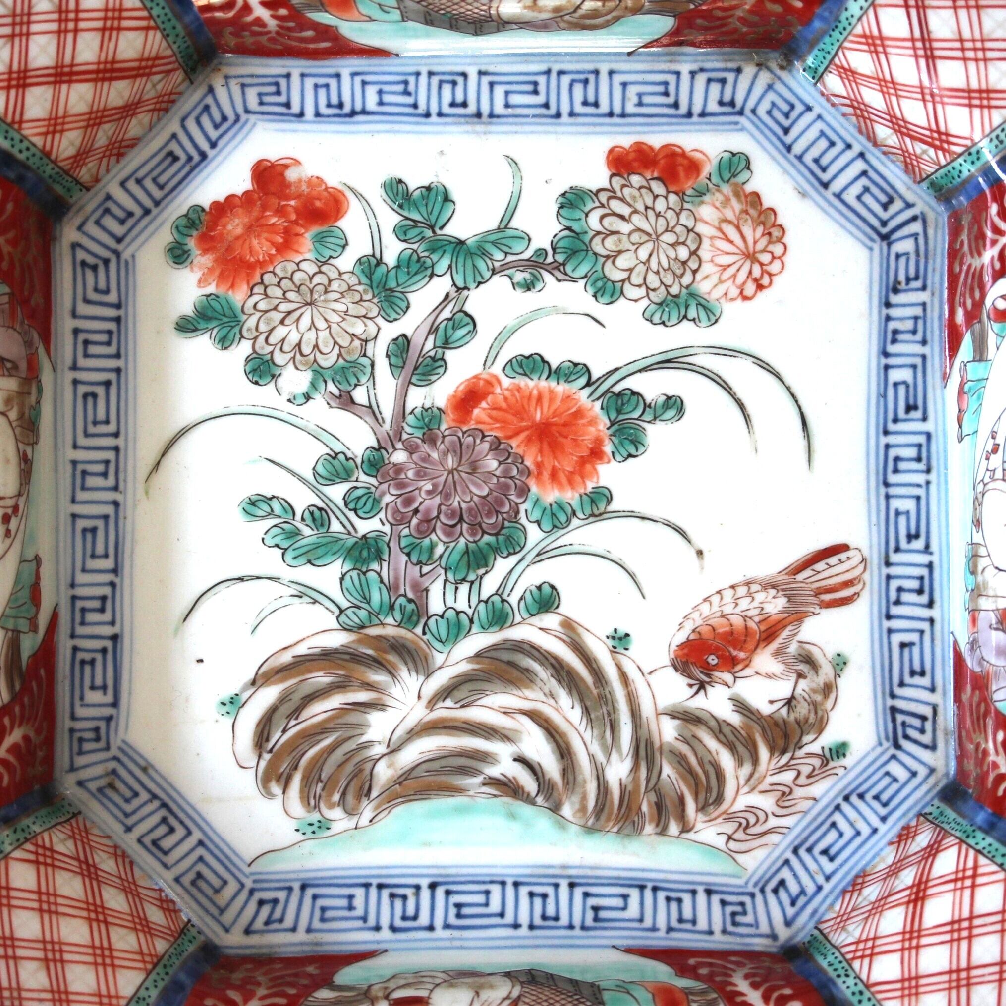 小さな欠けのある古伊万里色絵菊鳥文隅切額皿 d24.3cm Minor Chipped Imari Polychrome Octagonal Dish, Design of Chrysanthemums and Bird 19th C | Broken and Repaired / キズトツクロイ