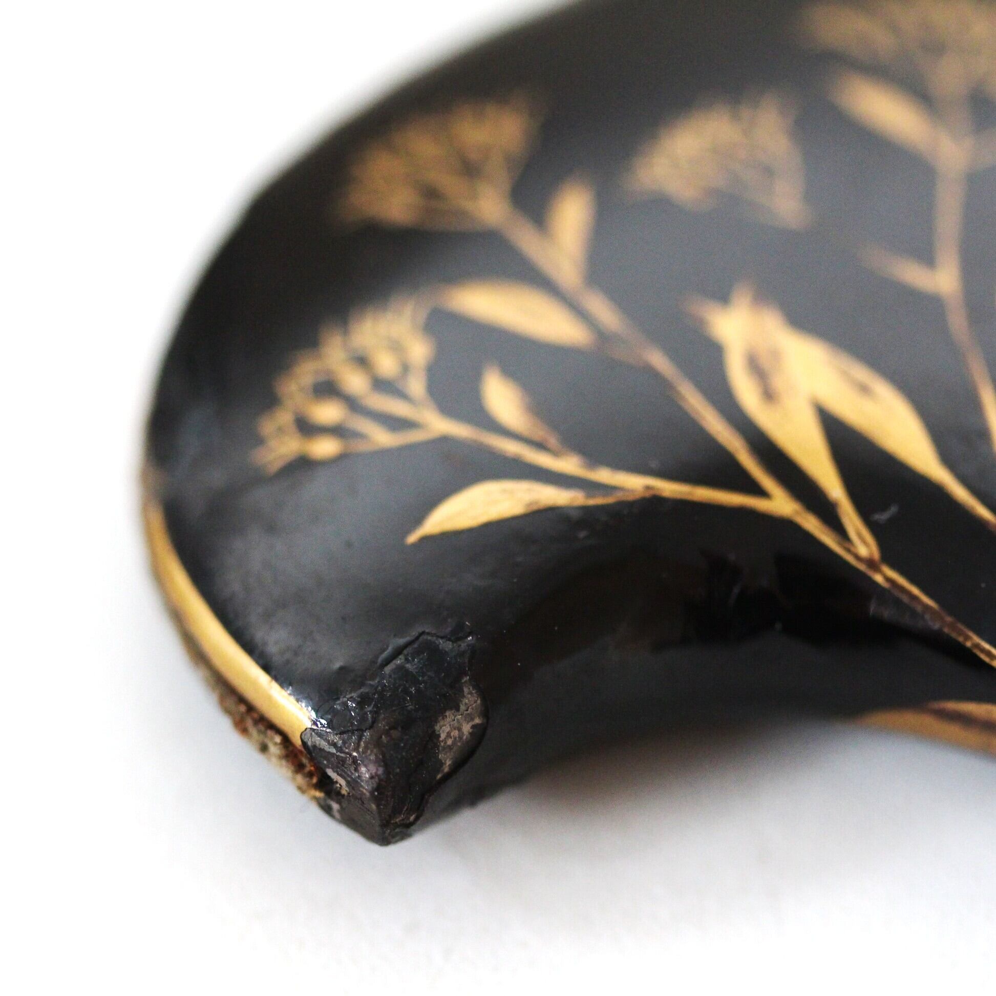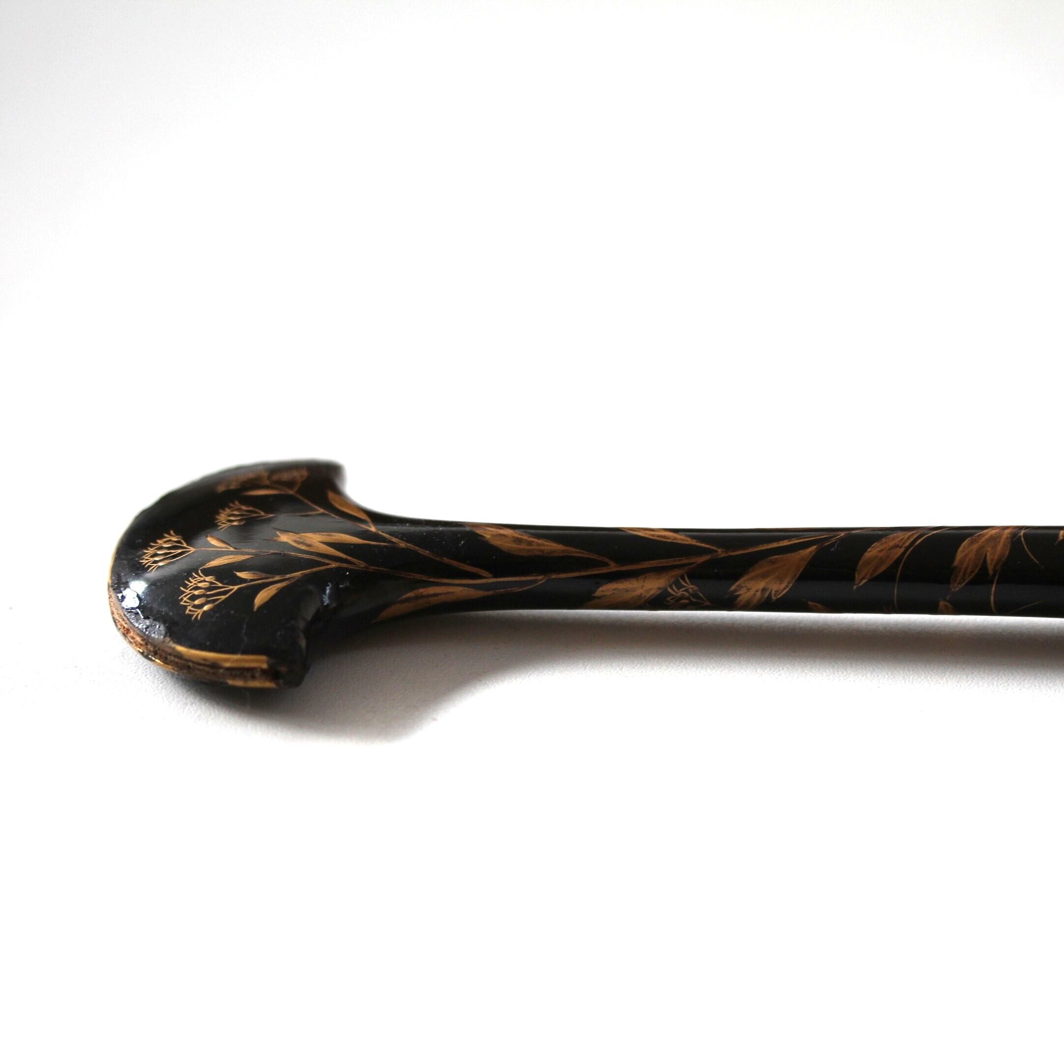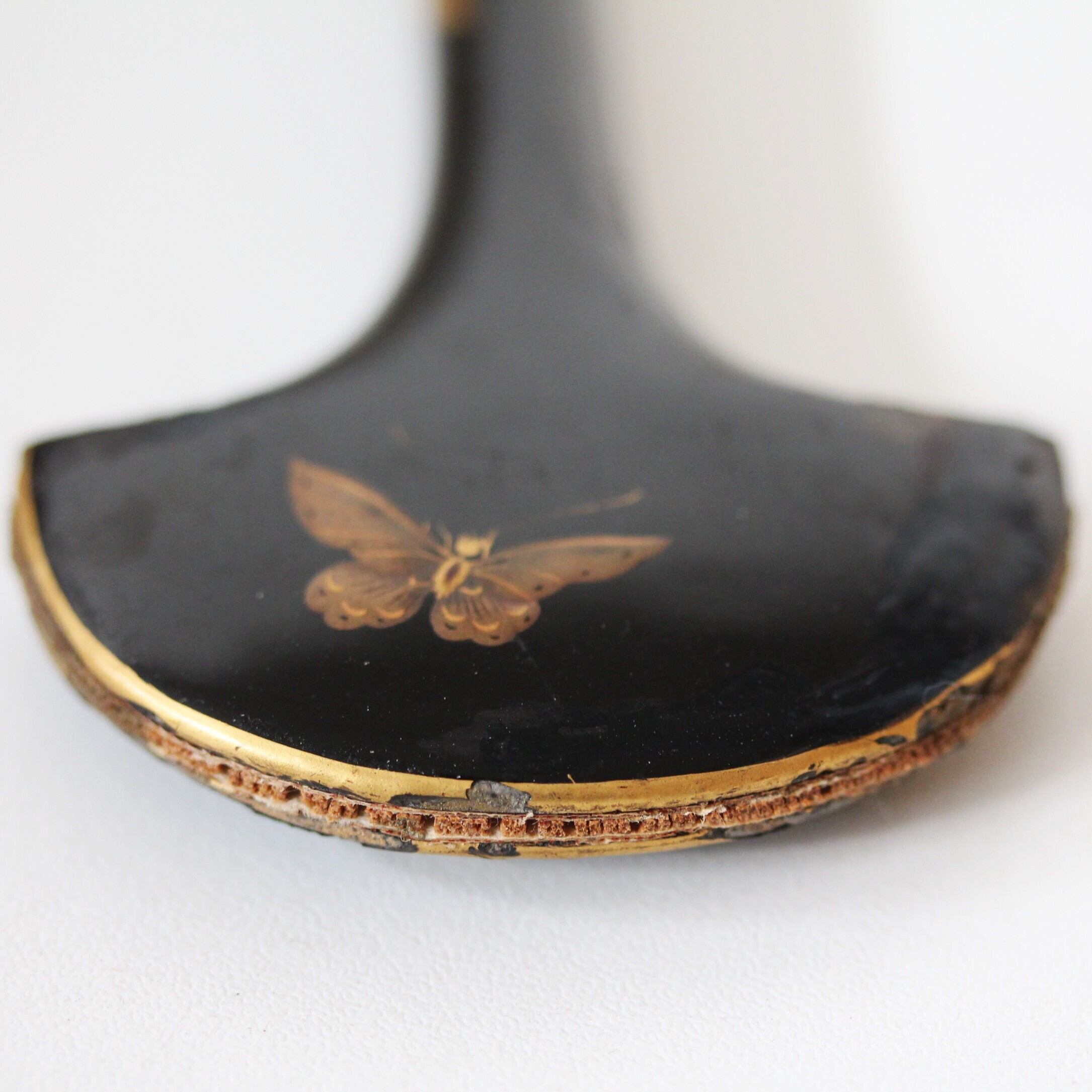 イタミのある藤袴蝶蒔絵柄(団扇用)17.2cm Damaged Black Lacquered Wooden Handle for Uchiwa Fan, Design of Fujibakama Boneset and Butterfly 20th C | Broken and Repaired / キズトツクロイ