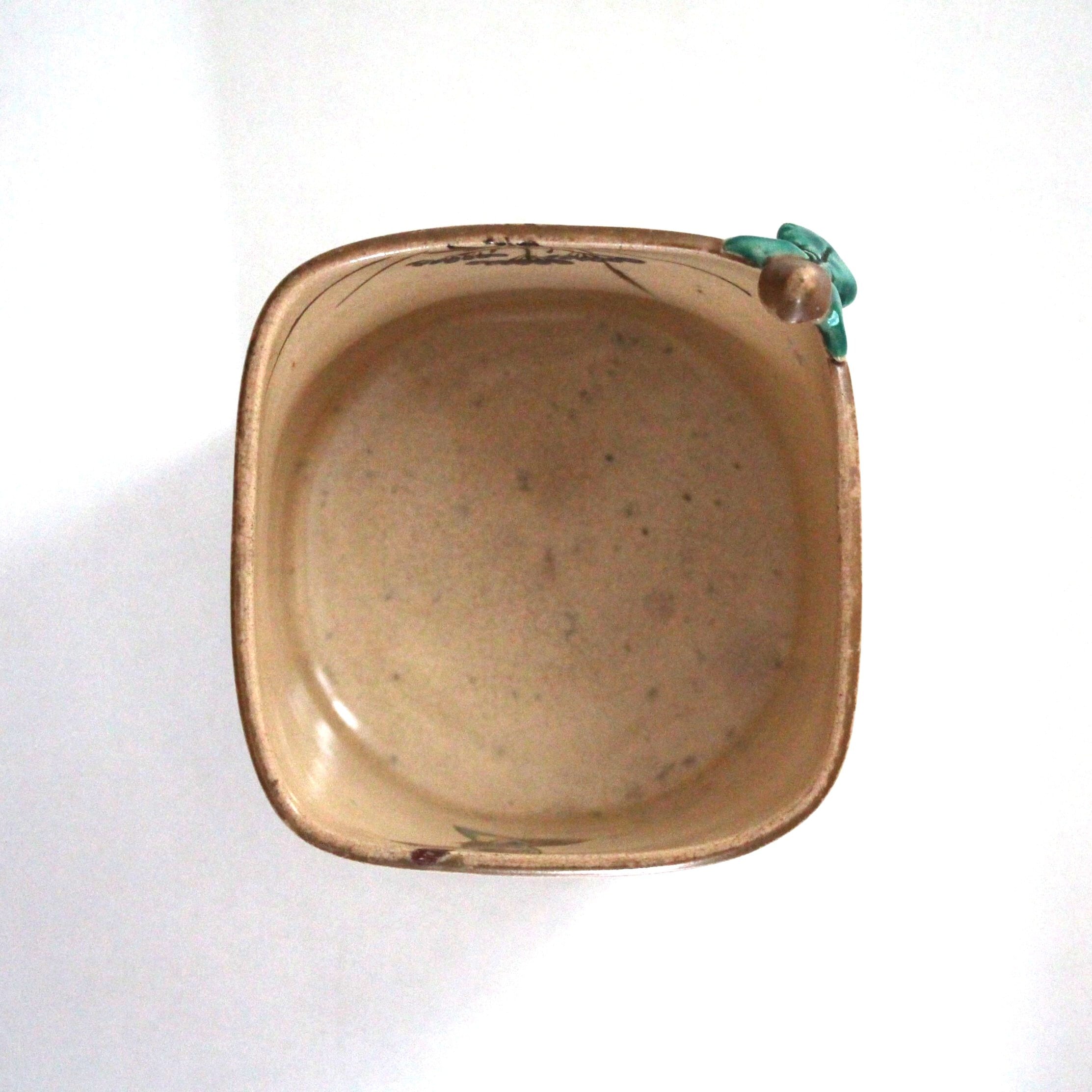 A charming ceramic square bowl with decoration of a figurine, called ikkanjin. Momiji maple leaves, fujibakama bonesets, and a bird are painted in underglaze iron brown, and overglaze color and gold enamels.