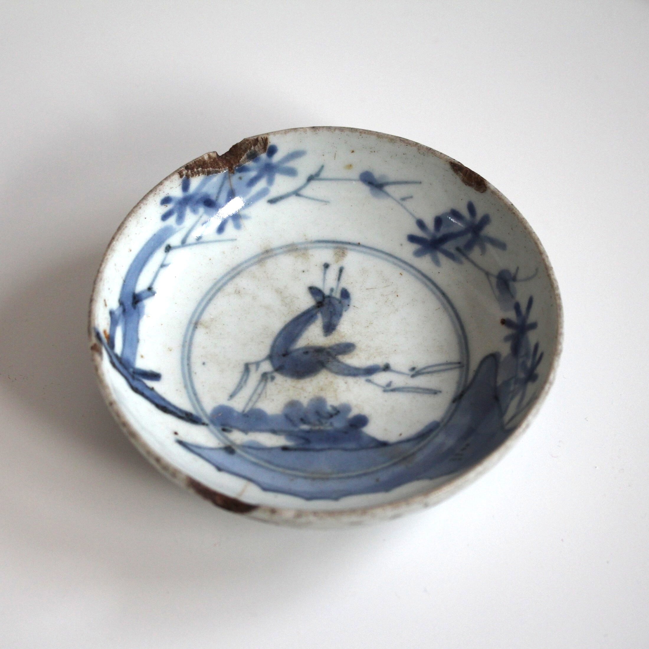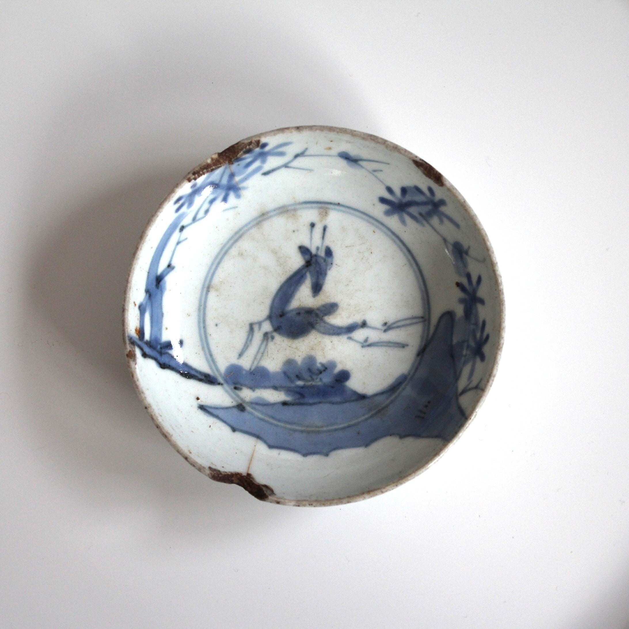 割れ欠けのある古伊万里染付鹿紅葉文深皿(その2)d12.9cm Chipped and Cracked Imari Blue and White Small Dish, Design of Deer under Momiji Maple Tree 17th-18th C | Broken and Repaired / キズトツクロイ