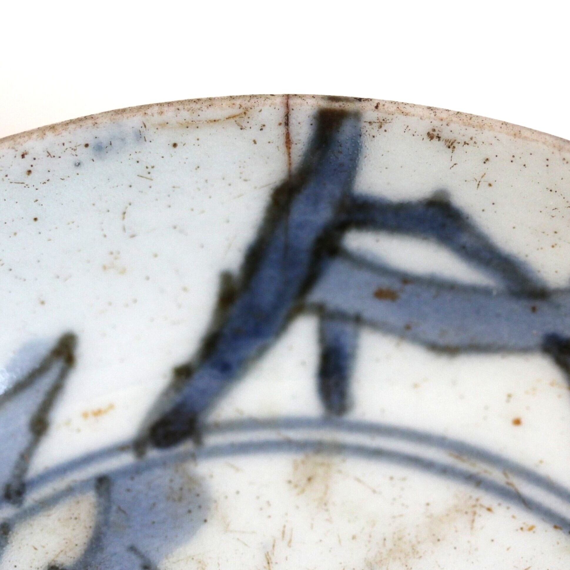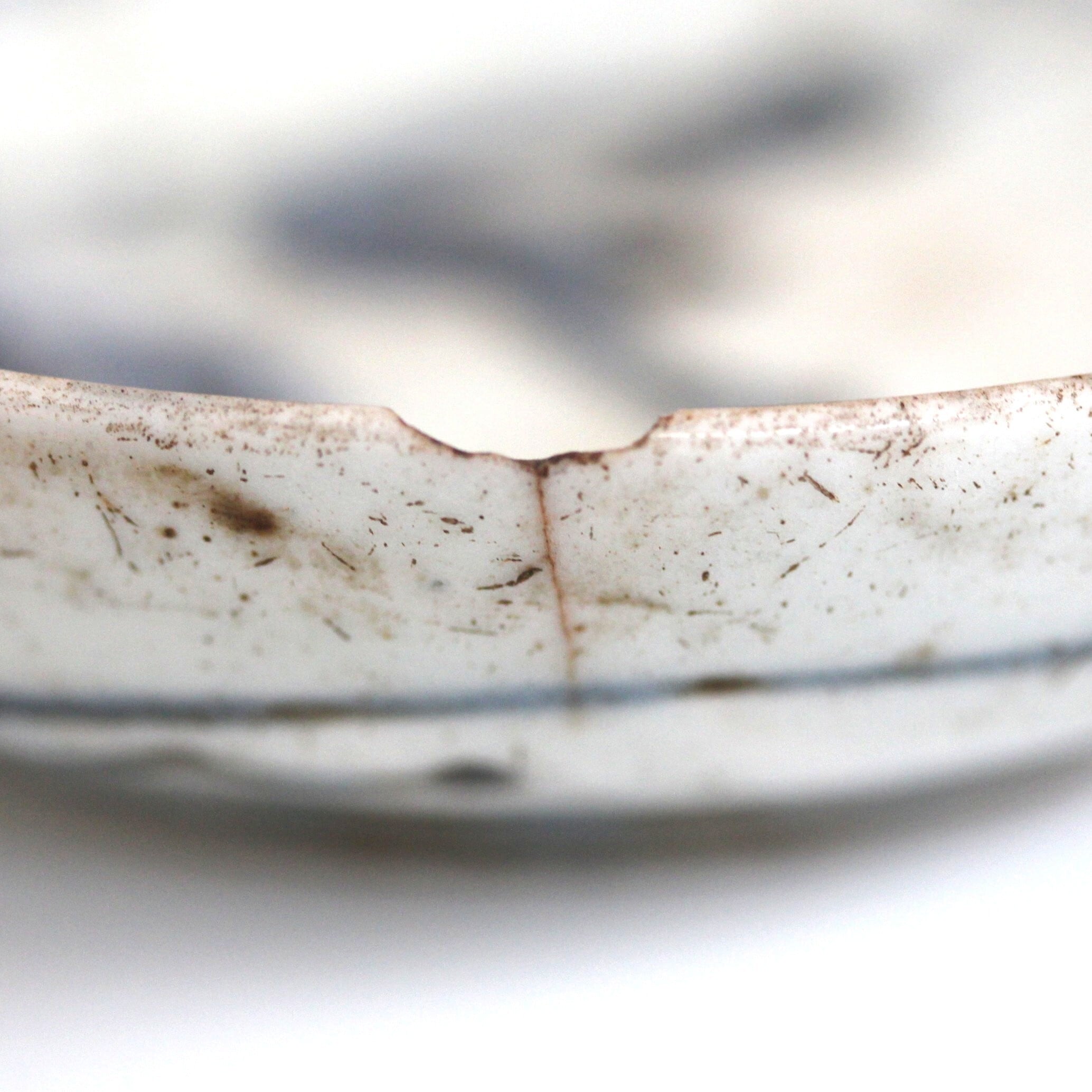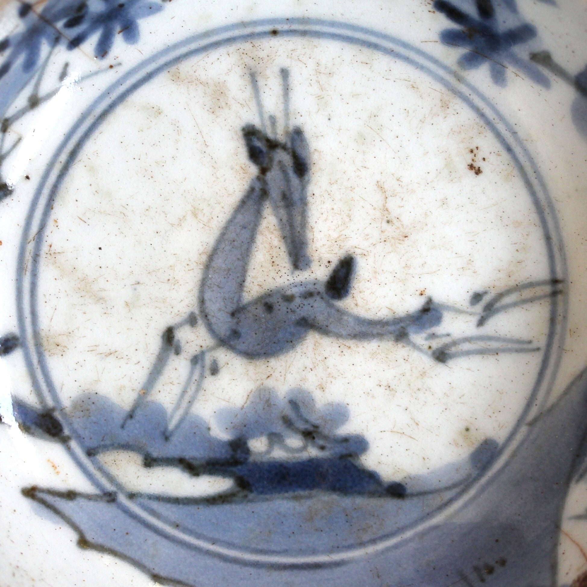 割れ欠けのある古伊万里染付鹿紅葉文深皿(その1)d12.8cm Chipped and Cracked Imari Blue and White Small Dish, Design of Deer under Momiji Maple Tree 17th-18th C | Broken and Repaired / キズトツクロイ