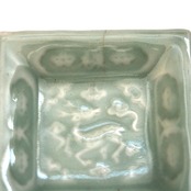 A charming celadon square small plate, with embossed design of a deer in the center. Around the deer four Chinese characters are embossed, which mean "Wine is Heaven's boon to man.".