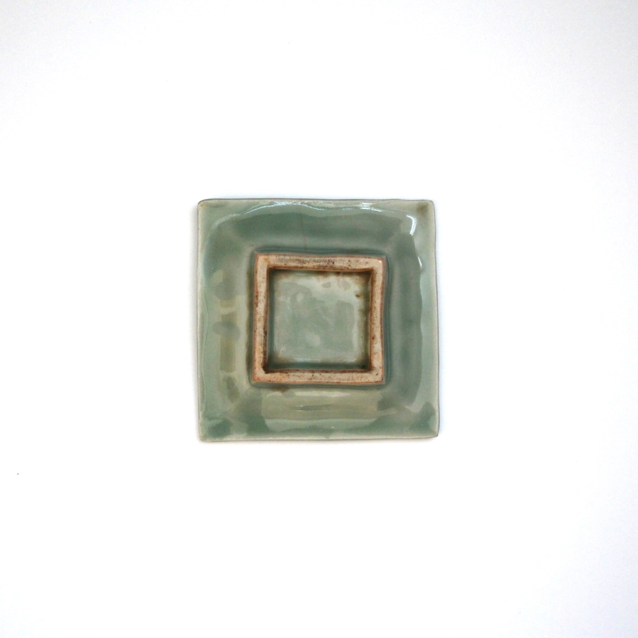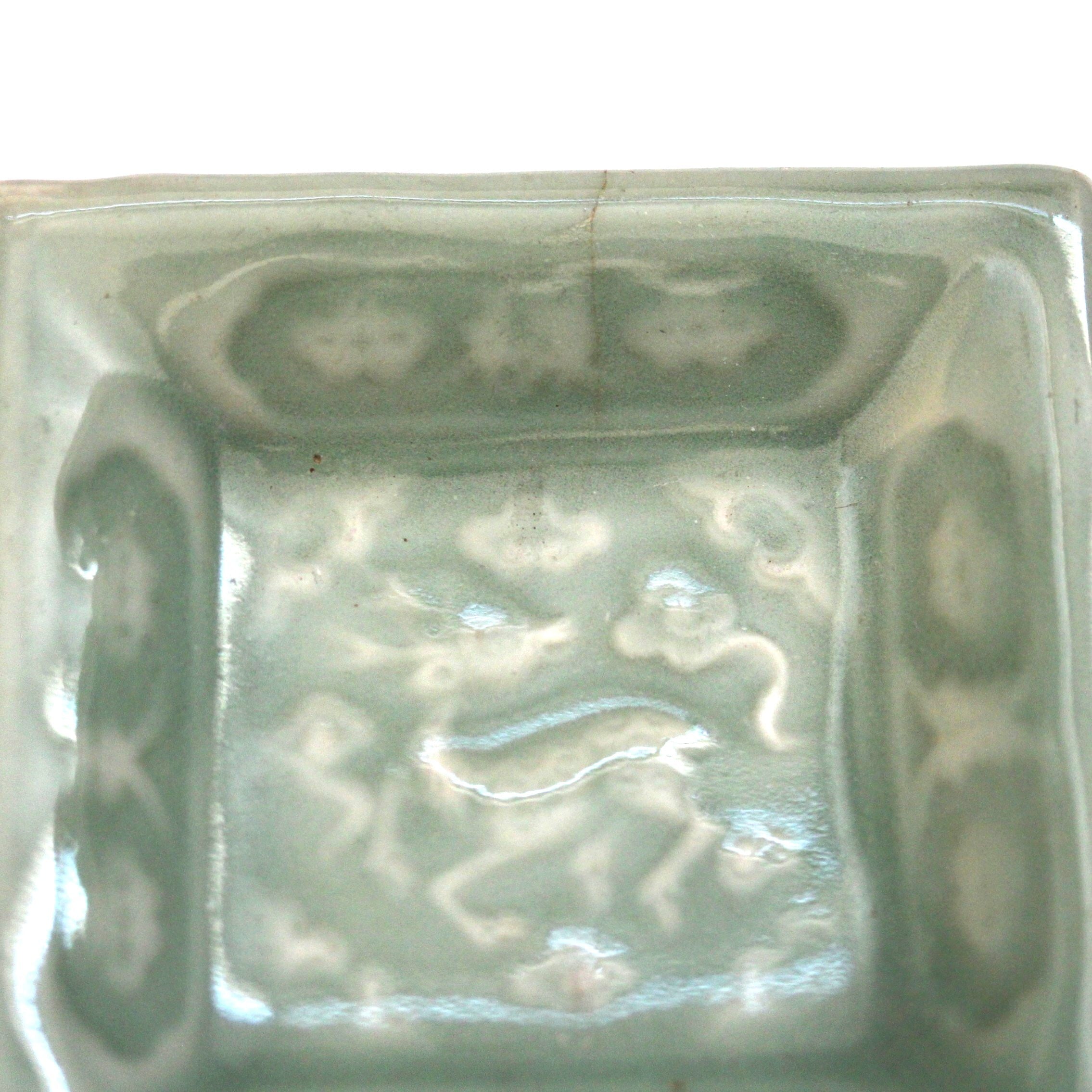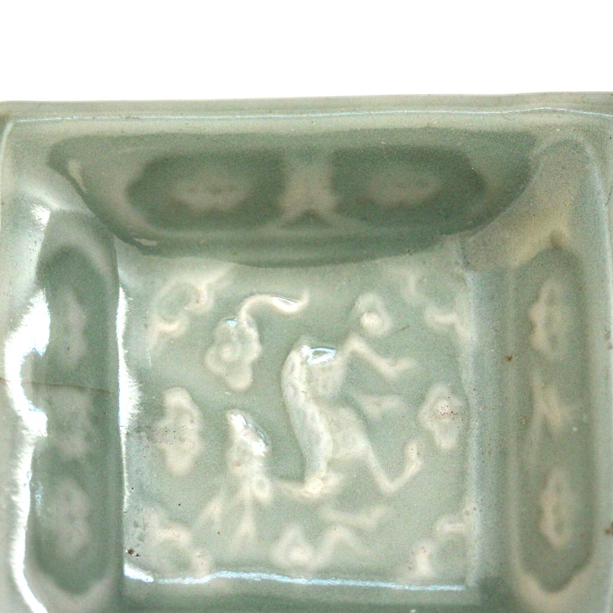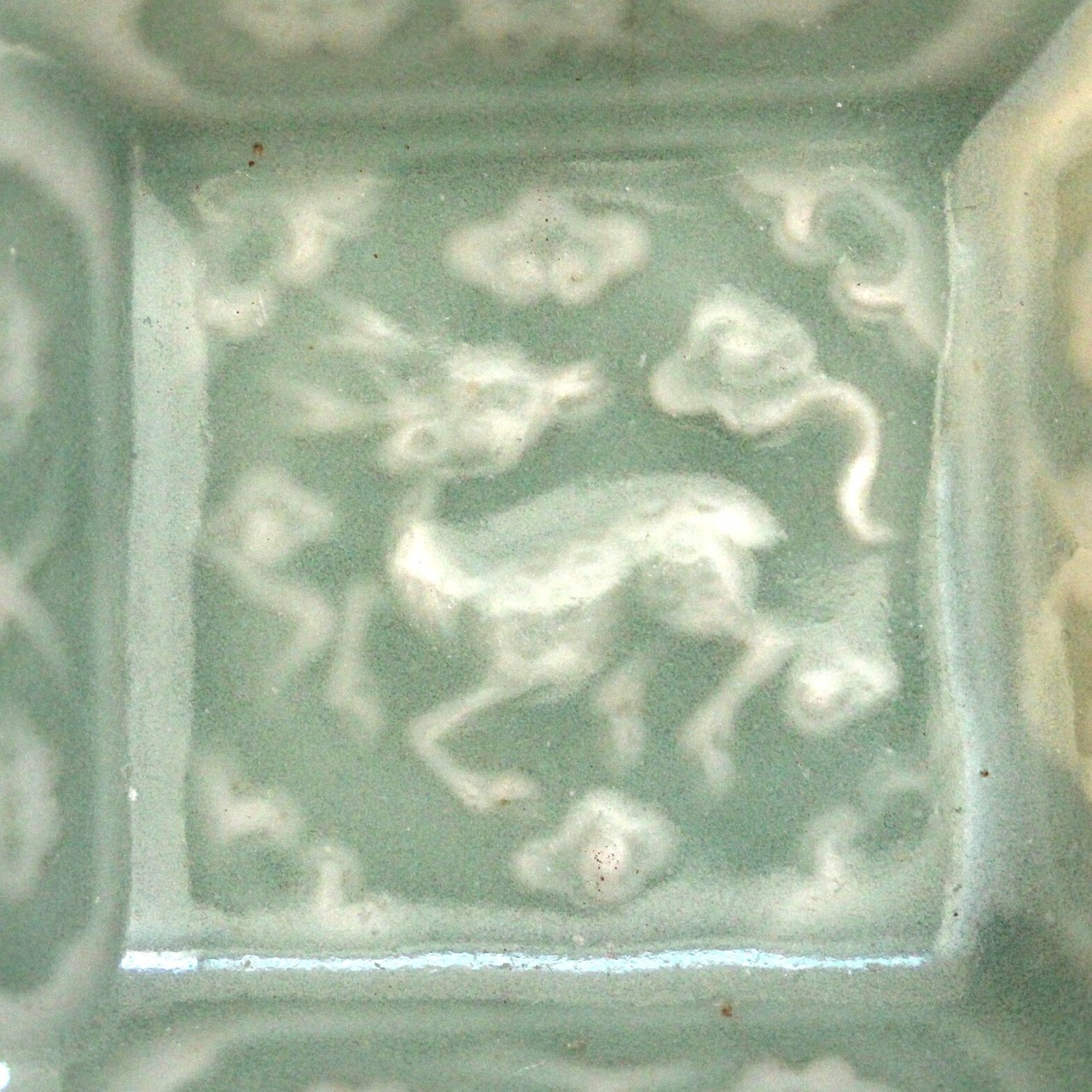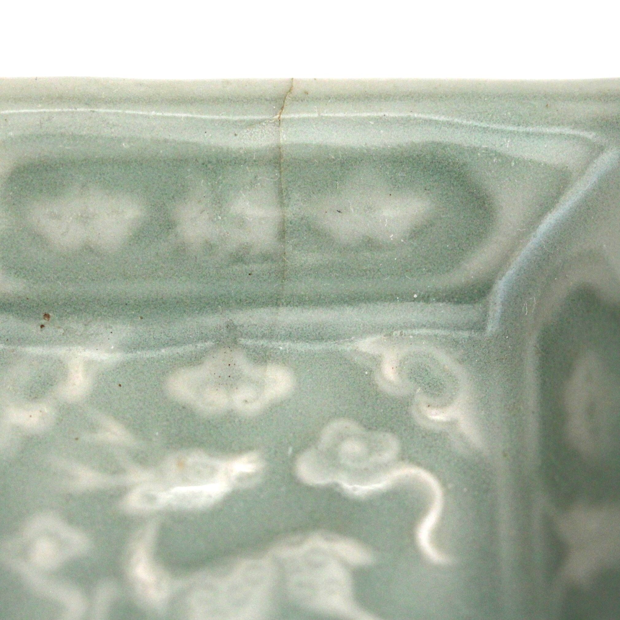 割れのある三田青磁陽刻「天之美禄」文角豆皿 d7.4cm Cracked Sanda Celadon Square Small Dish, Embossed Design of Deer and Four Chinese Characters 19th C | Broken and Repaired / キズトツクロイ