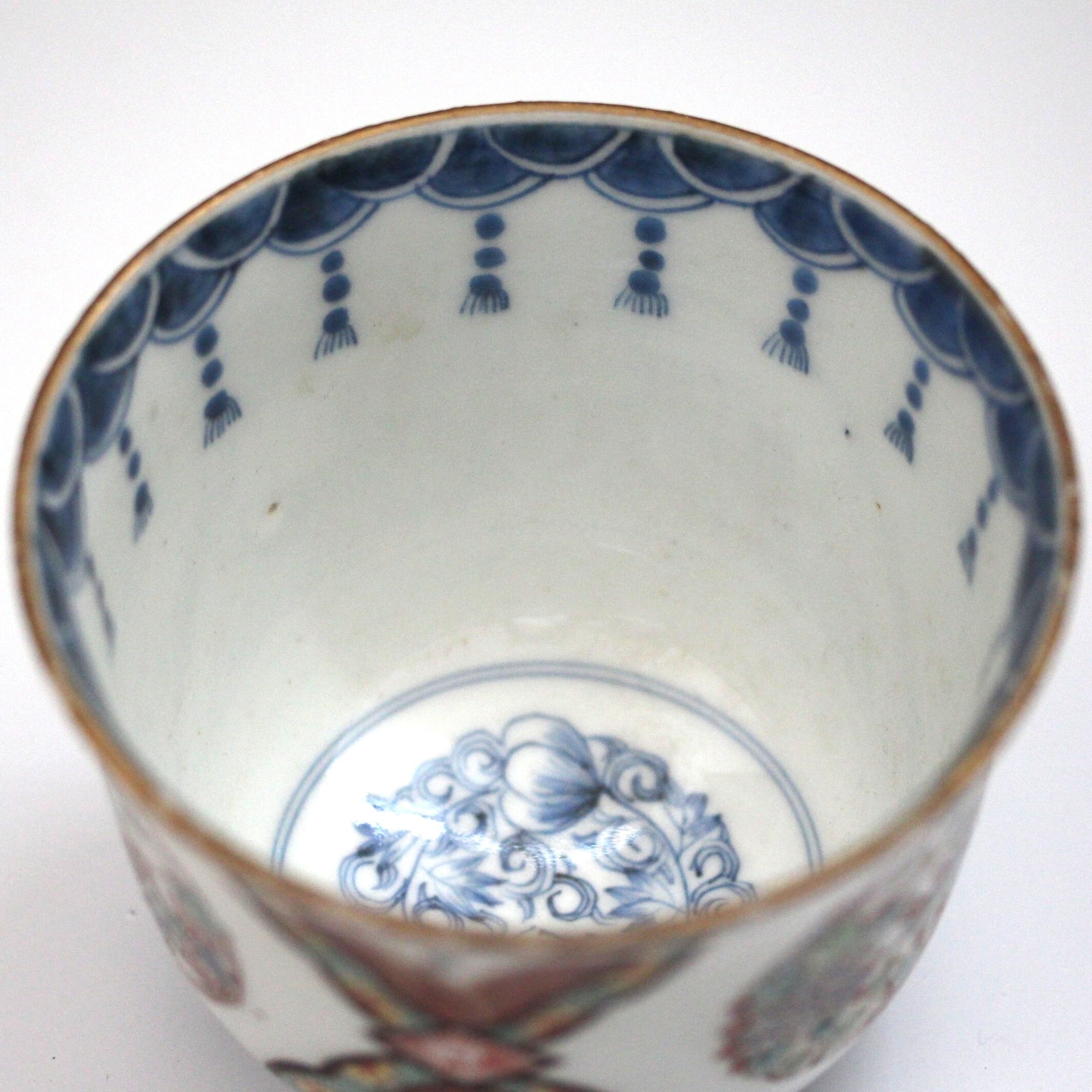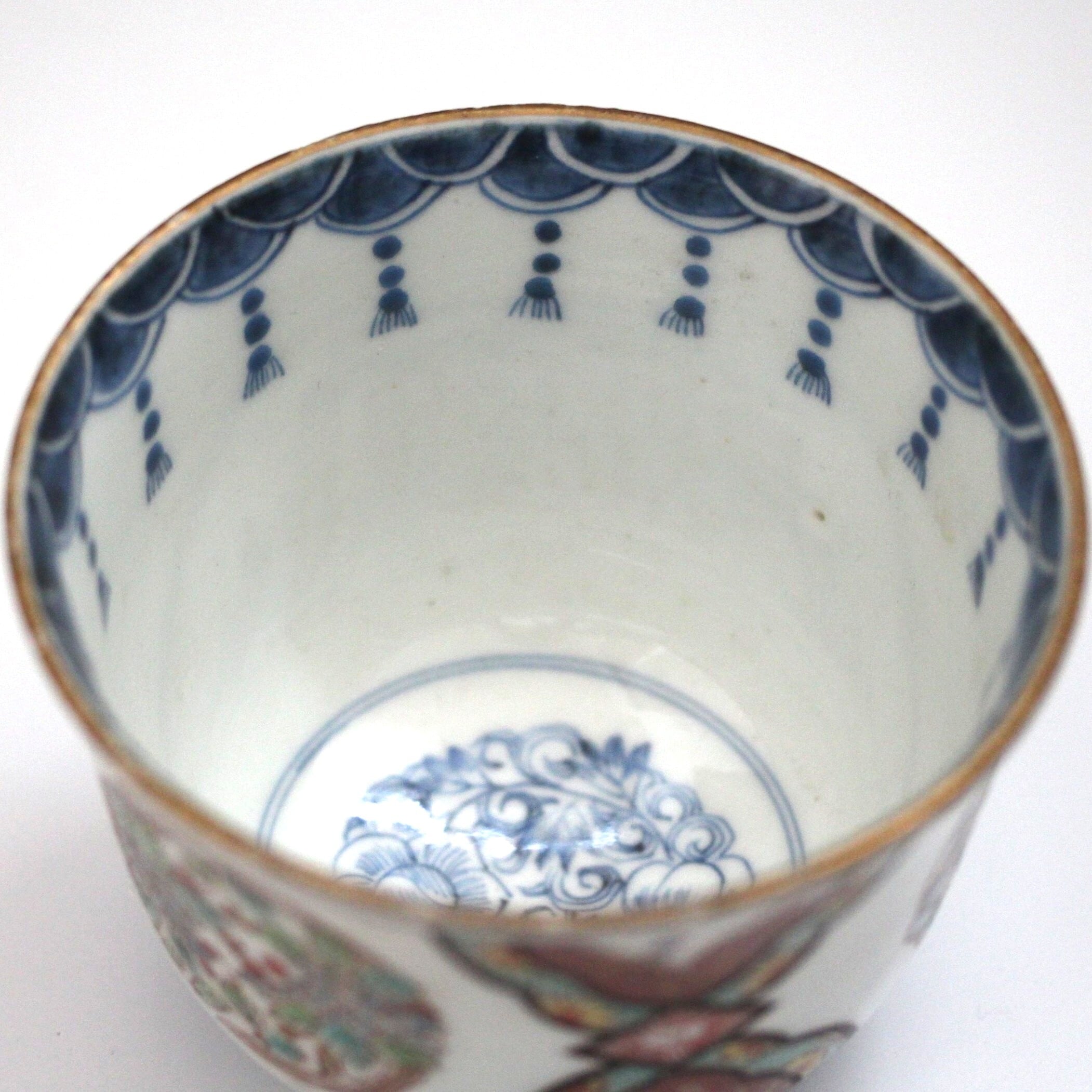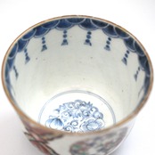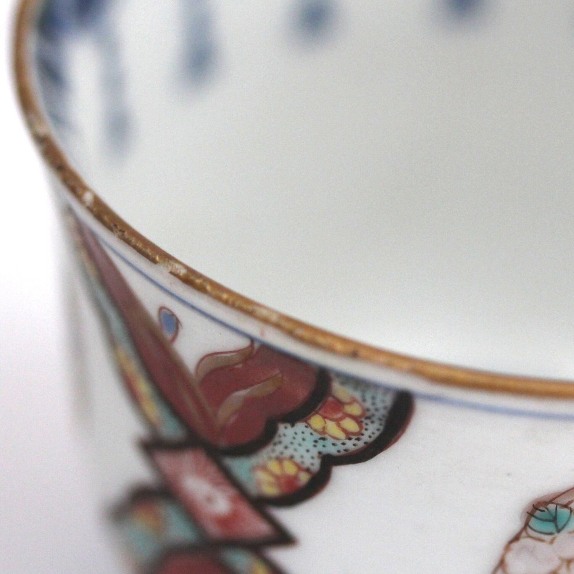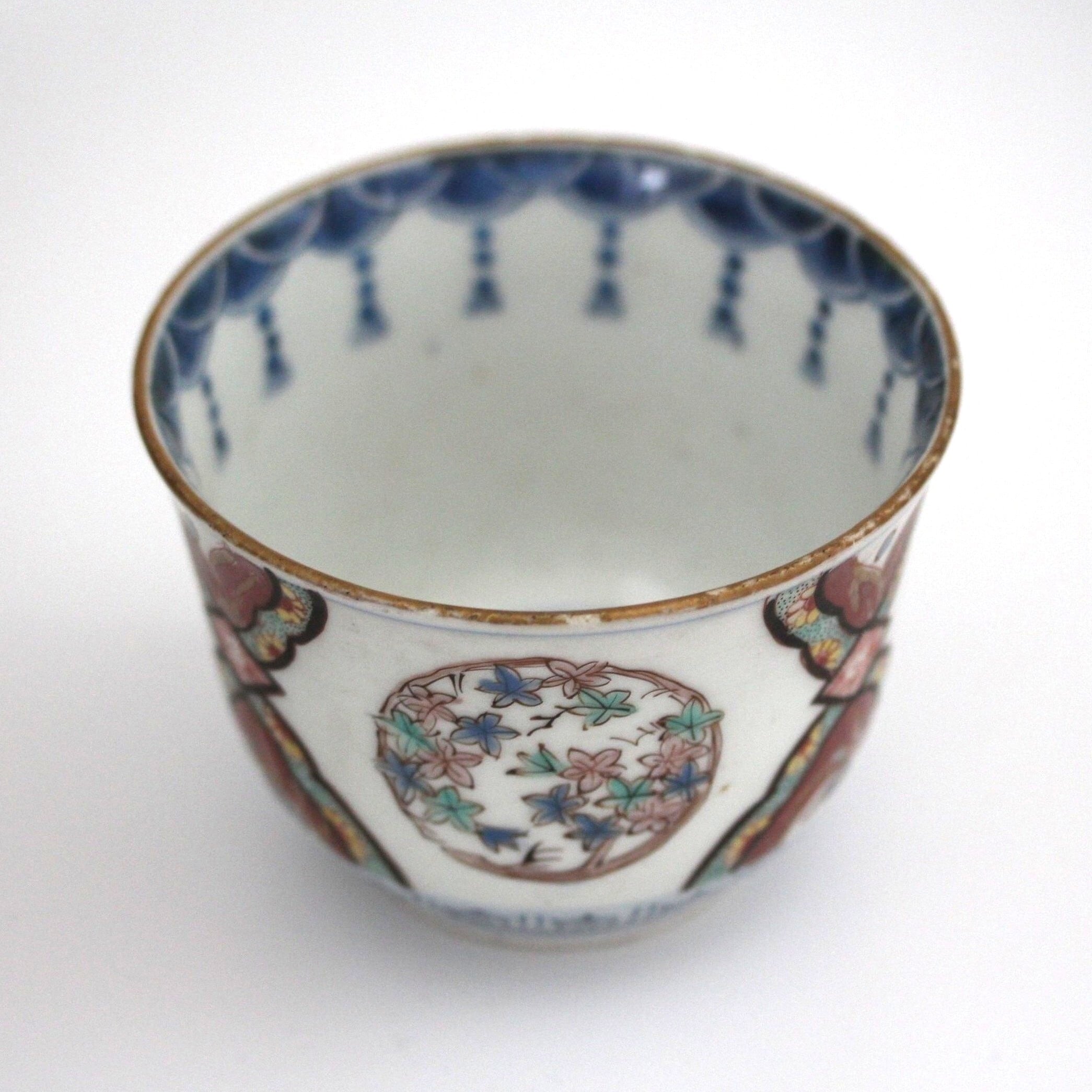 小さな欠けのある古伊万里色絵紅葉花卉瓔珞文猪口 d9.4cm Minor Chipped Imari Polychrome Cup, Design of Momiji Maple Leves and Flowers, and Yoraku Pattern 19th C | Broken and Repaired / キズトツクロイ