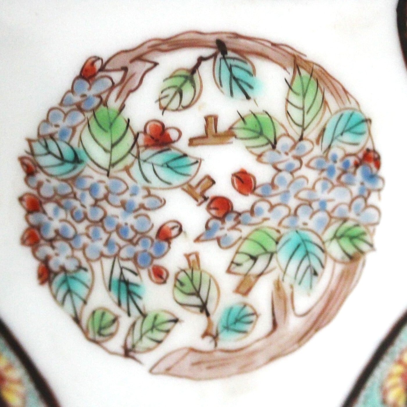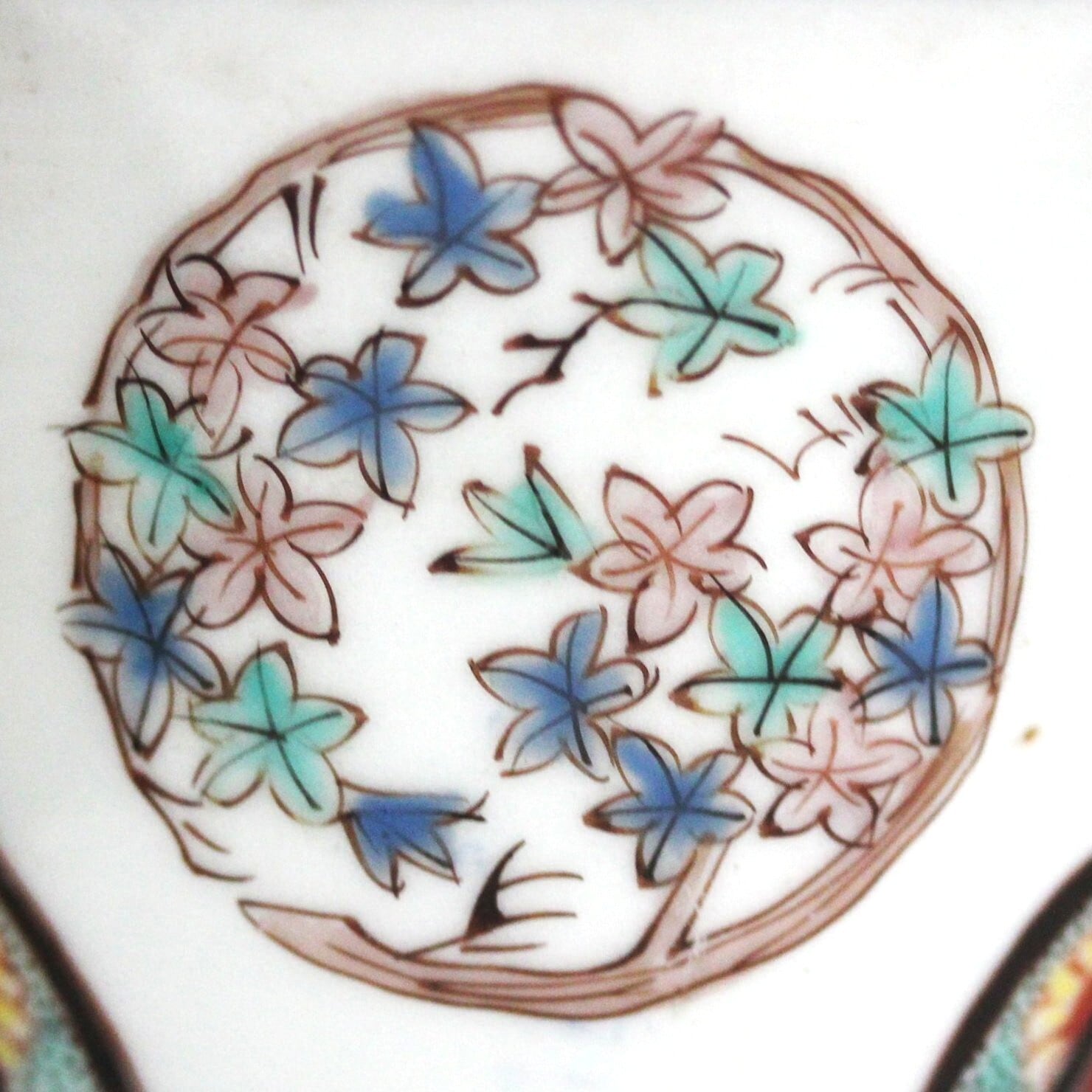 A charming polychrome porcelain cups, with design of momiji maple leaves, hydrangeas and camellias in circle window painted in overglaze color enamels, while yoraku pattern in underglaze blue. Gold bordered around the rim.
