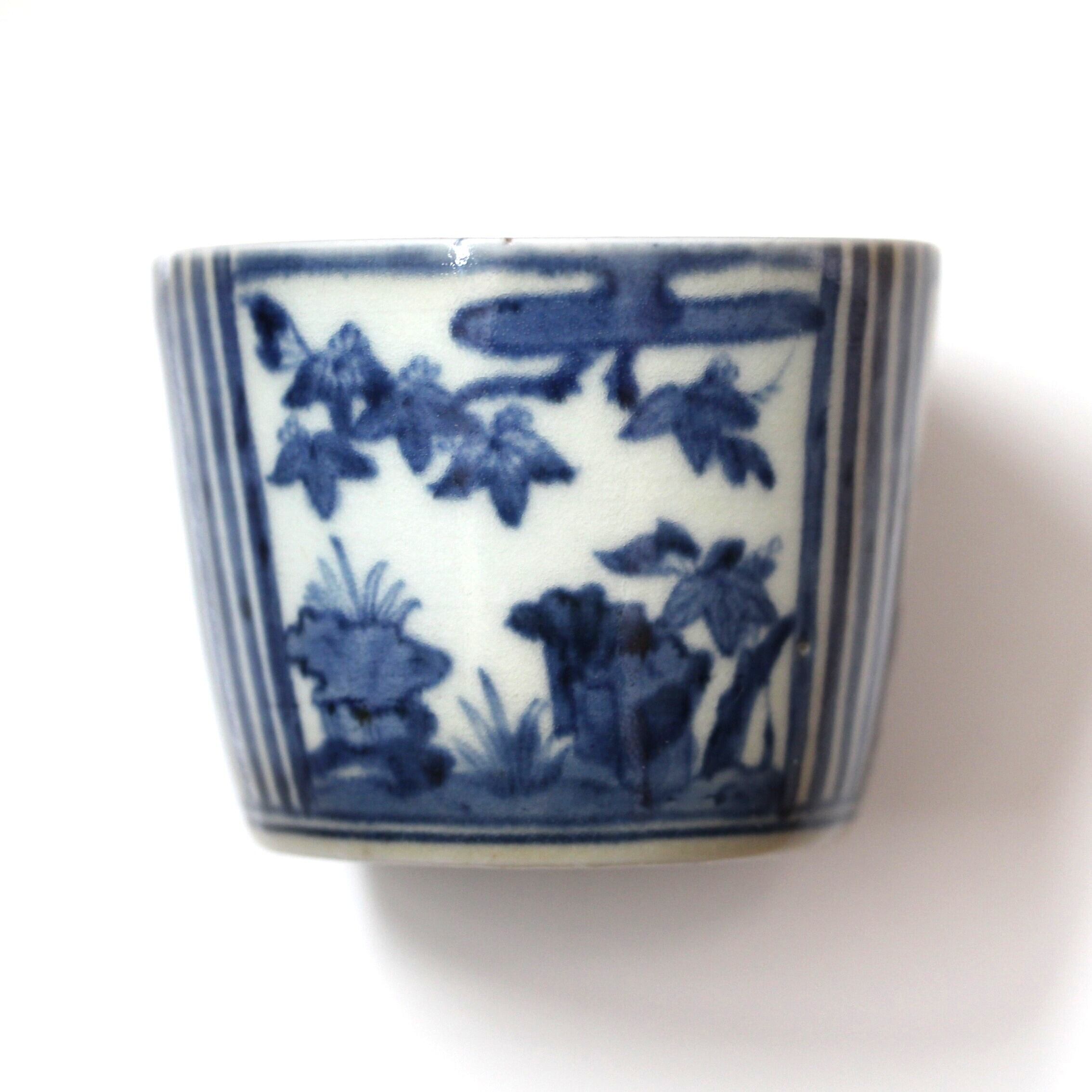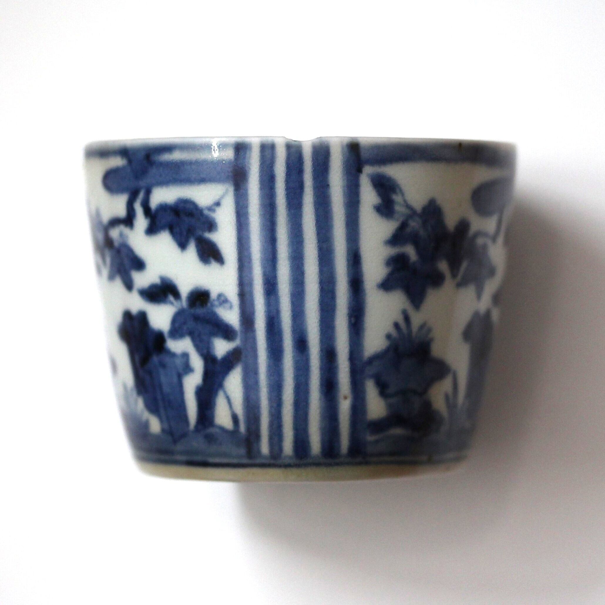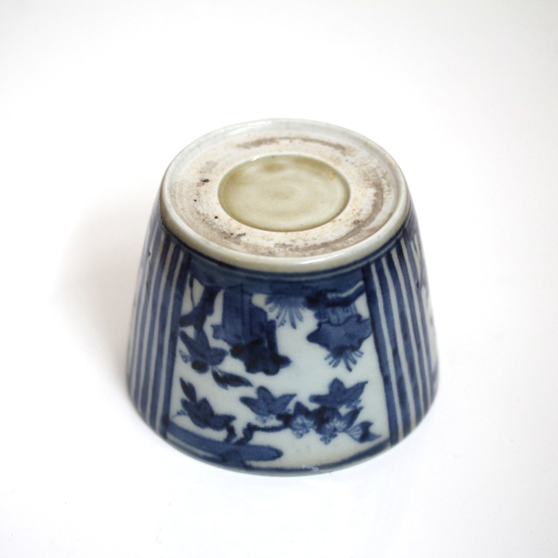 小さな欠けのある古伊万里染付桐縦縞文猪口 d8.8cm Minor Chipped Imari Blue and White Cup, Paulownias Design and Vertical Stripes 18th C