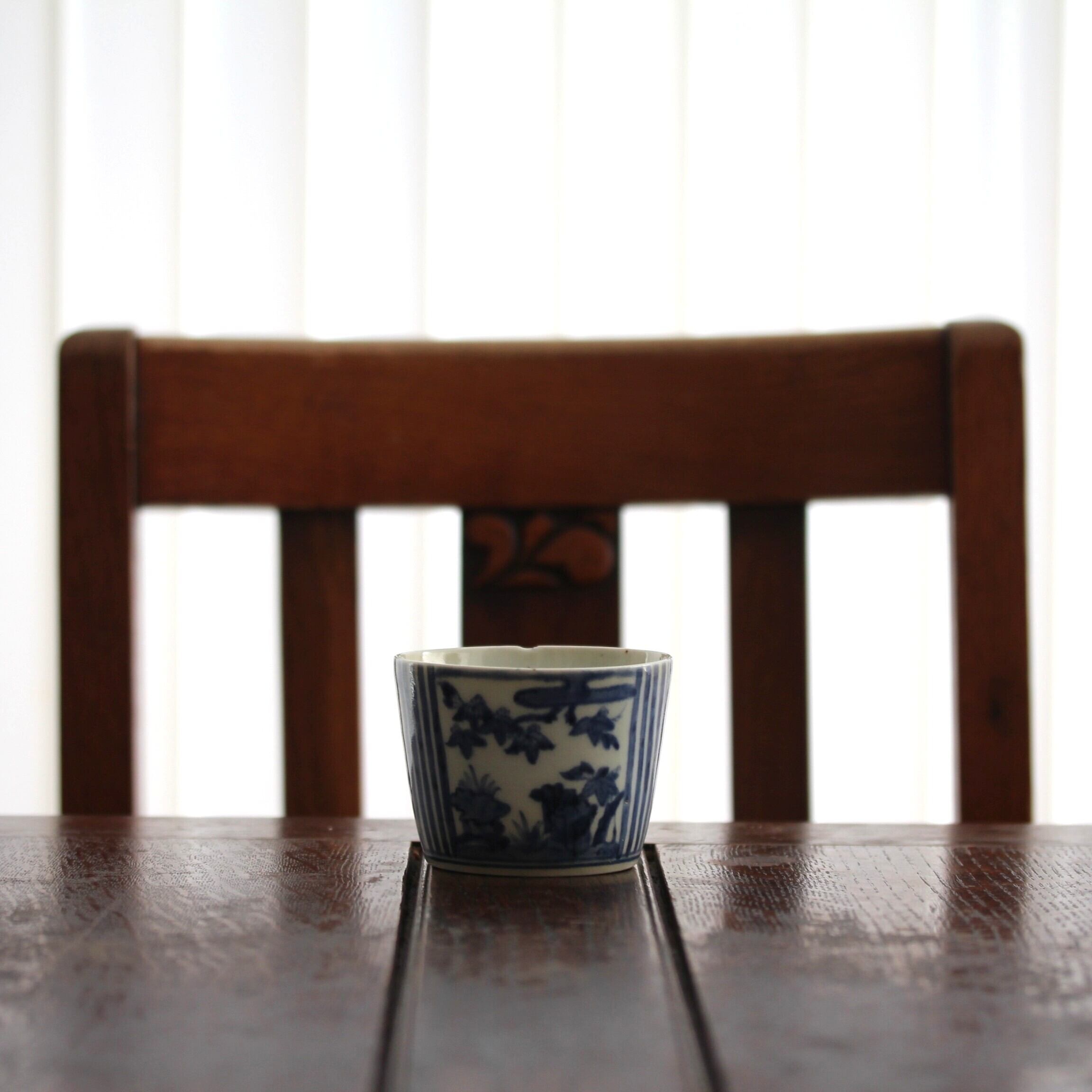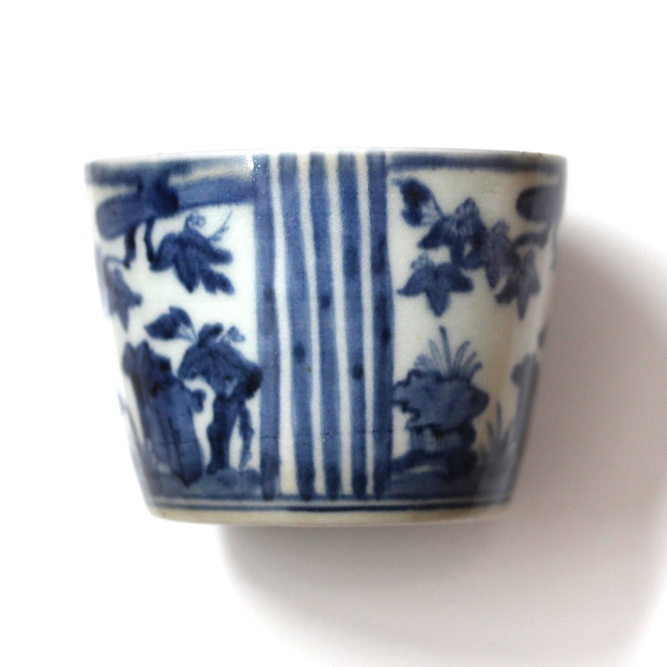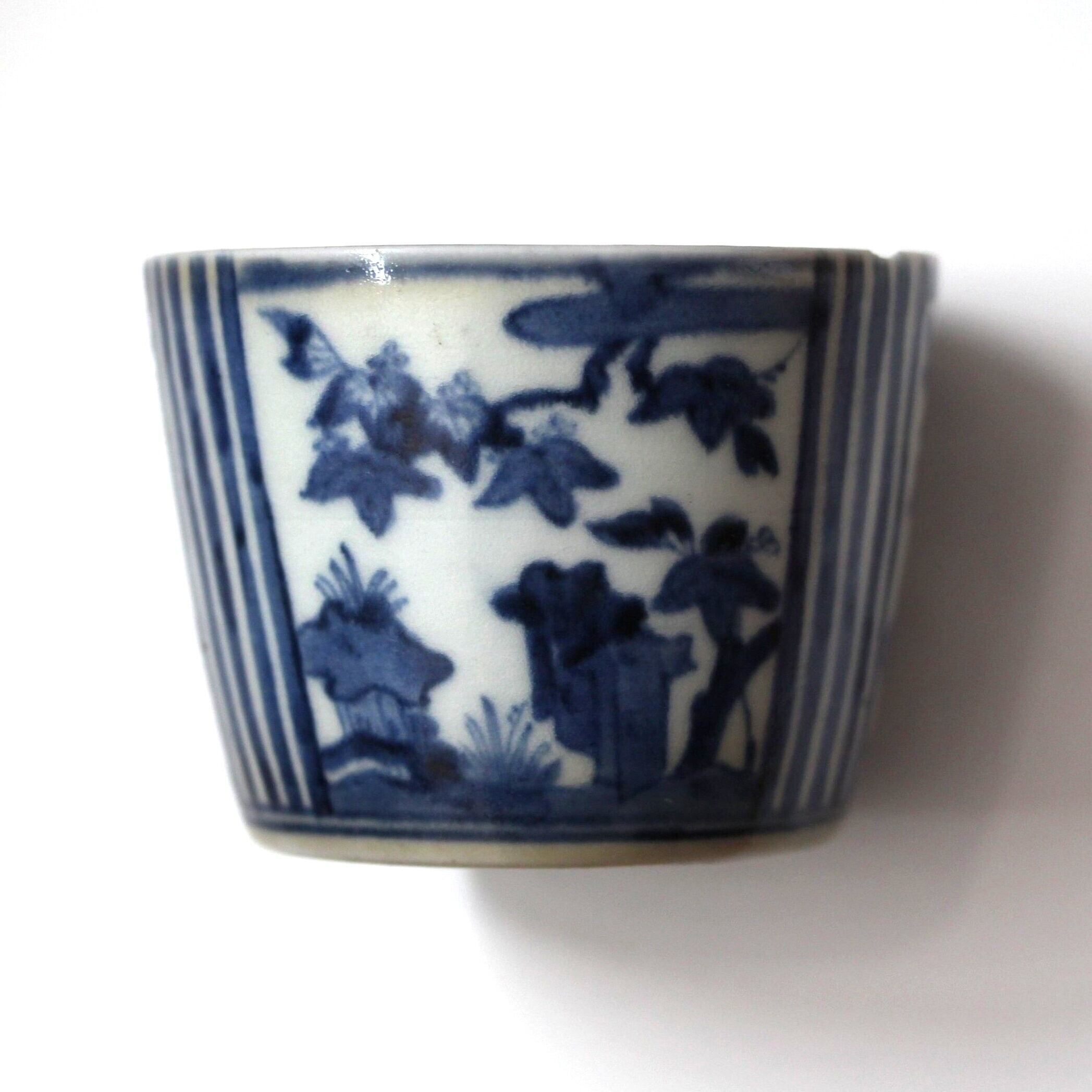 小さな欠けのある古伊万里染付桐縦縞文猪口 d8.8cm Minor Chipped Imari Blue and White Cup, Paulownias Design and Vertical Stripes 18th C