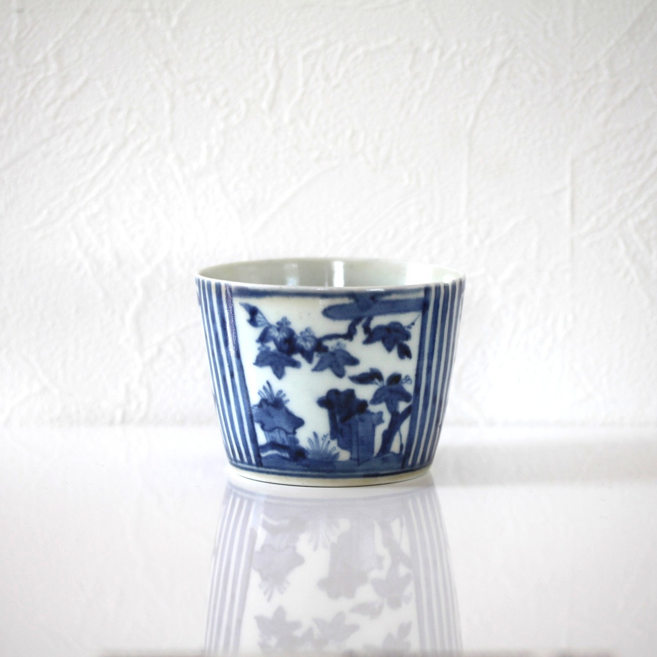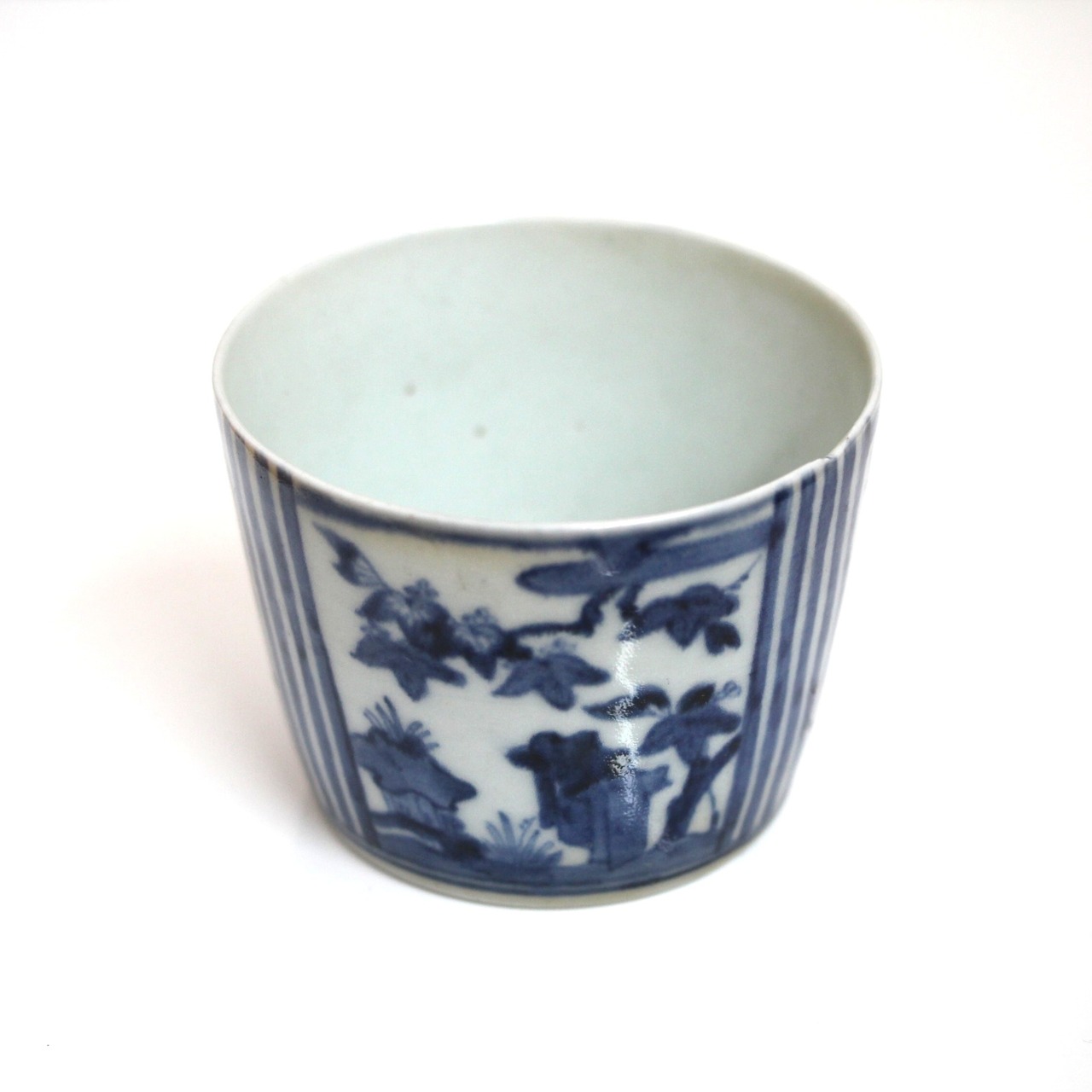A charming blue and white sobachoko style cup, with paulownias design and vertical stripes pattern.