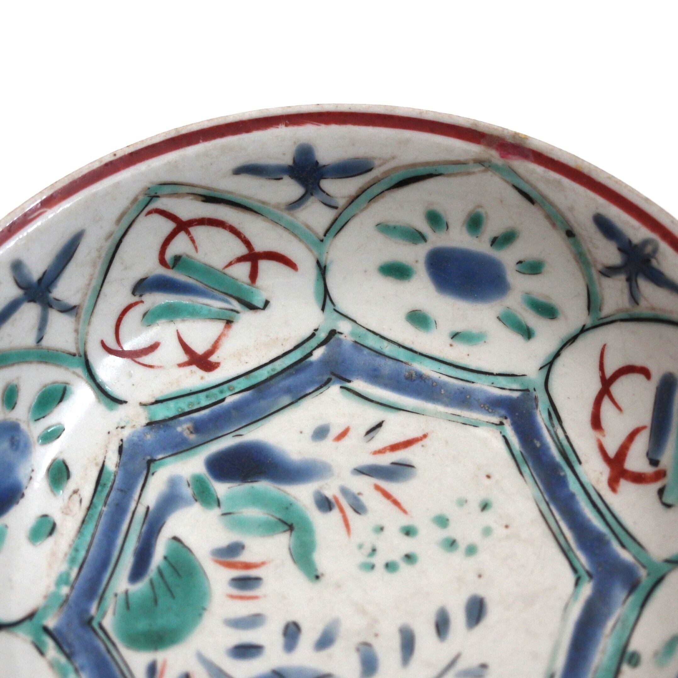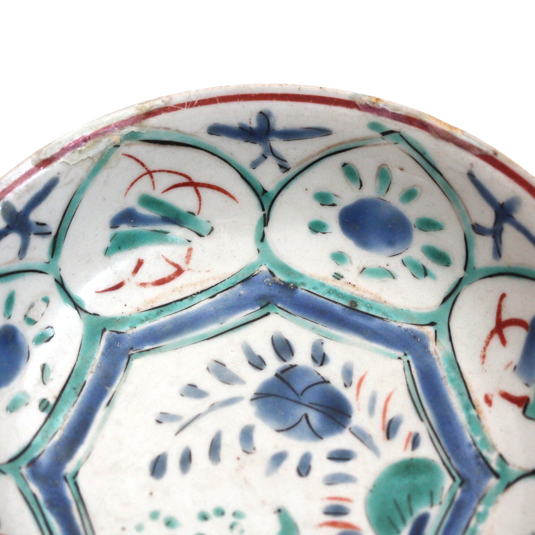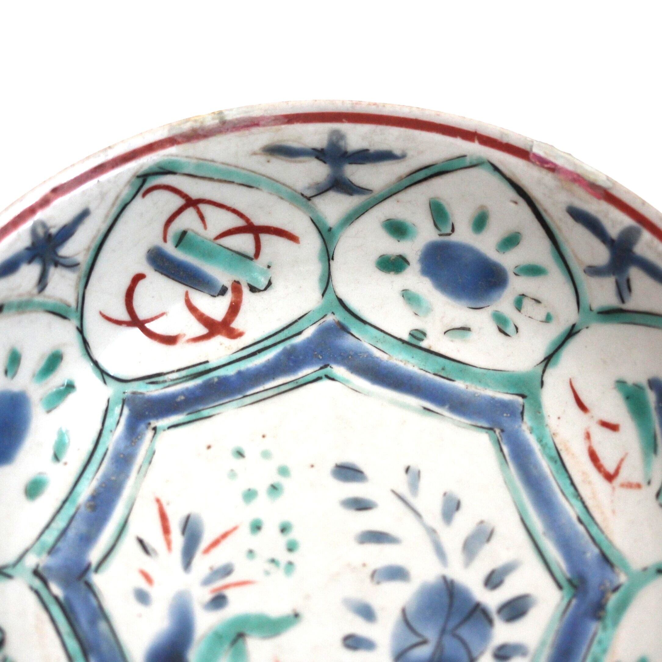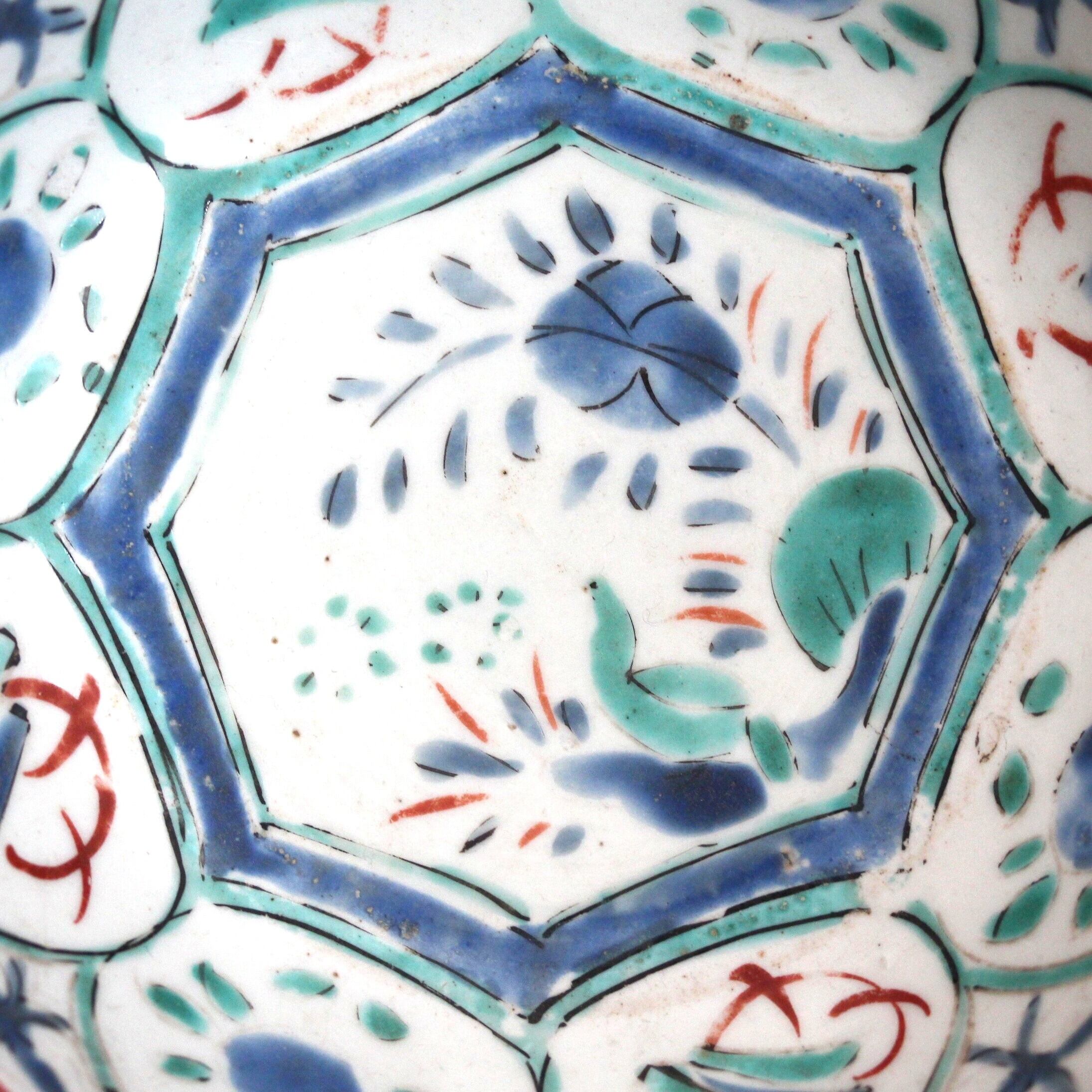 A charming enameled porcelain small dish, in early Kaikemon style, with Kraak pattern. A waterfowl is painted in the center, and treasures and flowers are painted in the windows around.