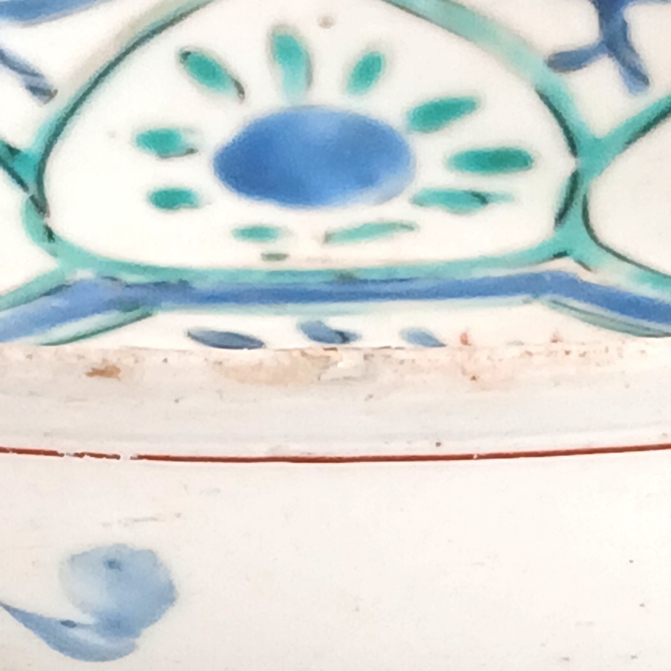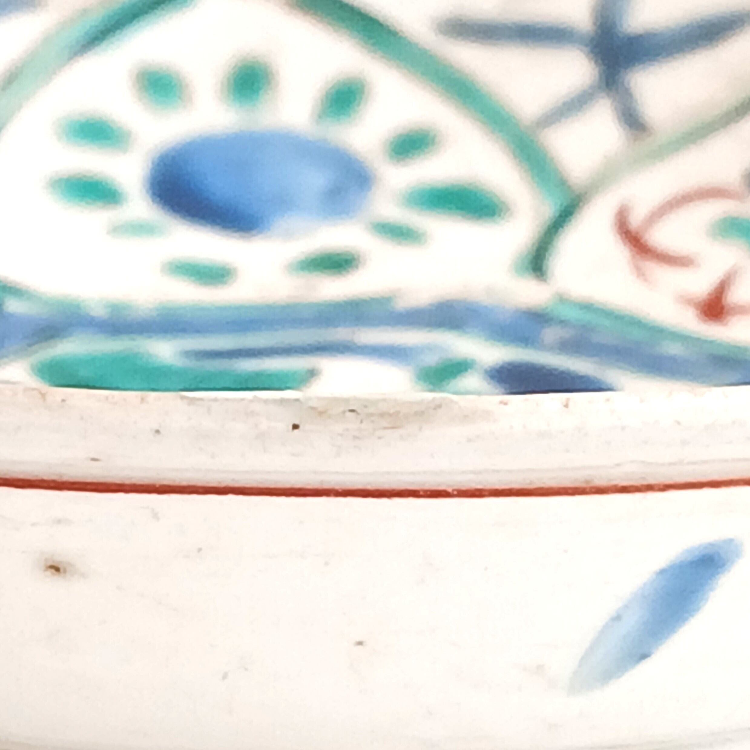 口縁の欠けを補修いし、肌を白く色合わせし、さらに筆を加えてオリジナルの文様に合わせています。昭和時代の補修でしょう。数十年が経ち、補修箇所には経年による変色が見られ、その箇所が以前よりもわかりやすくなっているのですが、実際の欠けの大きさは、補修で色合わせされた面積よりも小さいように思われます。