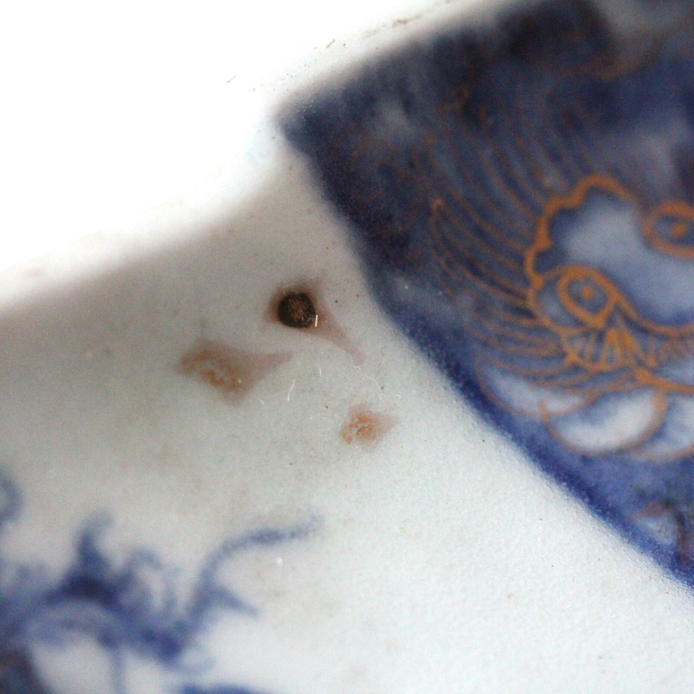 金繕いのある古伊万里染付金彩結文形皿 d27.2cm Kintsugi Repaired Imari Blue and White Knotted-Letter Shaped Dish 18th C | Broken and Repaired / キズトツクロイ