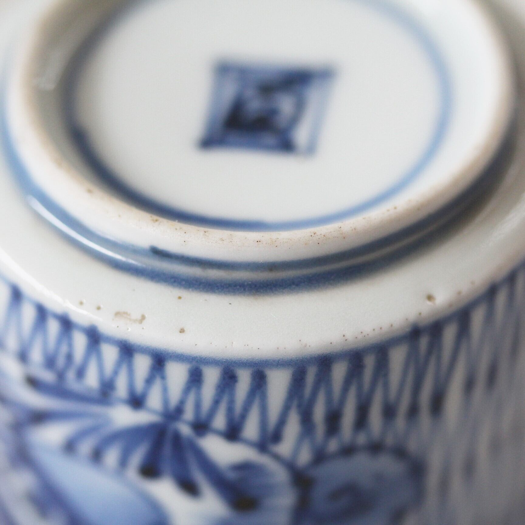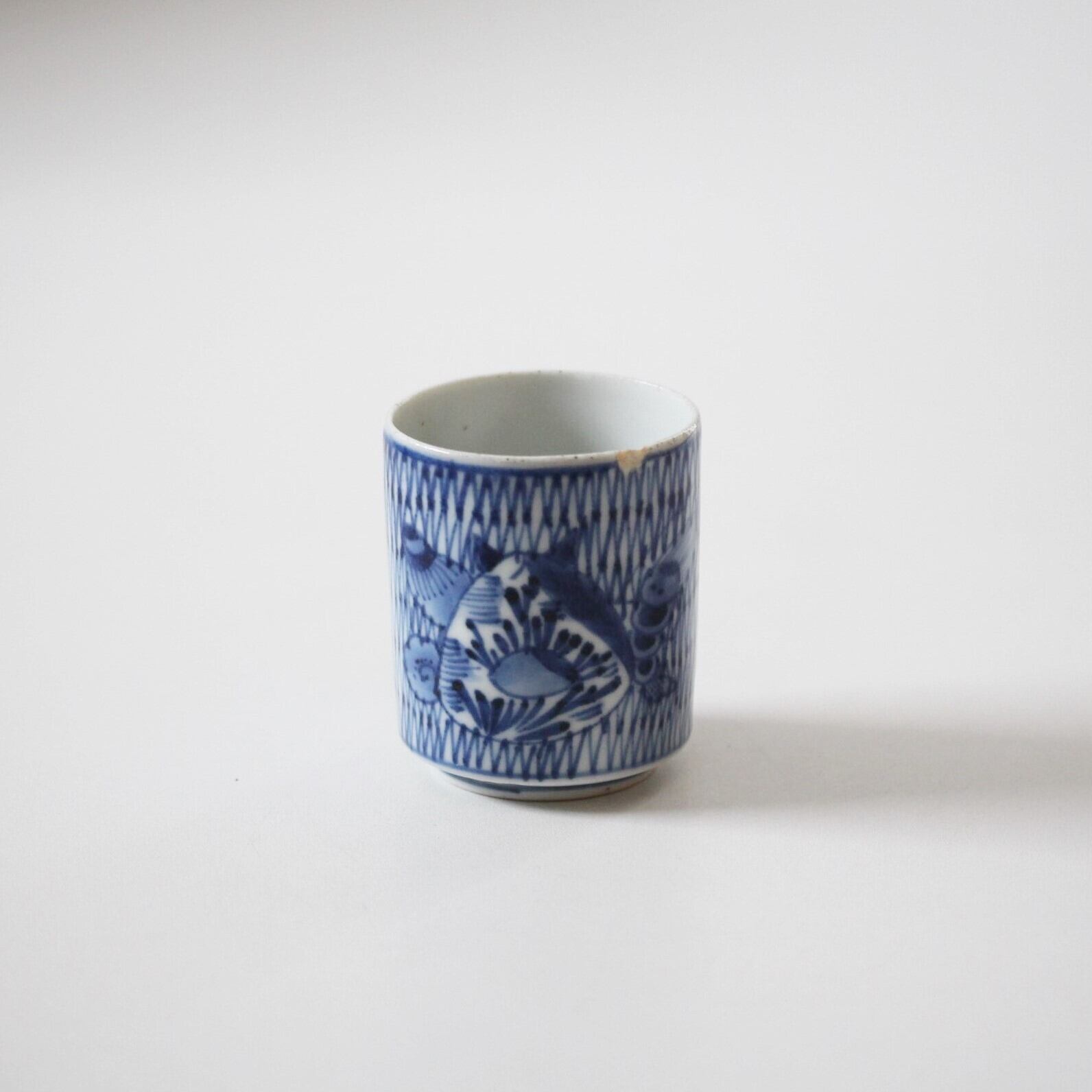 欠けのある古伊万里染付網目貝海老文猪口 d5.4cm Chipped Imari Blue and White Cup with Shell, Shrimp and Net Design 18th C | Broken and Repaired / キズトツクロイ