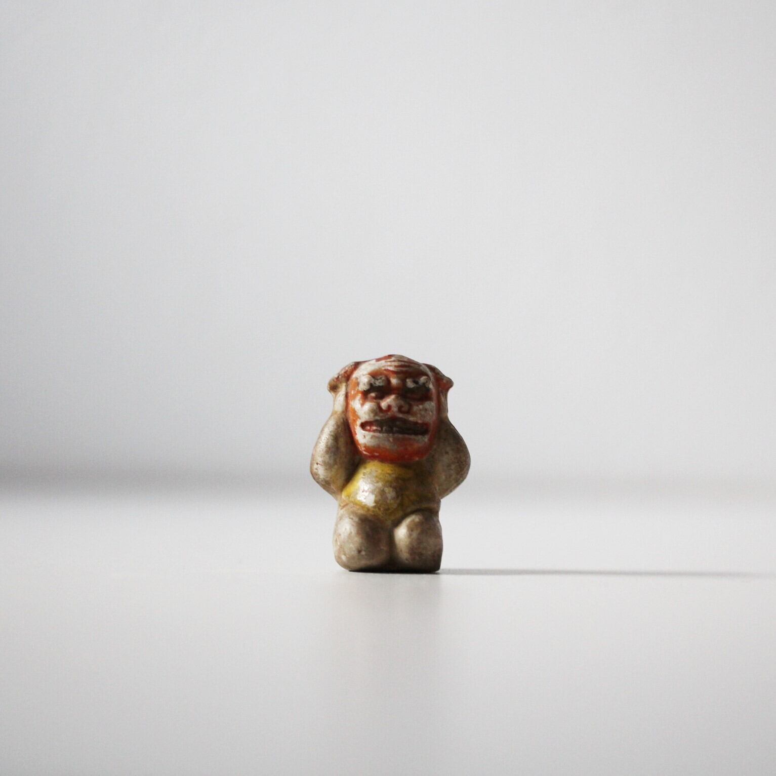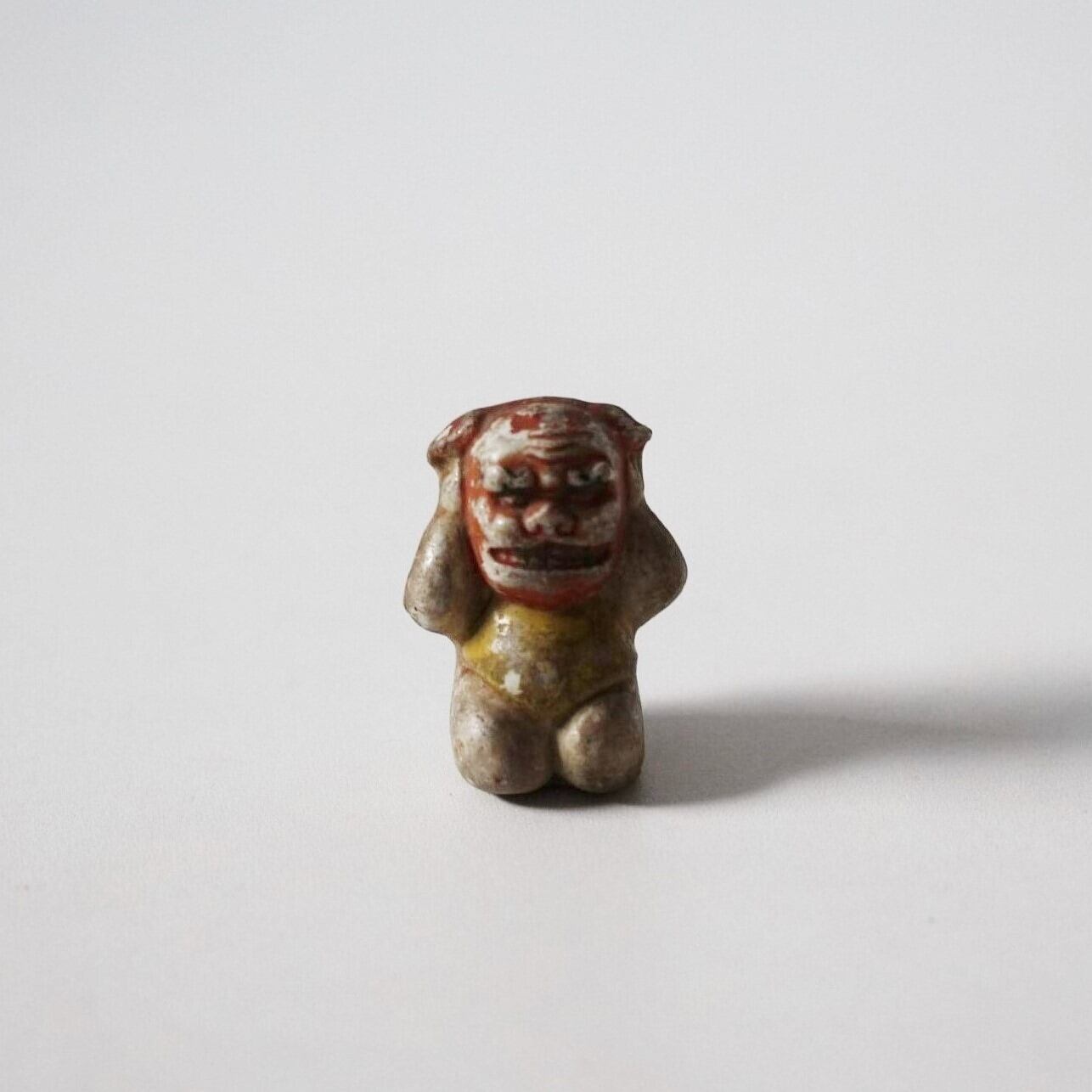 小さな欠けのある獅子舞童子人形 h4.3cm Minor chipped Enameled Figurine of Child Wearing Lion Mask 20th C | Broken and Repaired / キズトツクロイ