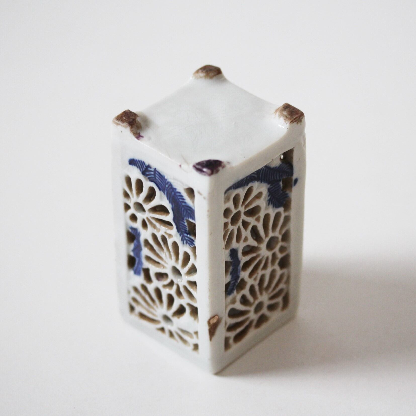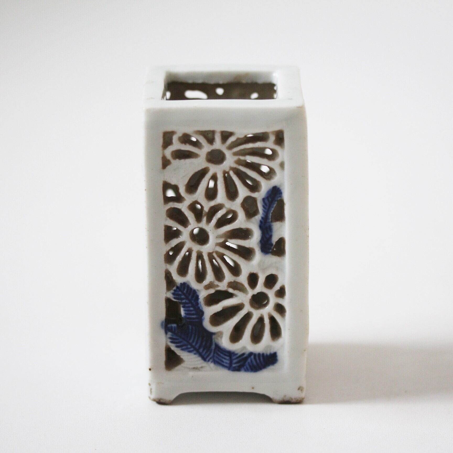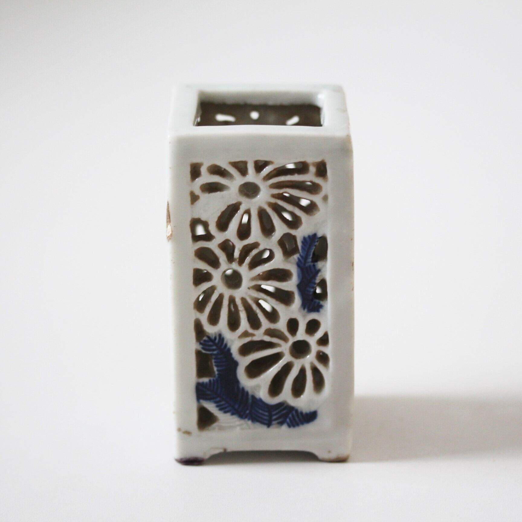 欠けのある染付菊花透かし角箸立て h9.6cm Chipped Blue and White Square Chopstick Stand with Chrysanthemum Openwork 19th-20th C | Broken and Repaired / キズトツクロイ