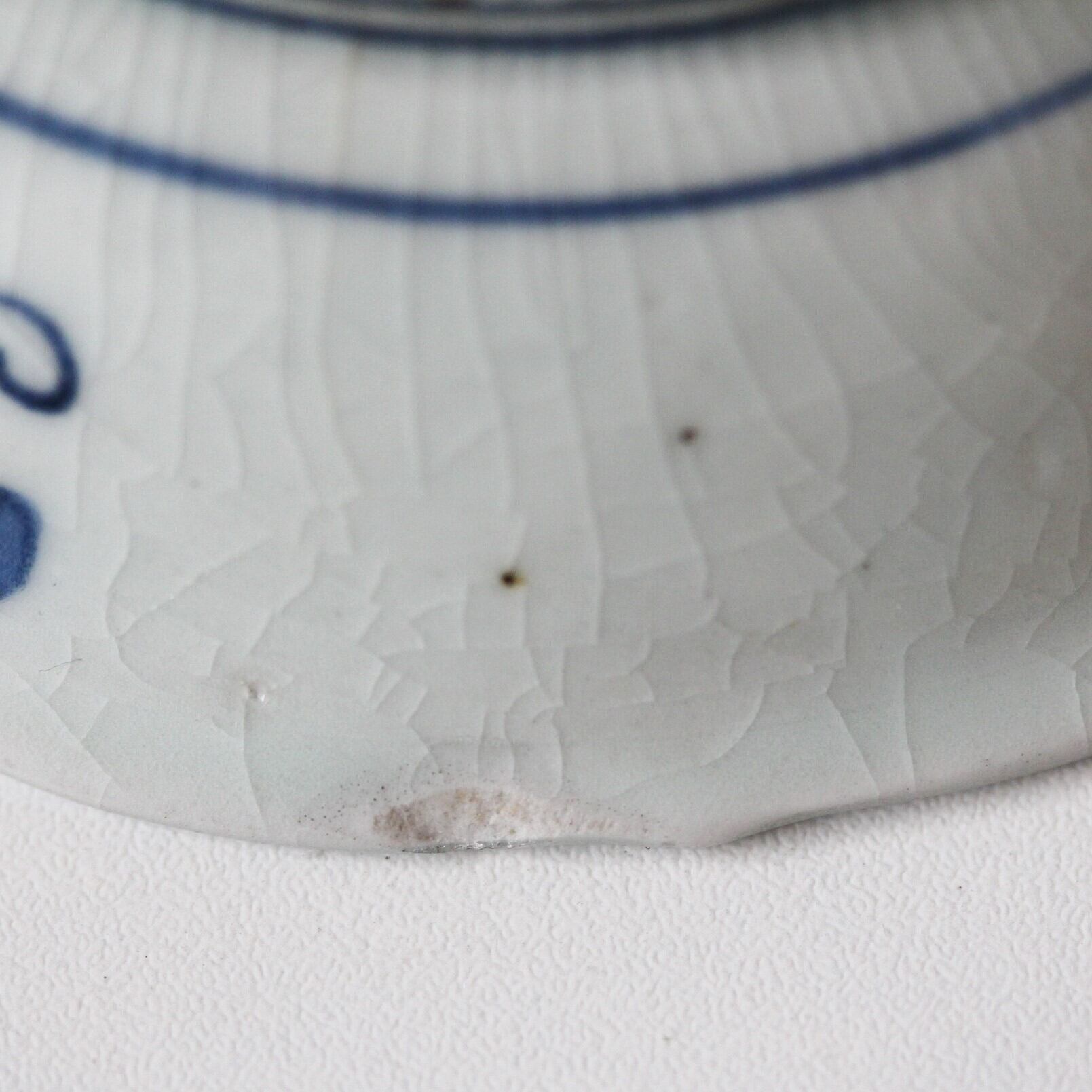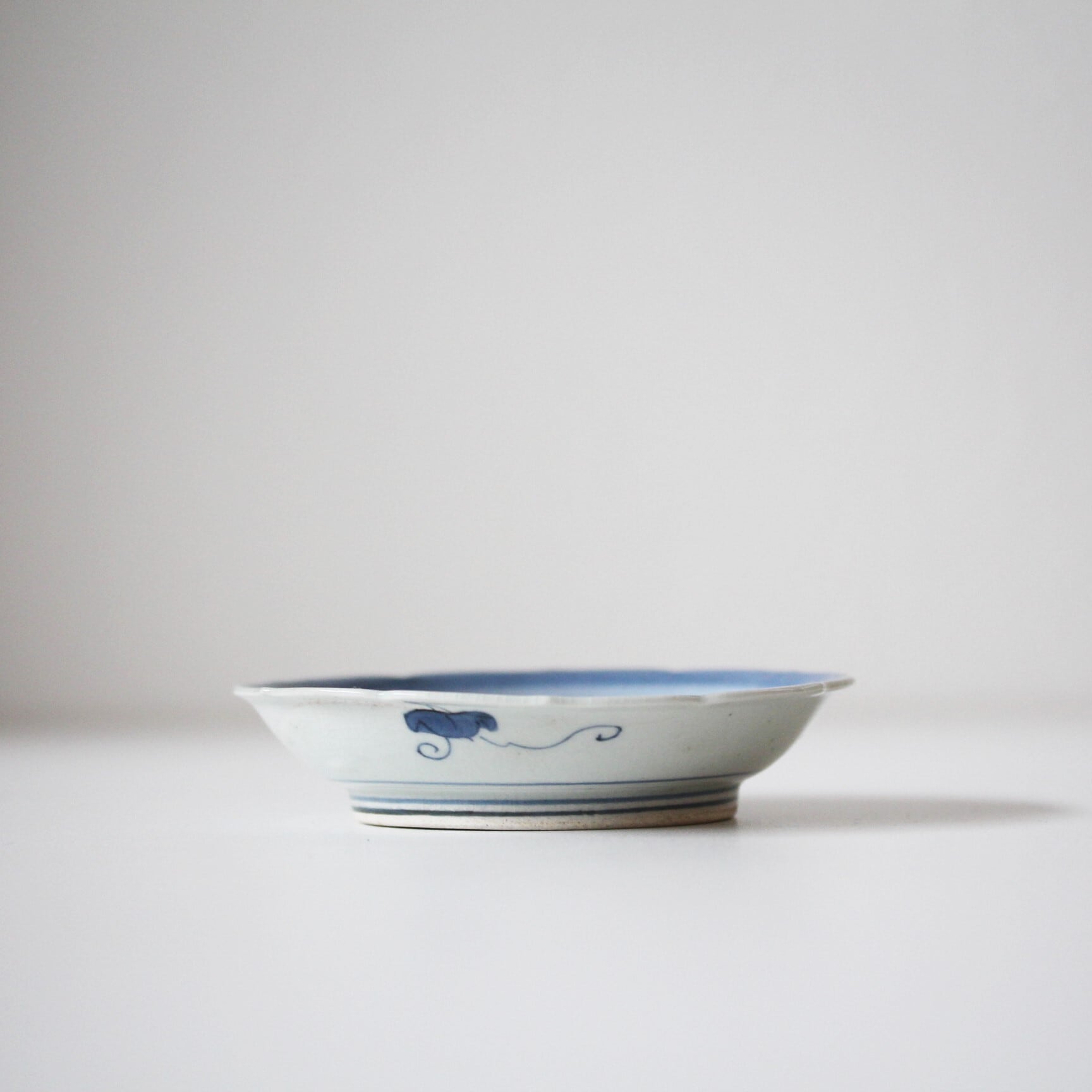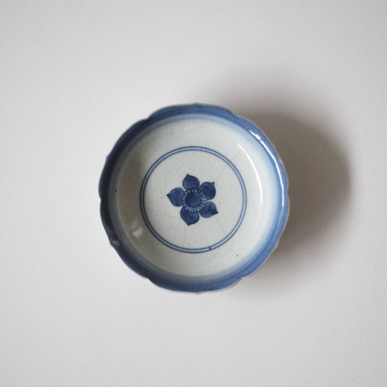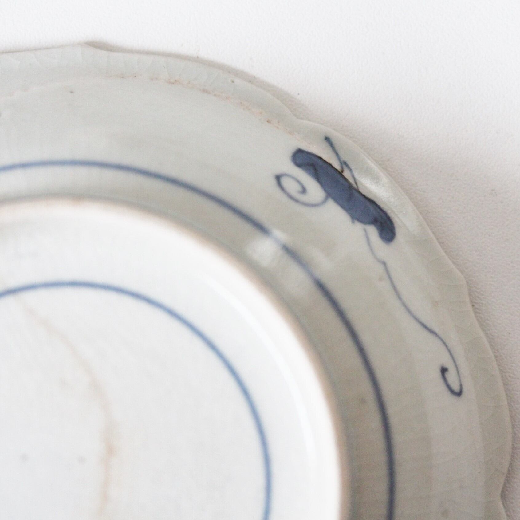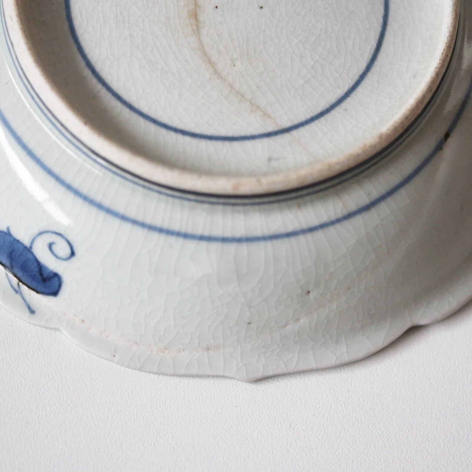 割れ欠けのある古伊万里染付鉄線文輪花小皿 d12.0cm Chipped and Cracked Imari Blue and White Lobed Dish with Clematis Design 17th C | Broken and Repaired / キズトツクロイ