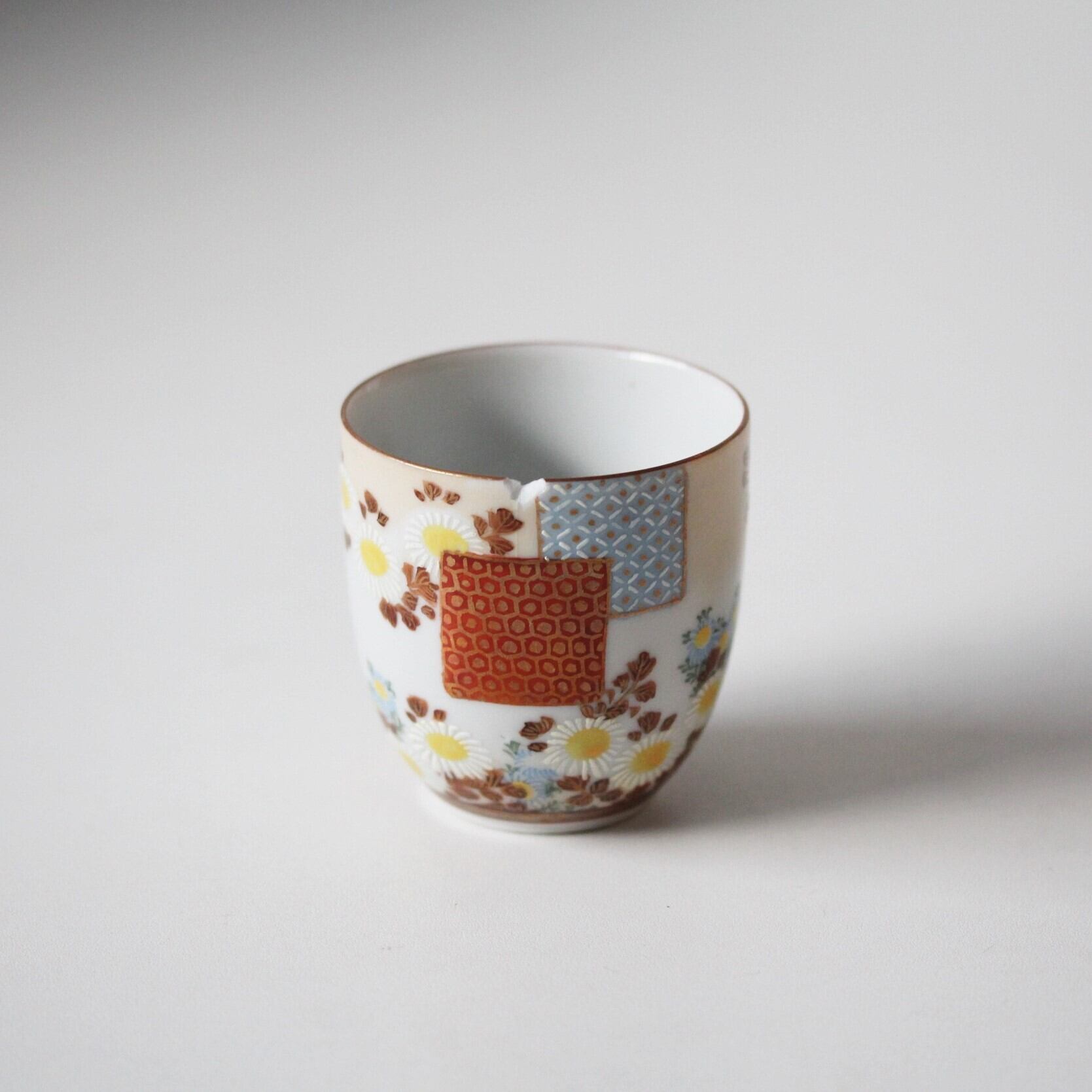 割れ欠けのある九谷色絵色紙菊文猪口(谷口製)d6.2cm Chipped and Cracked Kutani Enameled Cup with Design of Shikishi Papers and Chrysanthemums, by Taniguchi 20th C | Broken and Repaired / キズトツクロイ