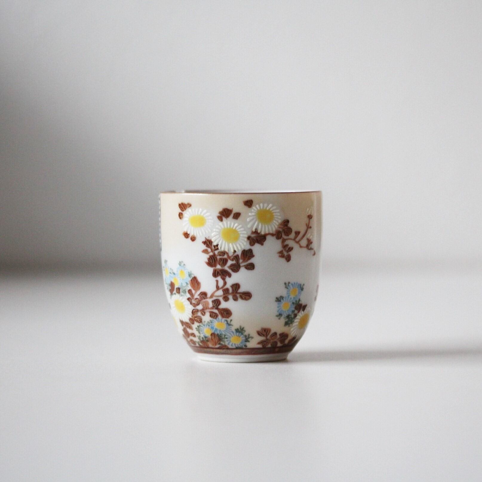 A charming enameled pocelain cup with design of shikishi papers and chrysanthemums, produced in Kutani, by Tanigichi.