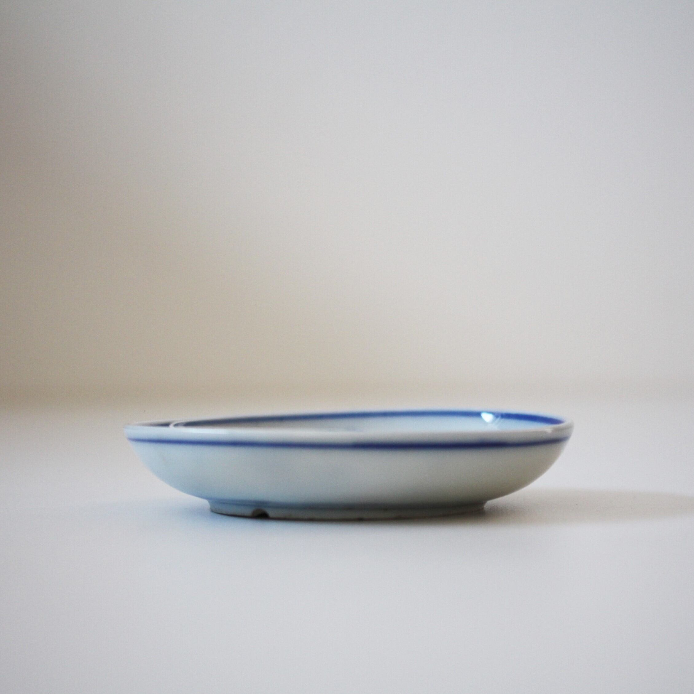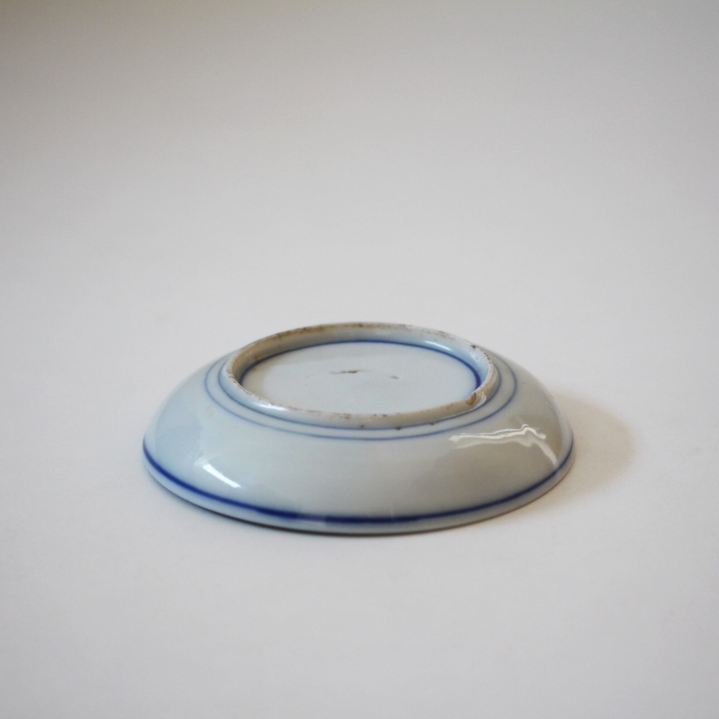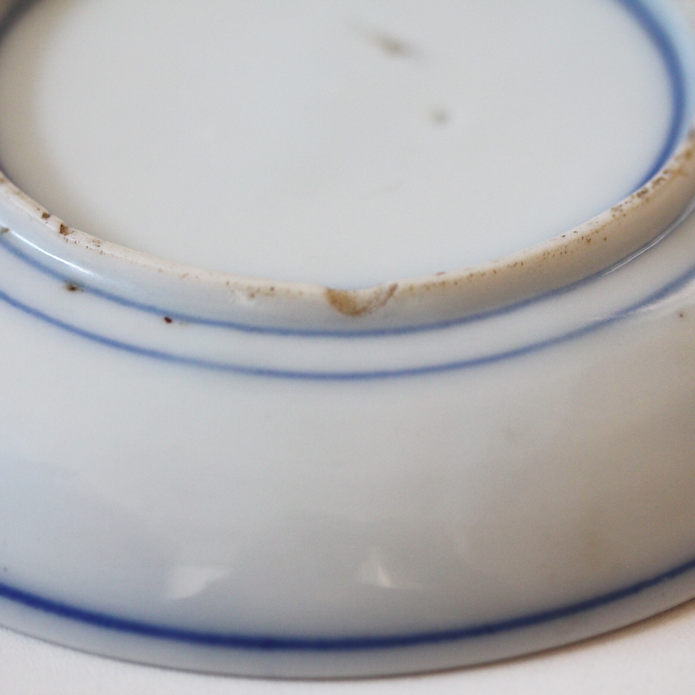 高台に欠けのある印判紅葉鹿人物文小皿(その1)d12.6cm Chipped Inban Dish with Printed Momiji Leaves, Deer and Figures 20th C | Broken and Repaired / キズトツクロイ