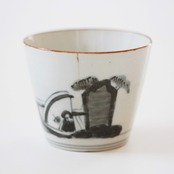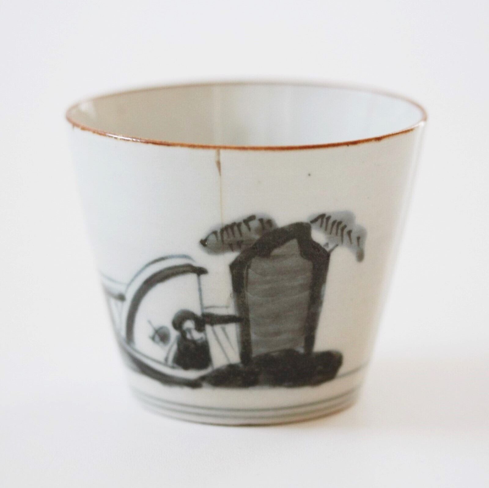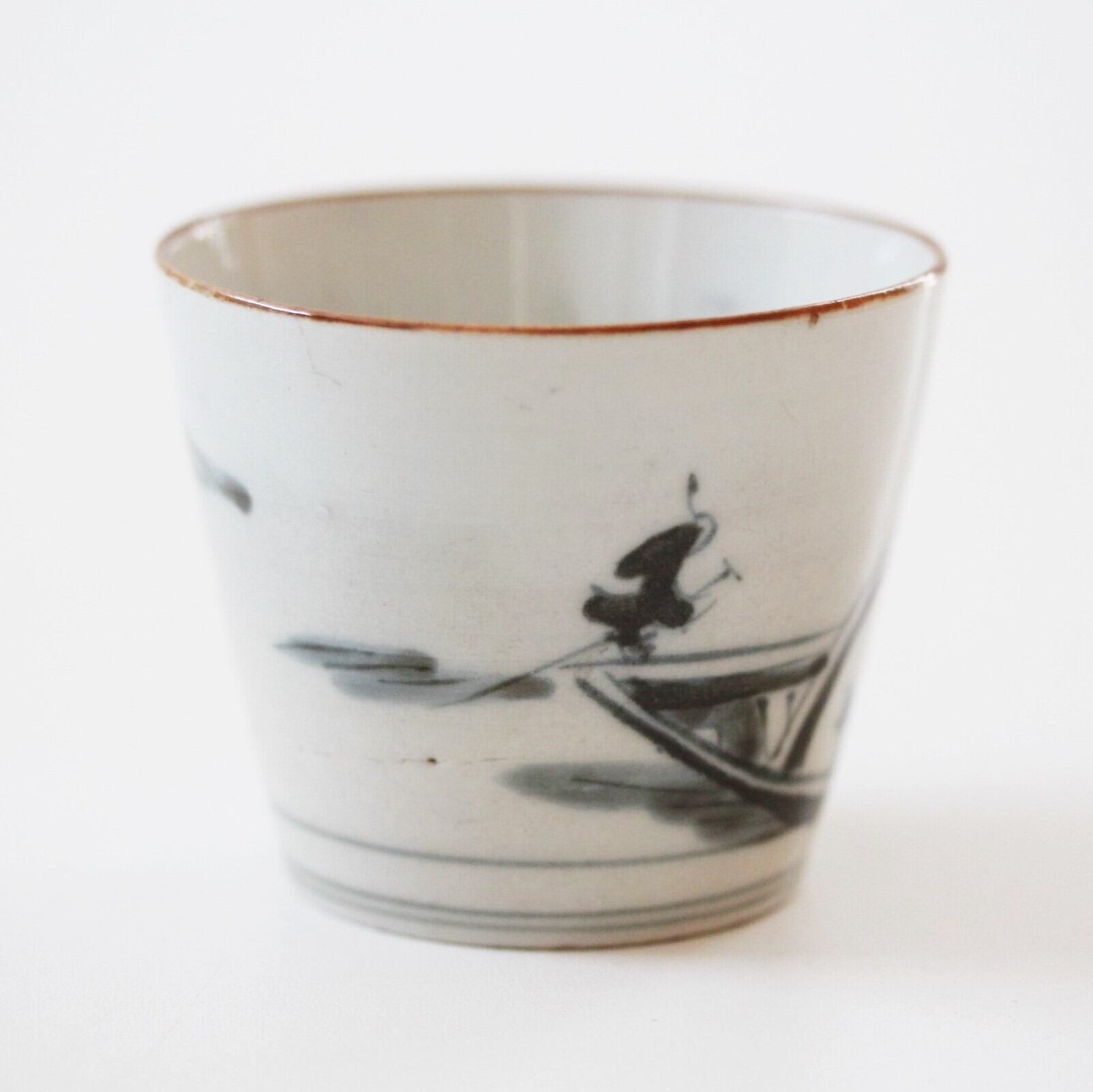割れのある古伊万里染付赤壁賦文猪口 d7.2cm Cracked Imari Blue and White Cup with Design of Ode to the Red Cliff 18th C | Broken and Repaired / キズトツクロイ