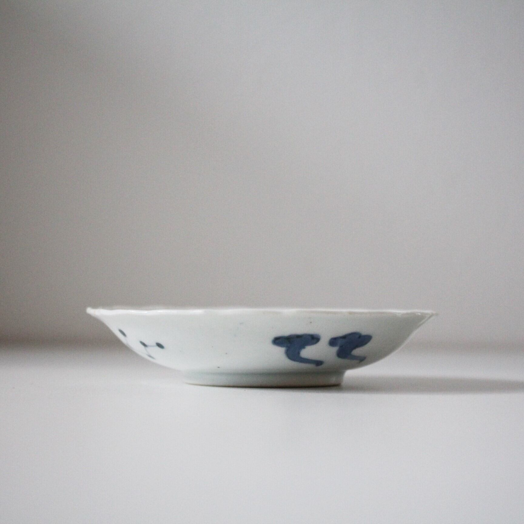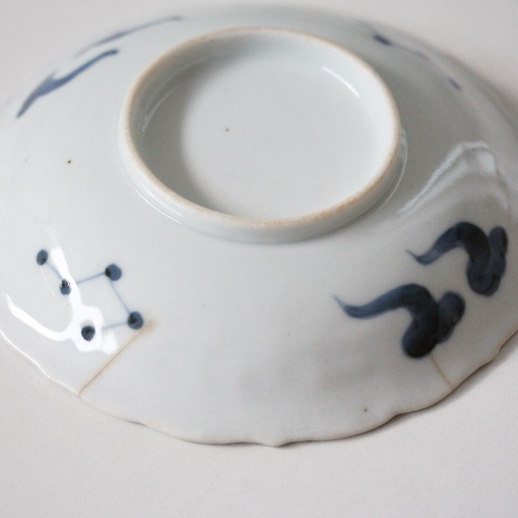 割れ欠けのある伊万里染付陽刻水鳥文輪花皿 d15.5cm Chipped and Cracked Imari Blue and White Lobed Dish, Waterfowls Design 19th-20th C | Broken and Repaired / キズトツクロイ