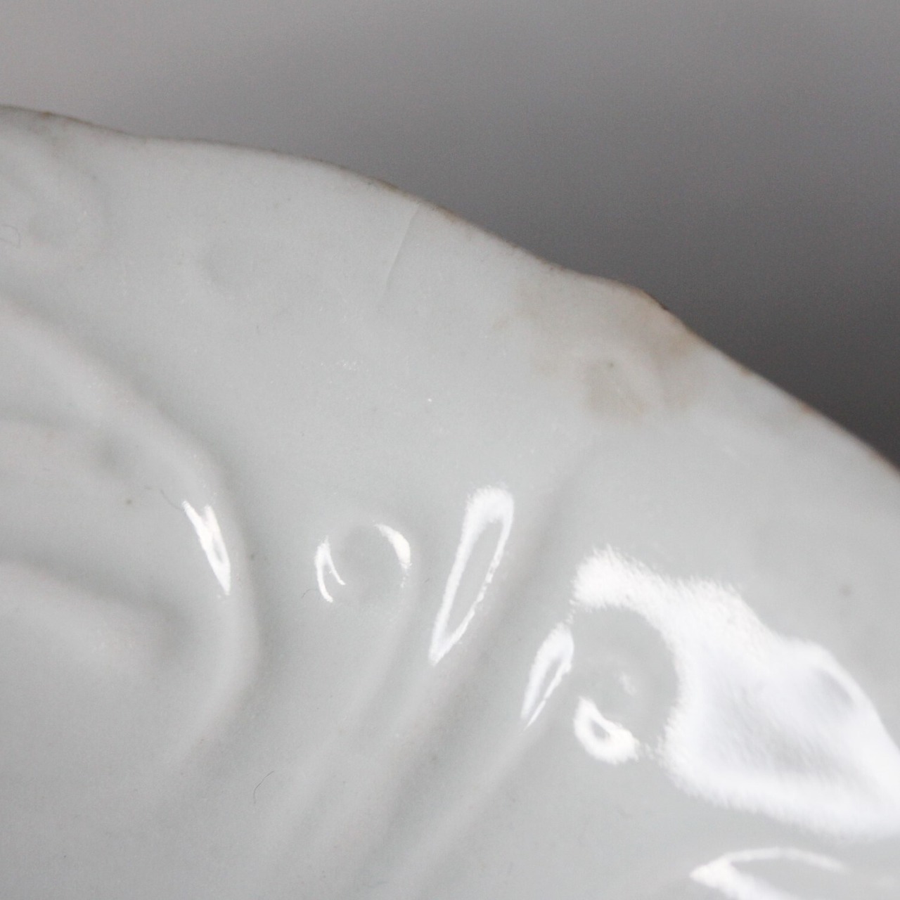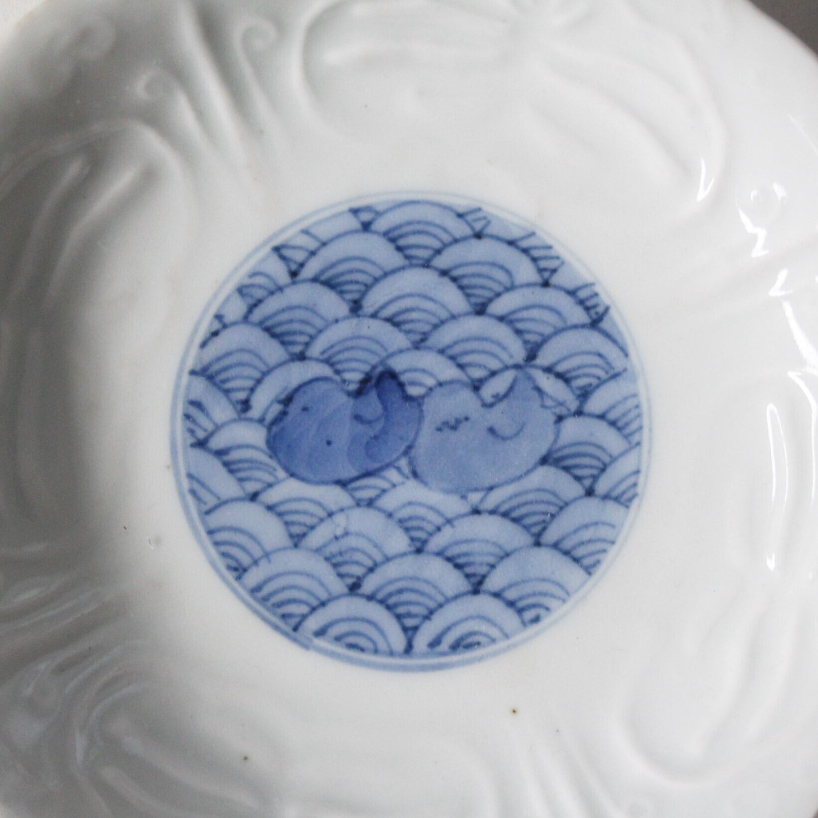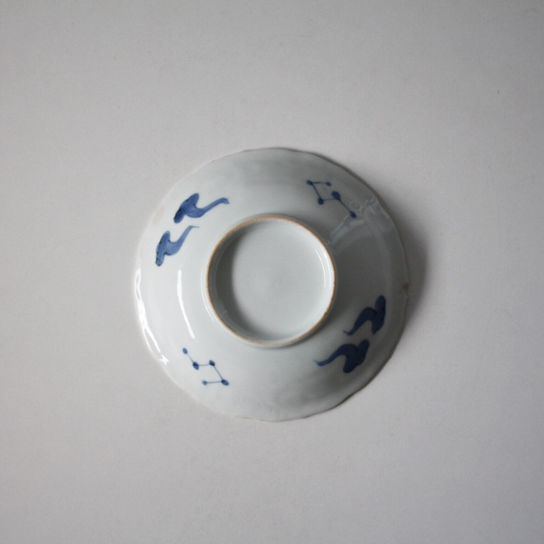 割れ欠けのある伊万里染付陽刻水鳥文輪花皿 d15.2cm Chipped and Cracked Imari Blue and White Lobed Dish, Waterfowls Design 19th-20th C | Broken and Repaired / キズトツクロイ