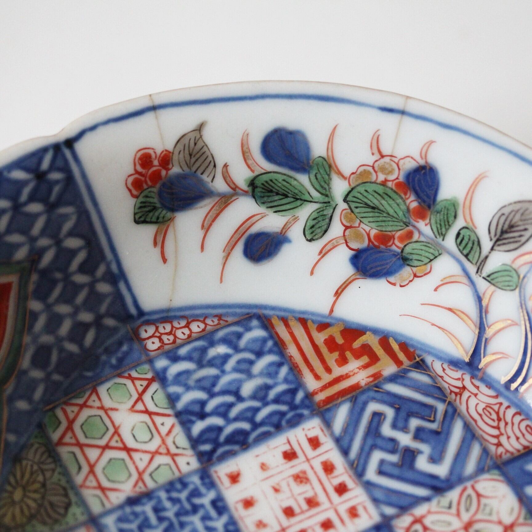 割れのある九谷色絵石畳文皿 d14.3cm Cracked Kutani Polychrome Dish, Checkered Pattern and Flowers Design 19th-20th C | Broken and Repaired / キズトツクロイ