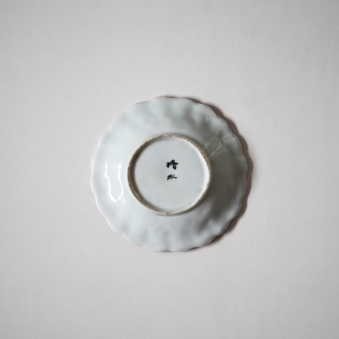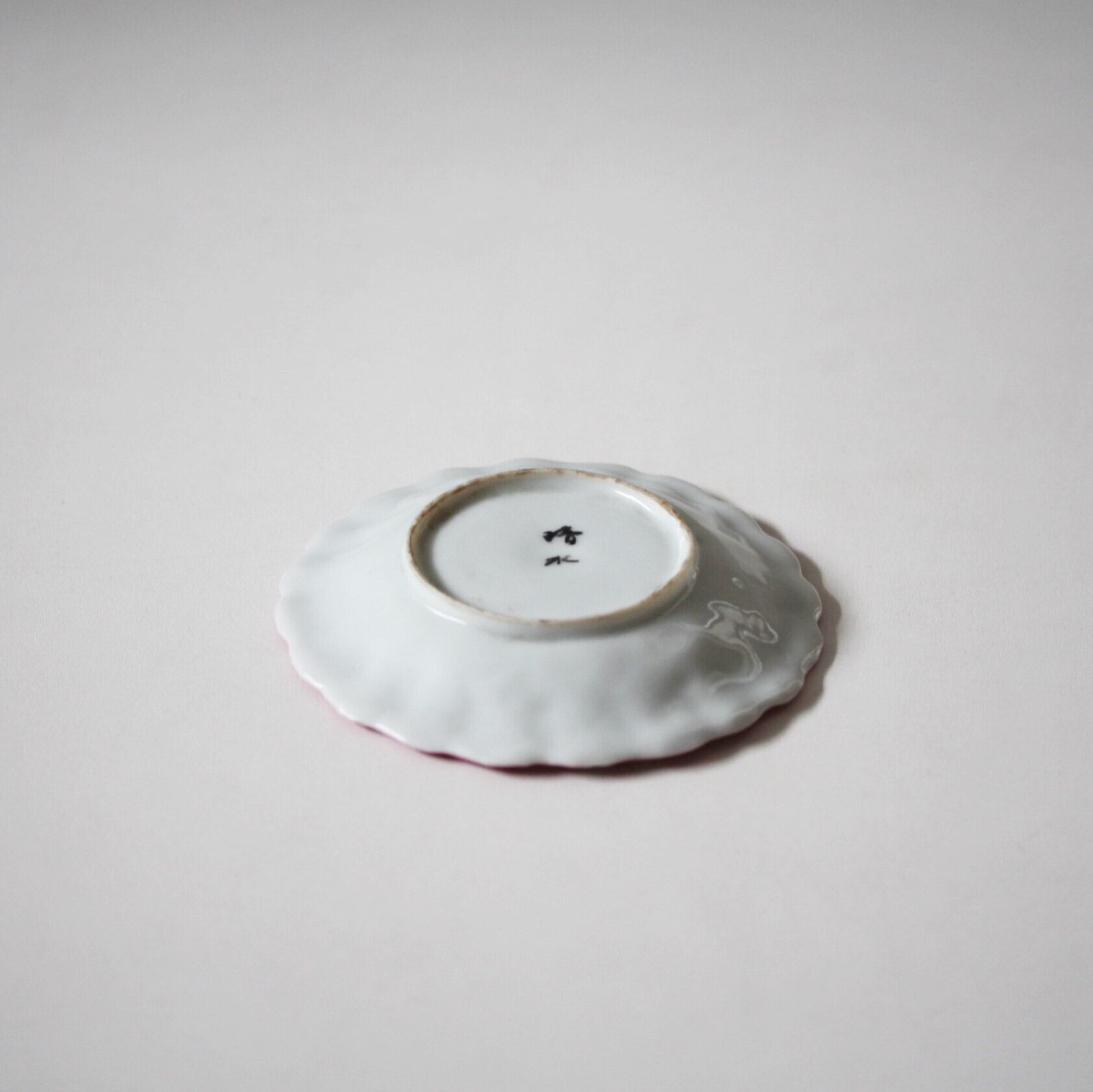 欠けのある清水焼色絵紅葉楓文捻形小皿 d12.3cm Chipped Kiyomizu Ware Enameled Small Lobed Dish, Fallen Leaves Design 20th C | Broken and Repaired / キズトツクロイ