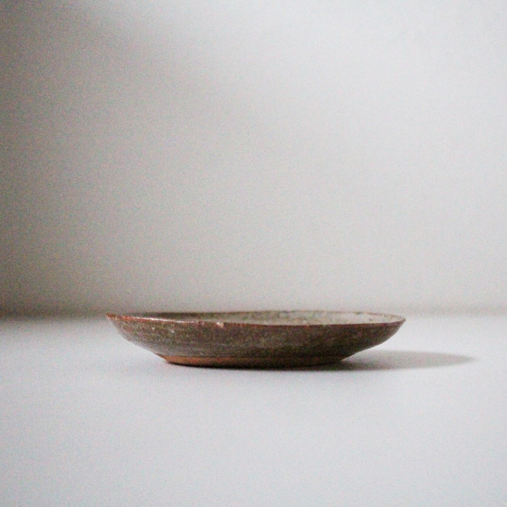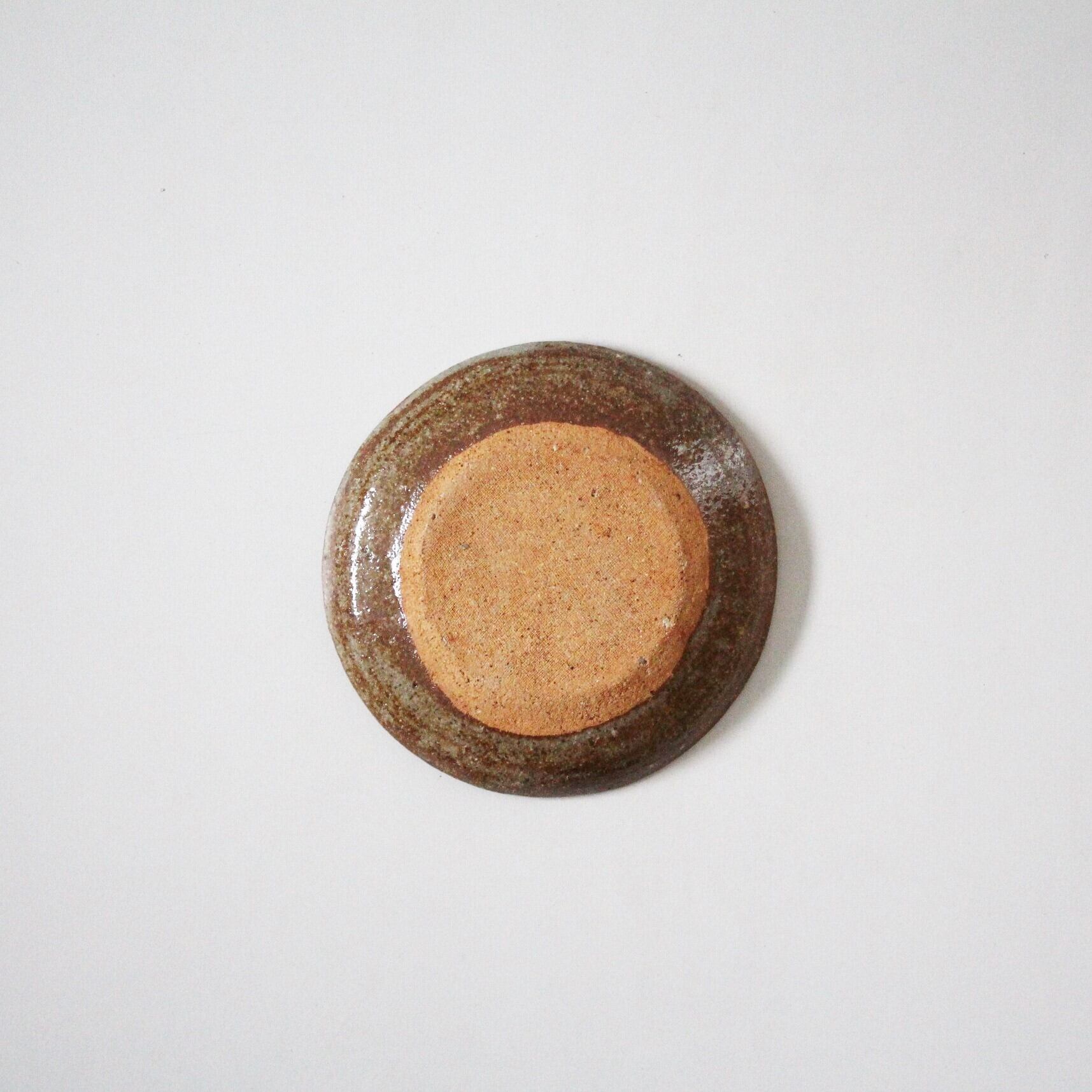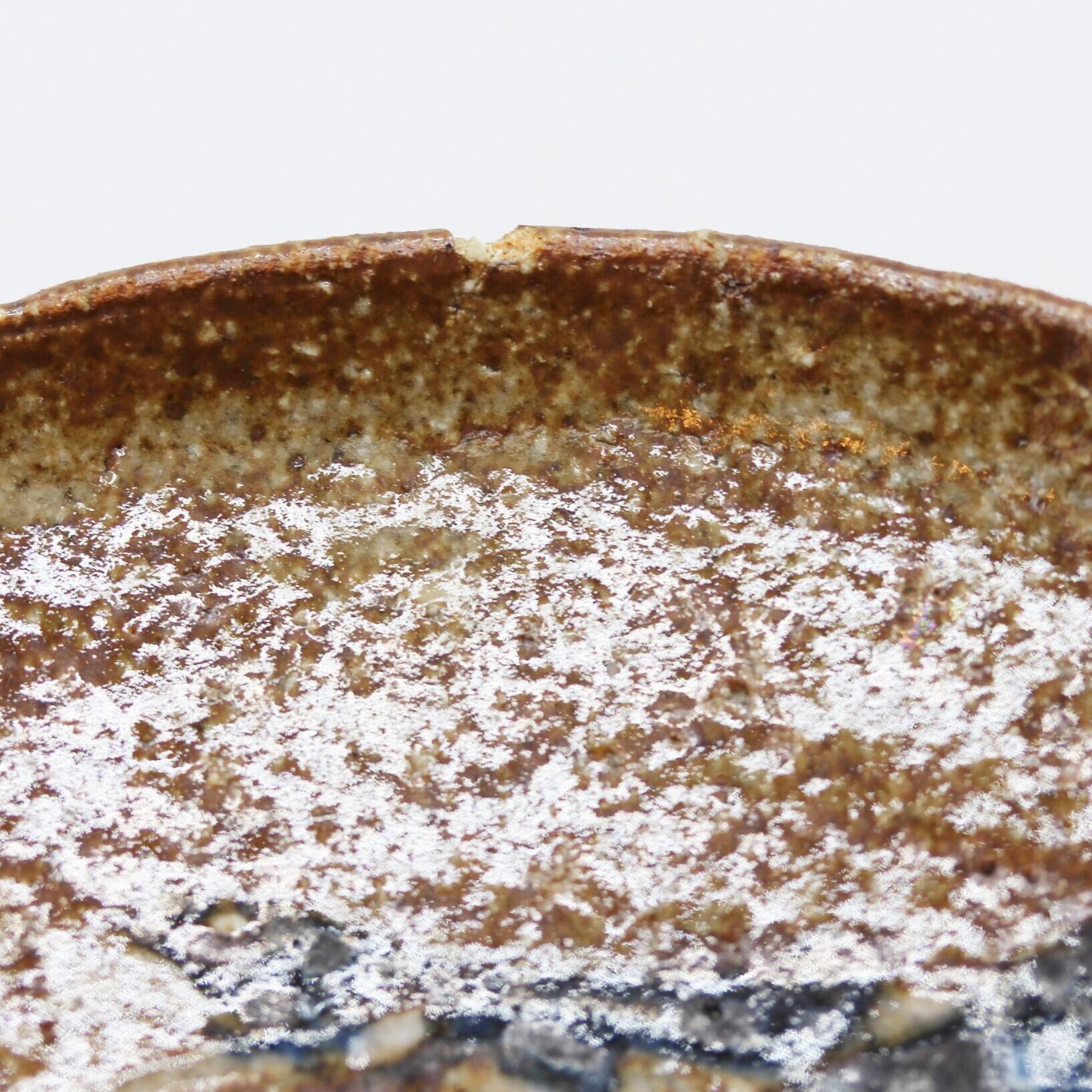 小さな欠けのある銹絵染付丸干し文土器皿 d13.8cm Minor Chipped Kawarake Dish, Design of Whole Dried Fish 20th C | Broken and Repaired / キズトツクロイ