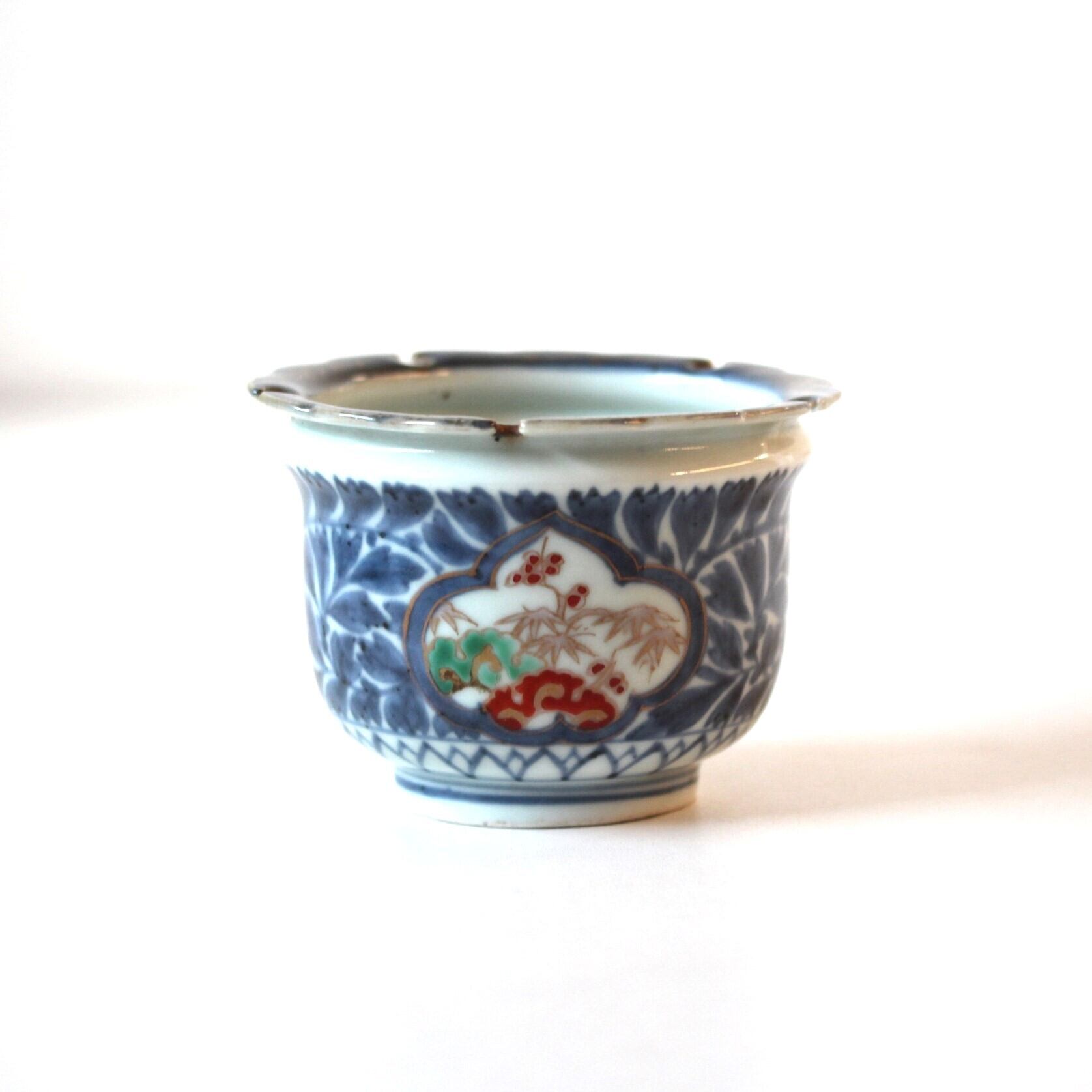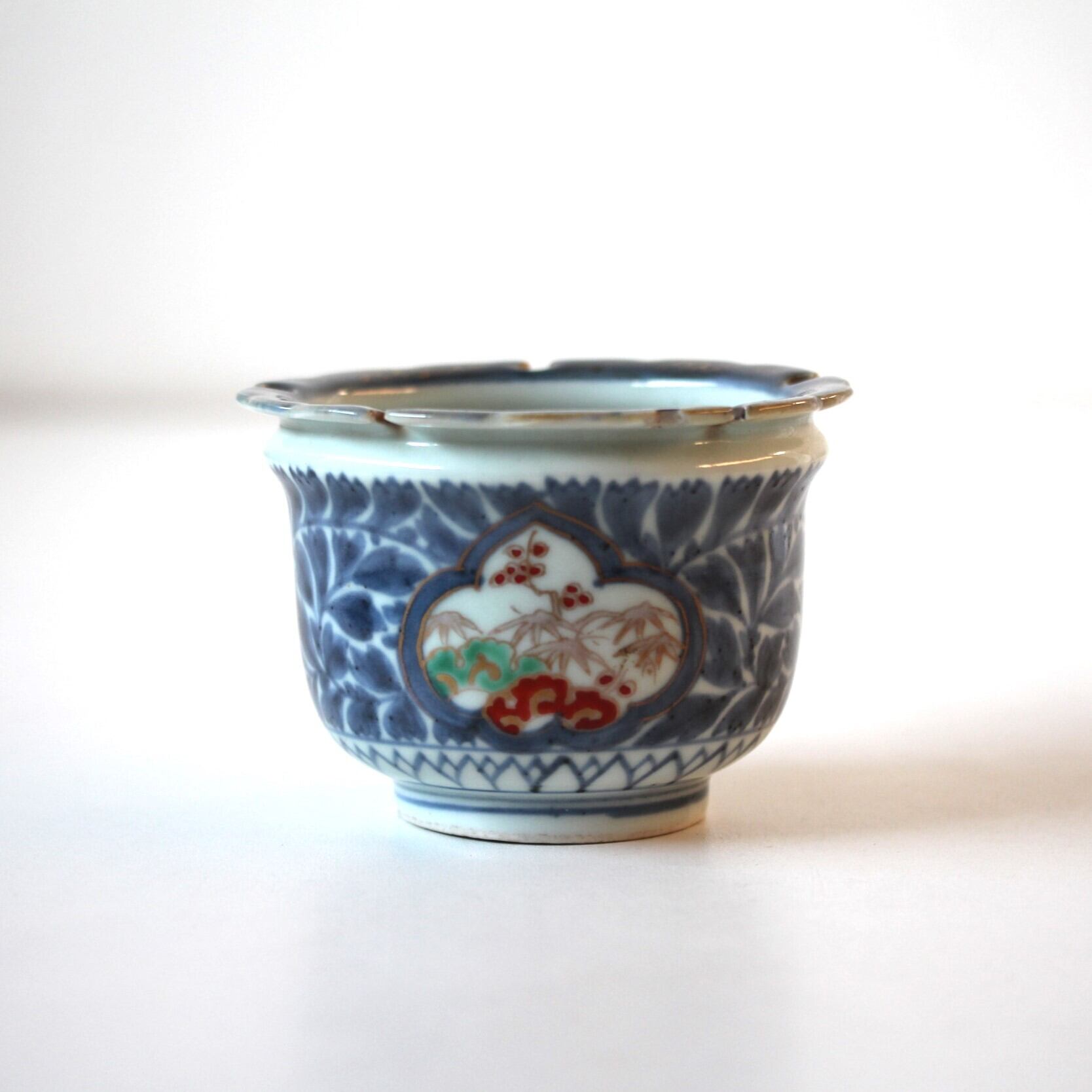 欠けのある古伊万里色絵松竹梅唐草文雪輪形向付 d10.7cm Chipped Imari Polychrome Snow Shaped Cup, Shochikubai and Scroll 18th C | Broken and Repaired / キズトツクロイ