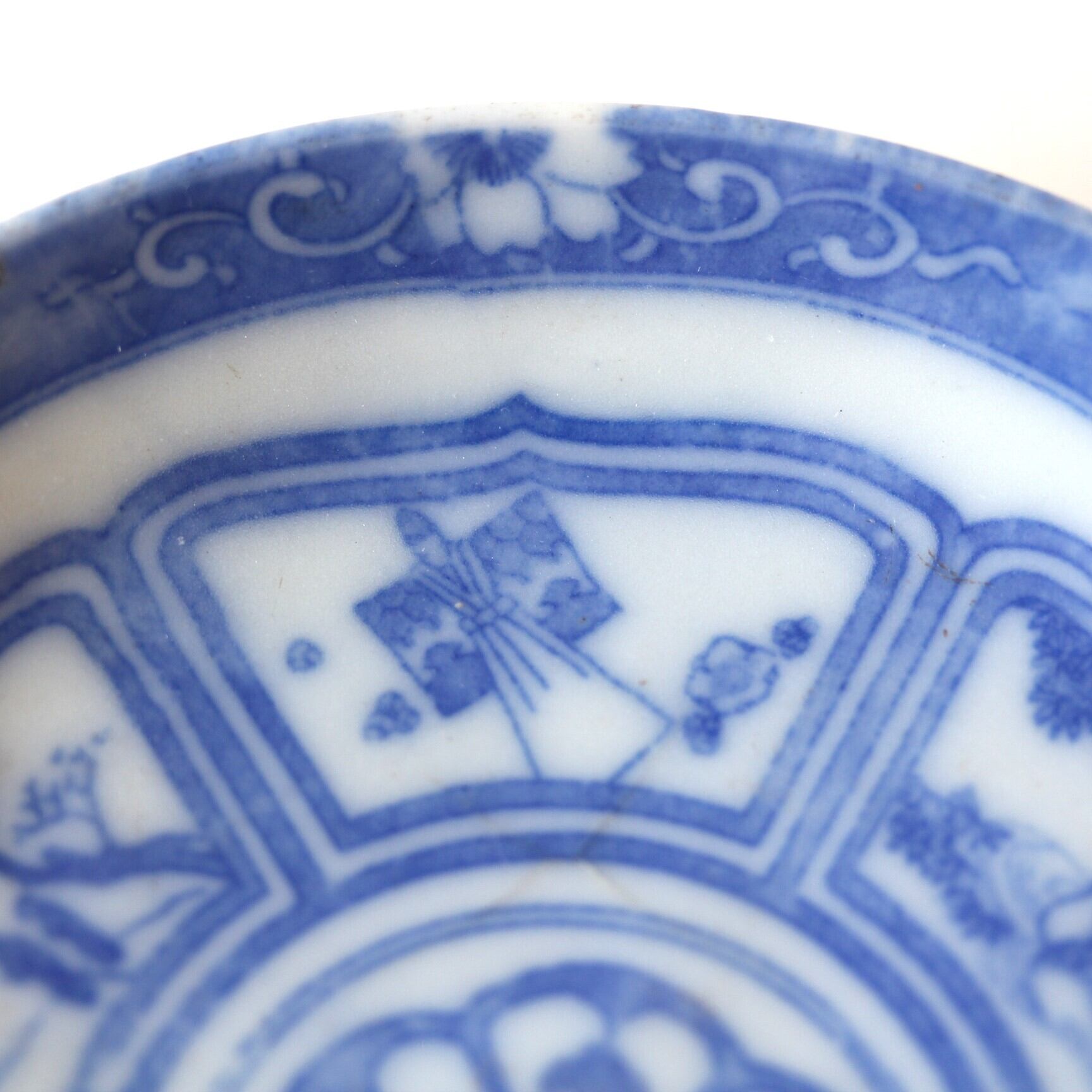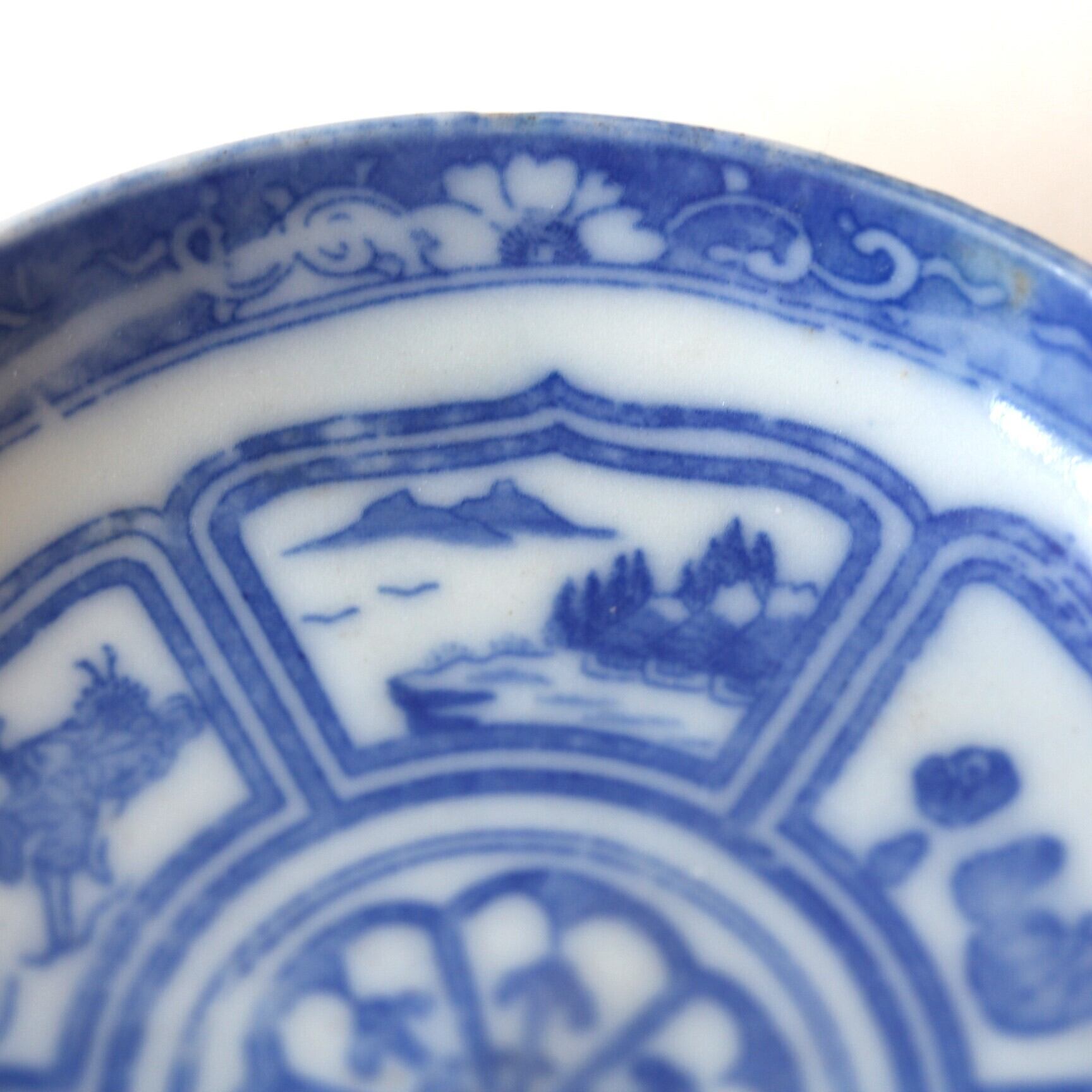 欠けのある印判小皿(桜花・立雛他)(その1)d10.7cm Chipped Inban Blue and White Small Dish, Printed Design of Sakura Cherry Blossoms and Hina Doll 19th-20th C | Broken and Repaired / キズトツクロイ