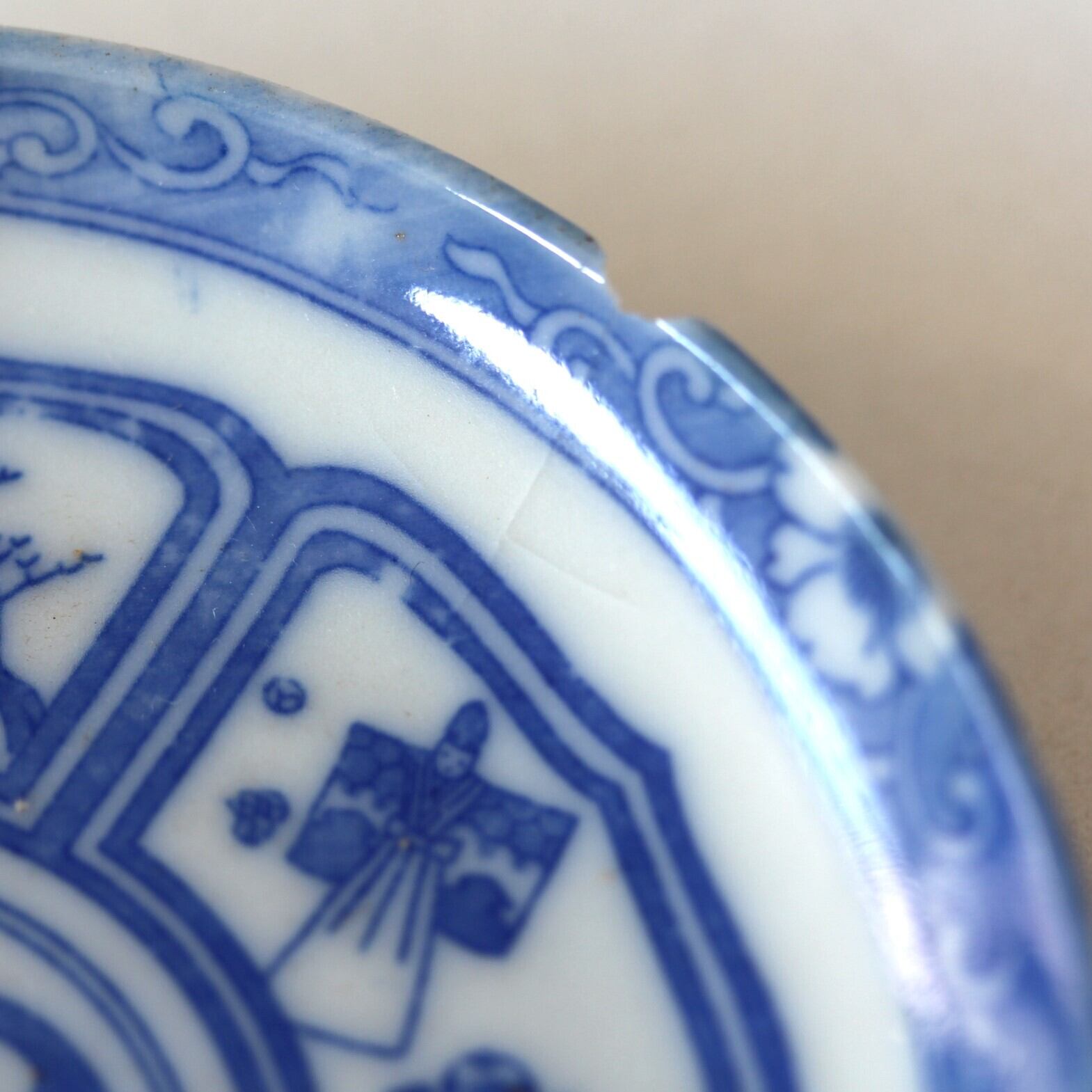 割れ欠けのある印判小皿(桜花・立雛他)(その1)d11.0cm Chipped and Cracked Inban Blue and White Small Dish, Printed Design of Sakura Cherry Blossoms and Hina Doll 19th-20th C | Broken and Repaired / キズトツクロイ