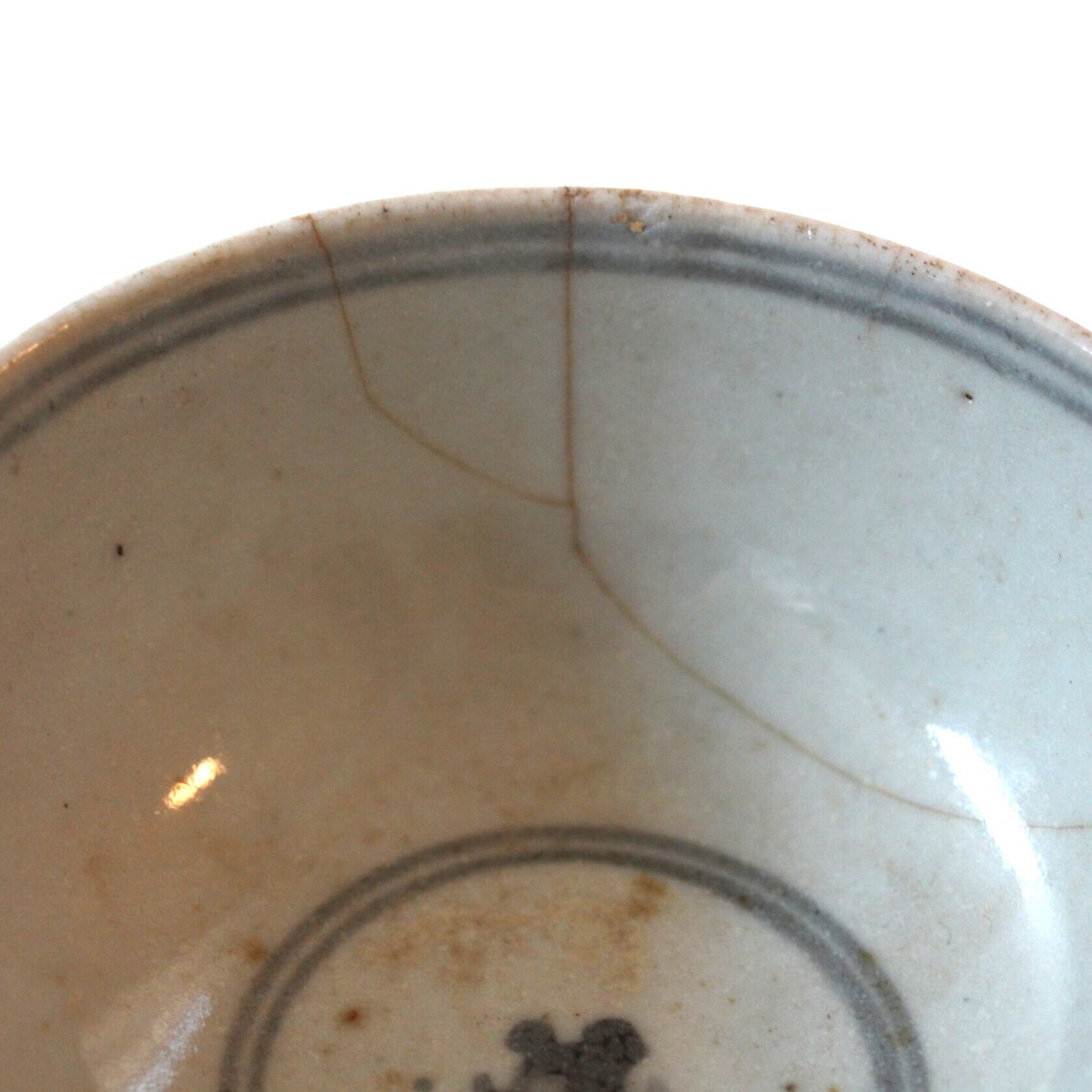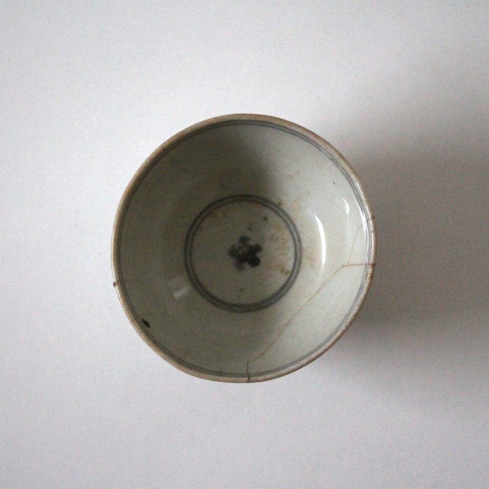 割れのある古伊万里染付丸文碗 d11.8cm Cracked Imari Blue and White Bowl, Circles Pattern 18th C | Broken and Repaired / キズトツクロイ