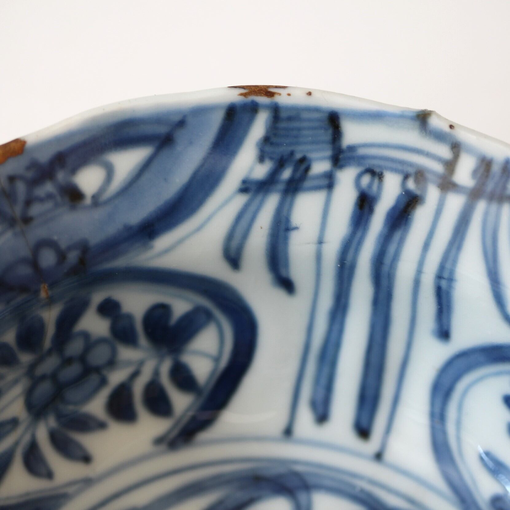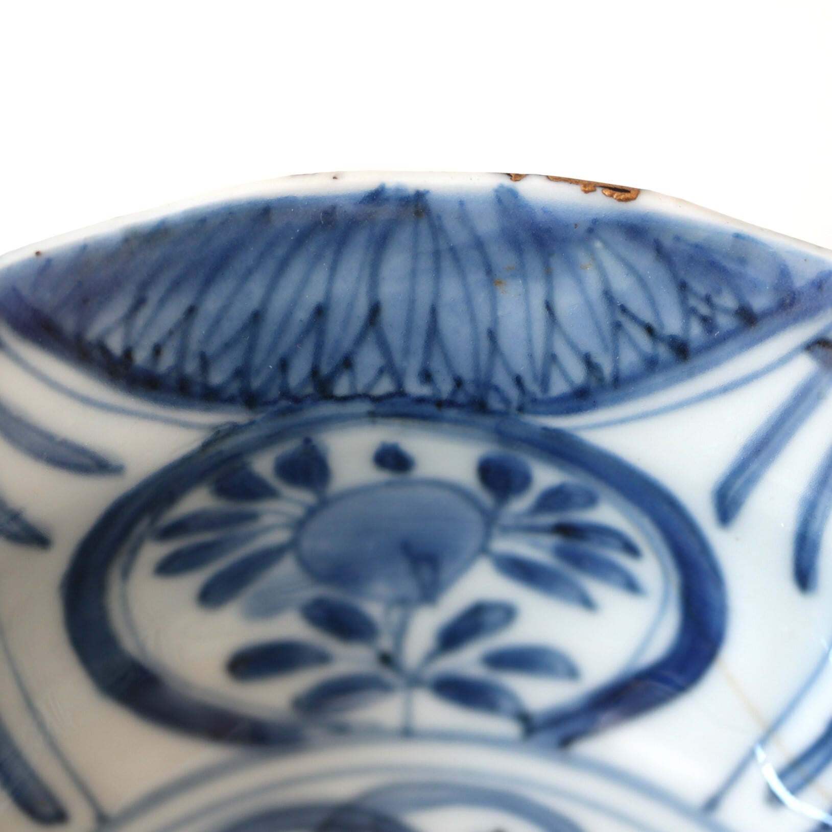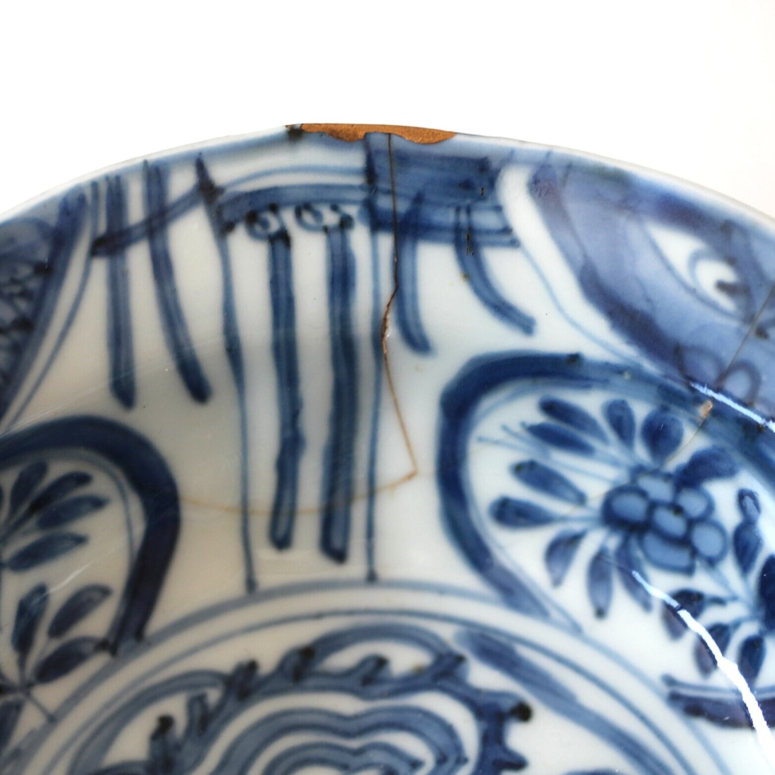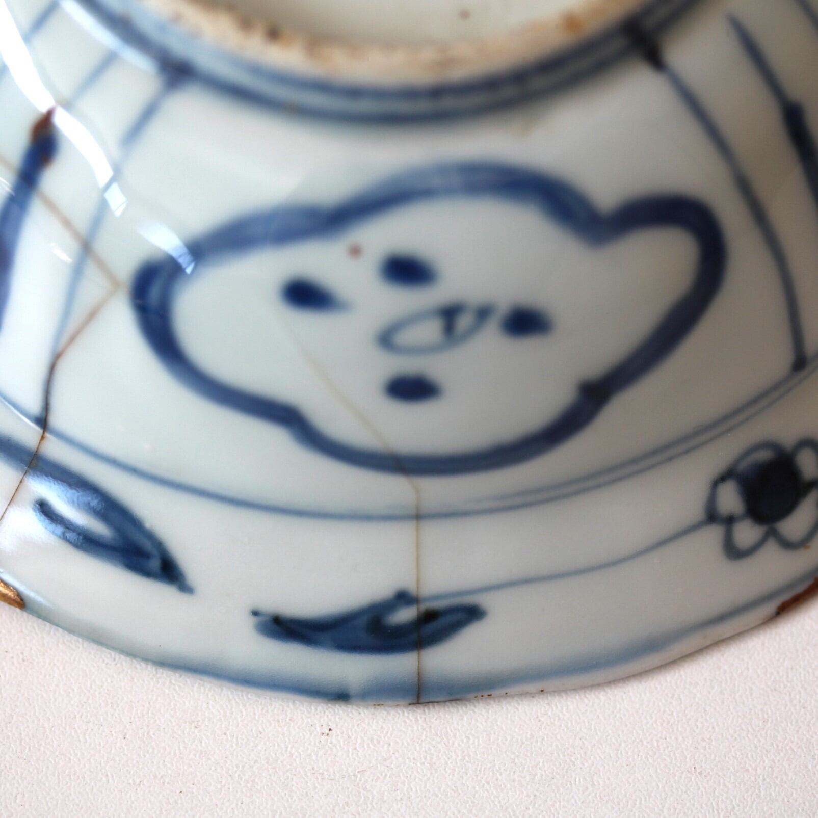 金繕いのある古染付宝尽文兜鉢 d14.7cm Kintsugi Repaired Kosometsuke Type Blue and White Klapmuts Bowl, Design of Treasures 17th C | Broken and Repaired / キズトツクロイ