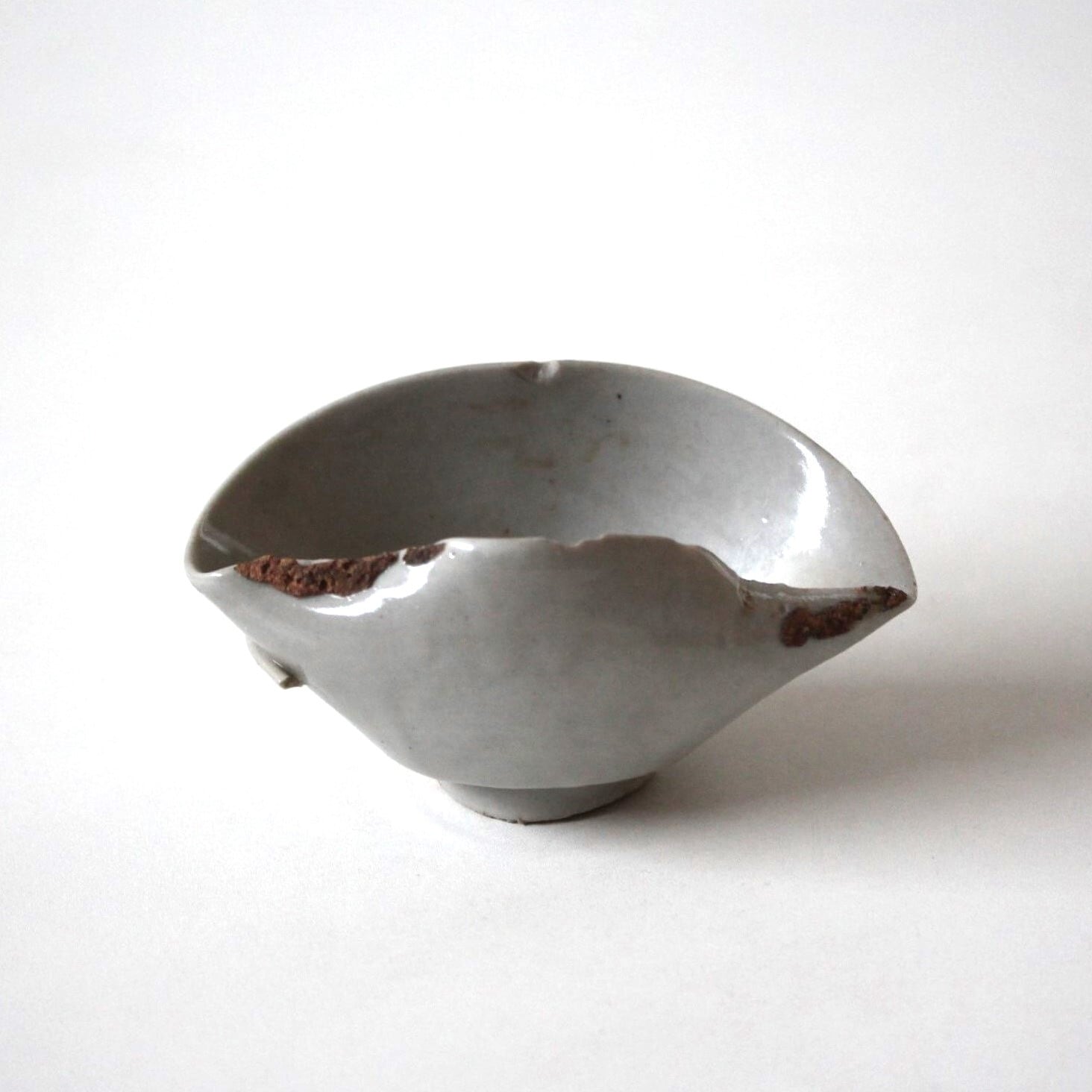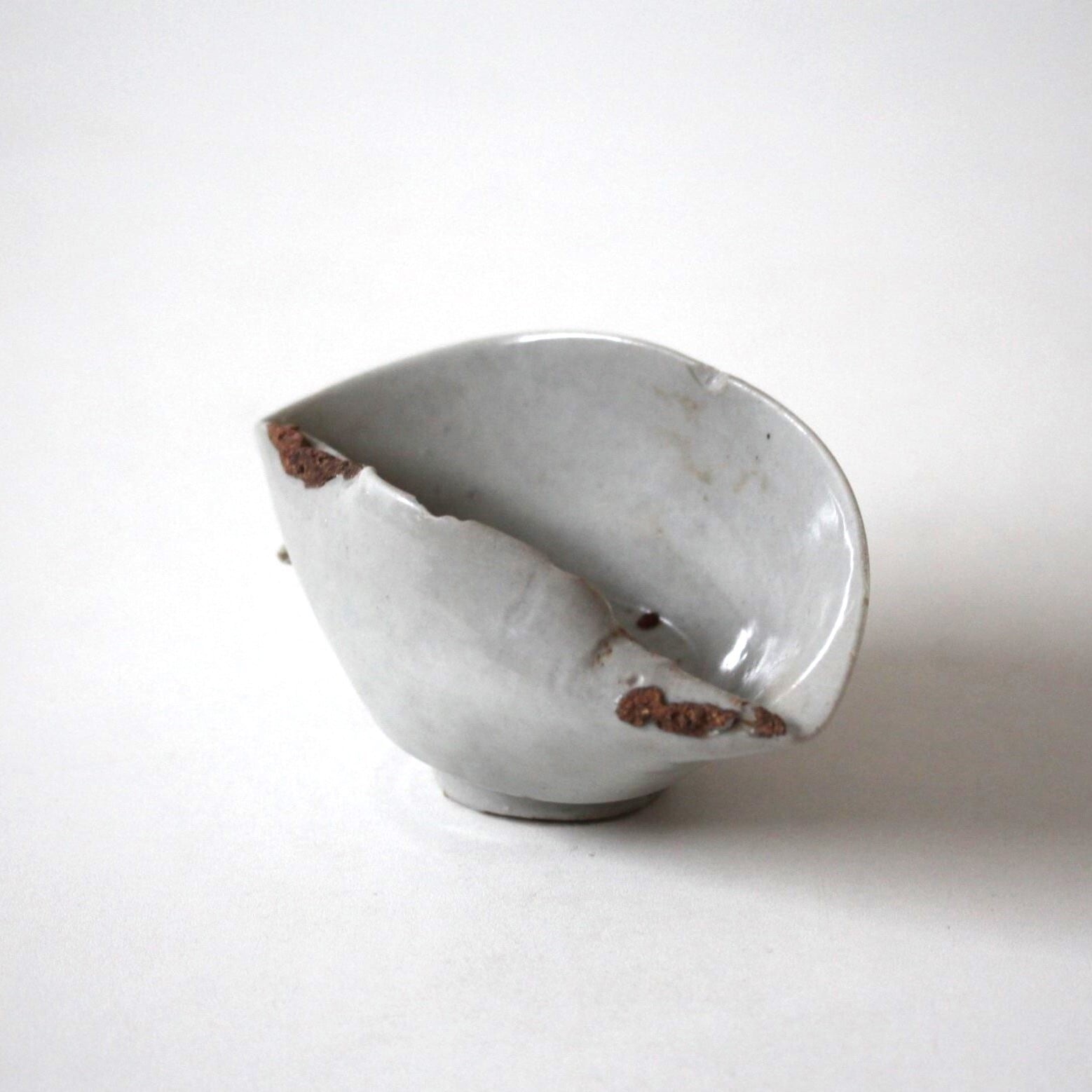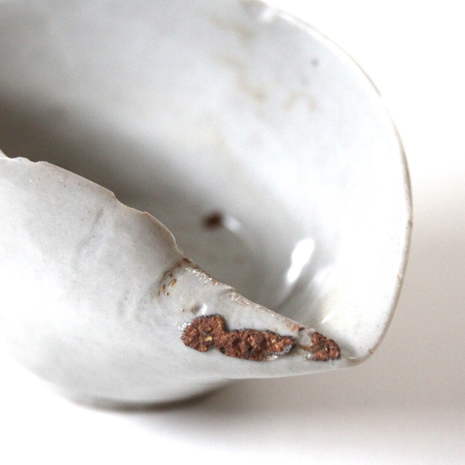 波佐見の白磁の碗は、窯の中で豪快に歪んで片口としても使えそうな形状に。