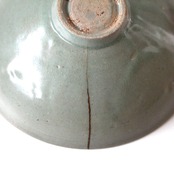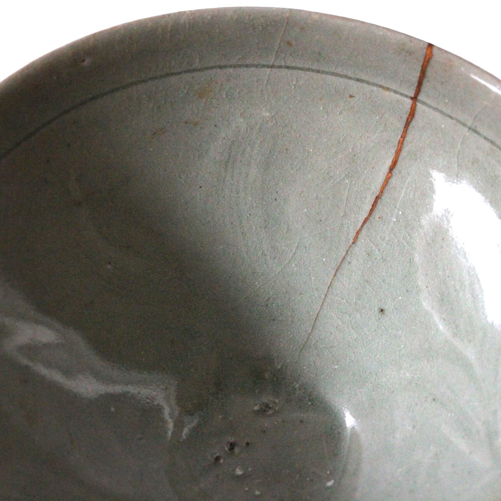 真鍮繕いのある高麗青磁陽刻牡丹文鉢 d19.0cm Brass Repaired Celadon Bowl, Engraved Peony Design 12th C