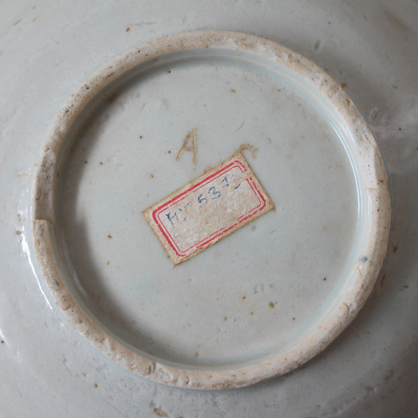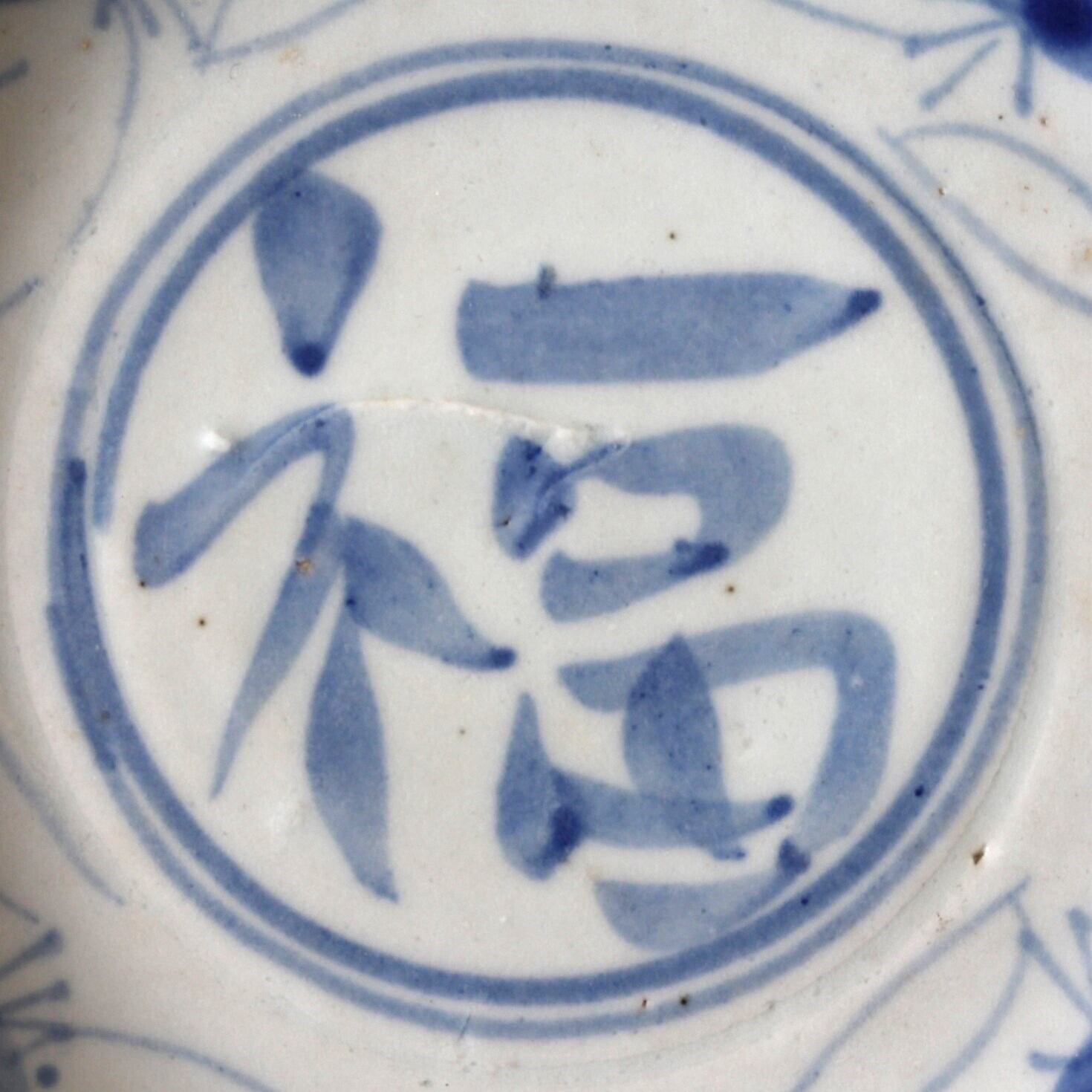 高台に欠けのある染付蟹福字文皿 d16.3cm Chipped Blue and White Dish, Design of Crabs and Fuku Character 18th-19th C | Broken and Repaired / キズトツクロイ