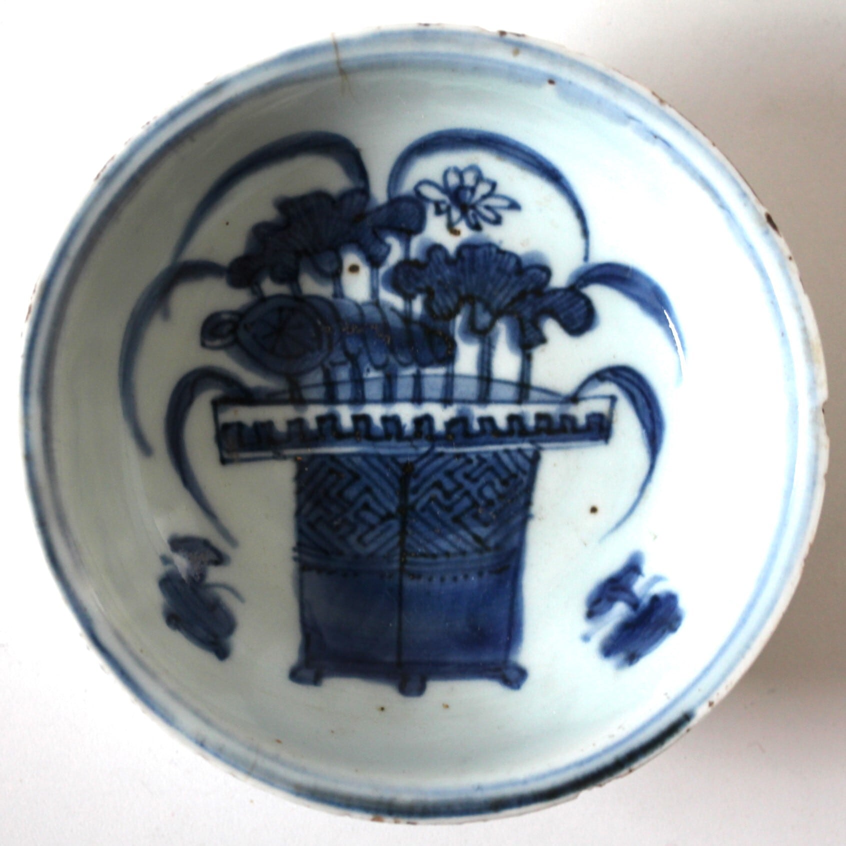 小さな割れ欠けのある古染付蓮鉢文深皿 d14.4cm Minor Chipped and Cracked Kosometsuke Blue and White Bowl, Design of Lotus Basin 17th C | Broken and Repaired / キズトツクロイ