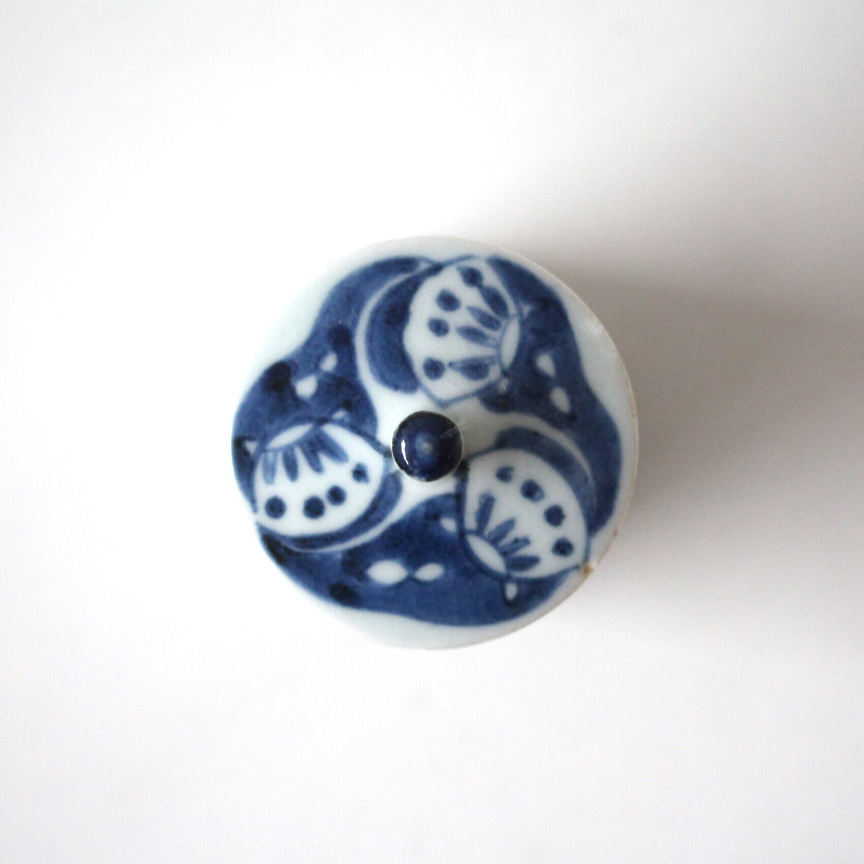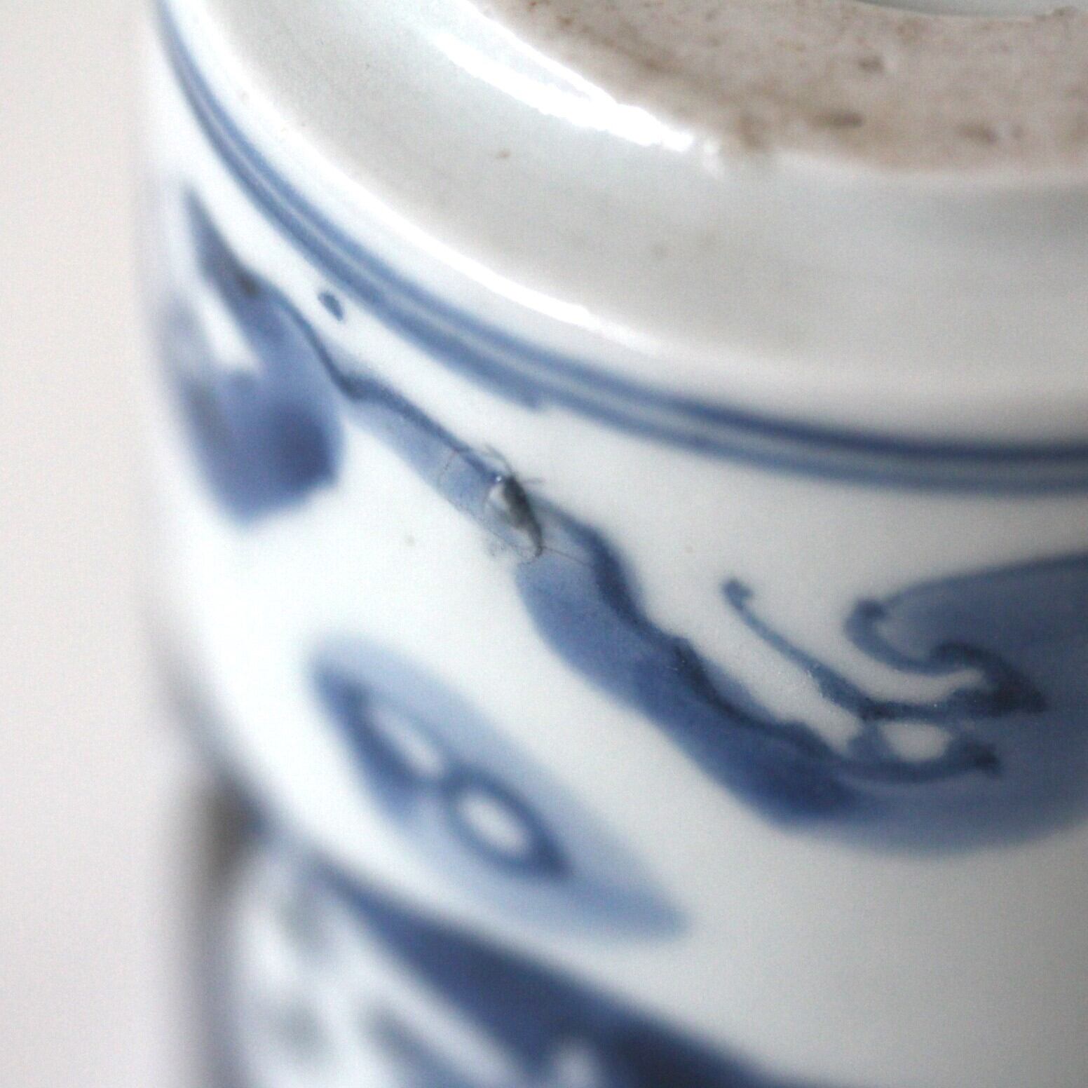 小さな欠けのある古伊万里染付貝文蓋付筒形容器 d6.4cm Minor Chipped Imari Blue and White Covered Cup, Clams Design 18th-19th C | Broken and Repaired / キズトツクロイ