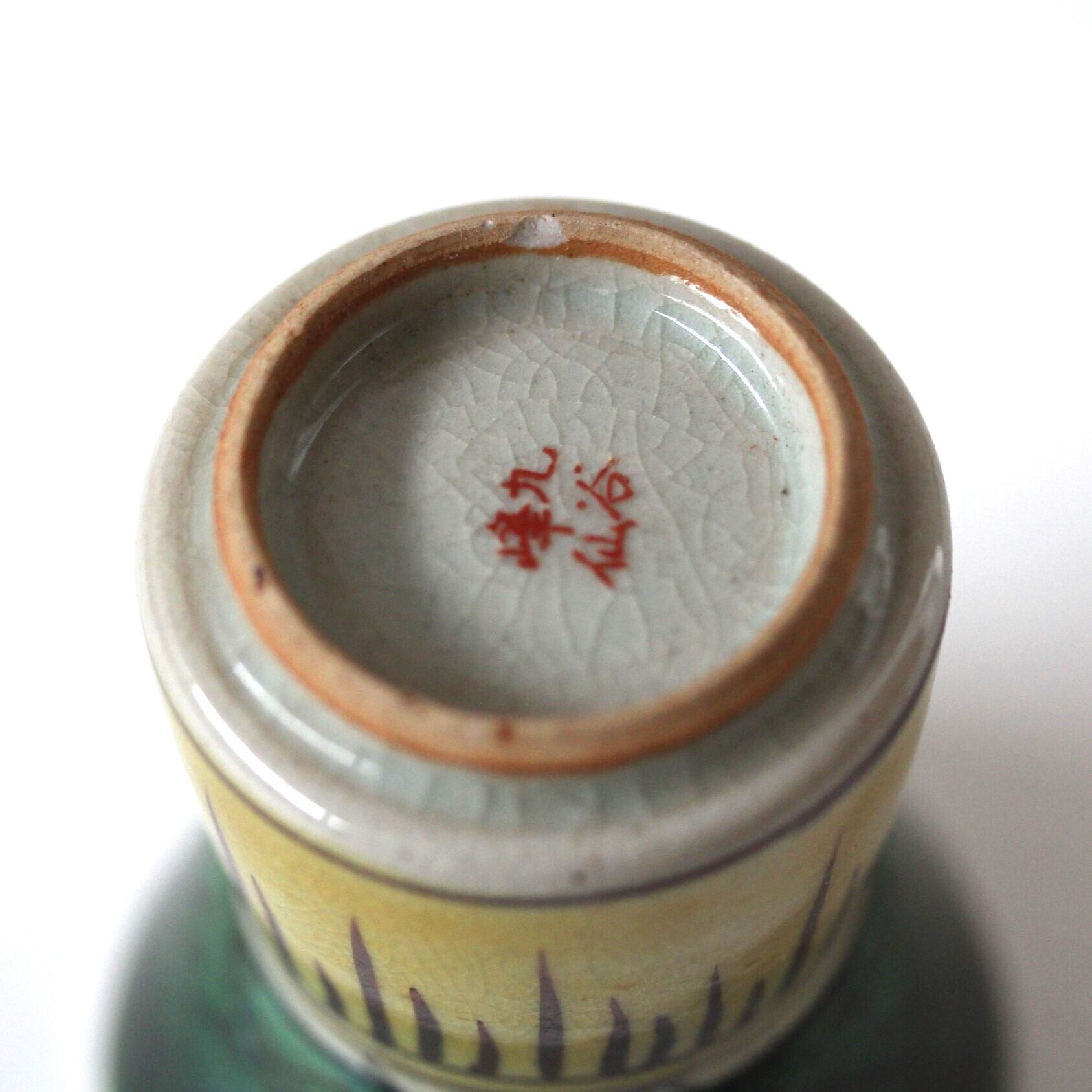 高台に小さな欠けのある九谷松葉文猪口 d6.3cm Chipped Kutani Enameled Cup, Design of Matsuba Pine Needles 20th C | Broken and Repaired / キズトツクロイ