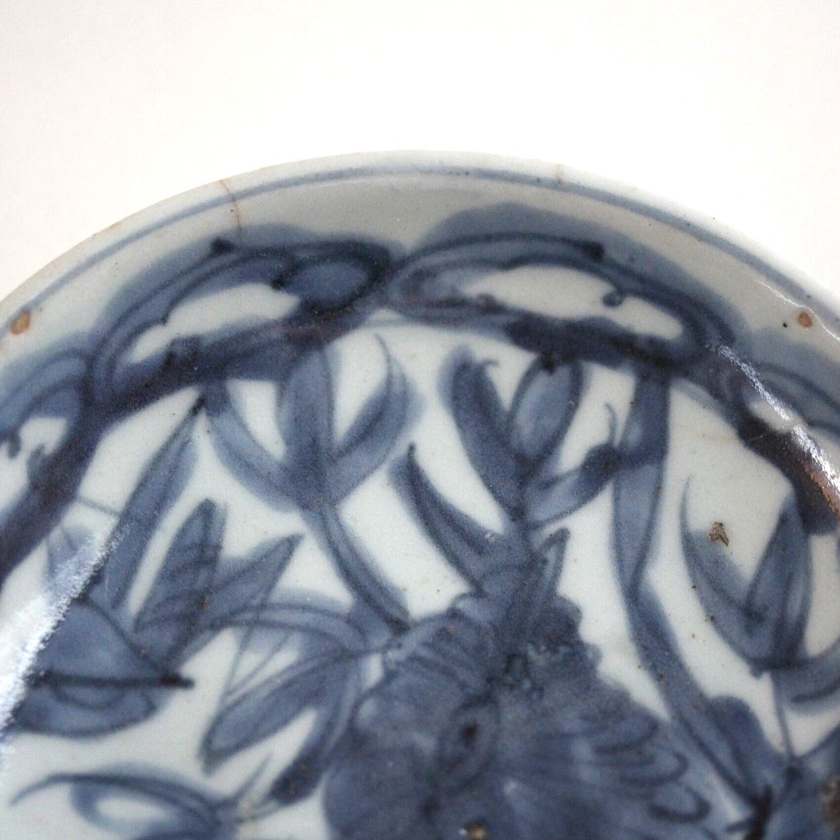 A charming blue and white porcelain small dish made in Arita, called Shoki-Imari or Early Imari. Design of a grasshopper on a peony flower, which seems to be influenced by Chinese late Ming porcelain.